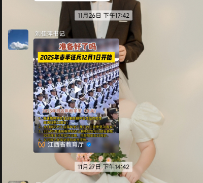 在外国语学院党政的统一部署下,外国语学院学工办组织辅导员,通过下寝和线上宣传等形式,积极宣讲2025年征兵工作安排、应征入伍程序和登记流程。其中,以毕业生为重点,着重宣讲国家相关政策,鼓励2025届毕业生投身军旅,矢志报国,以青春之力铸就国家“钢铁长城”,为国家与国防安全做出自己的贡献。
