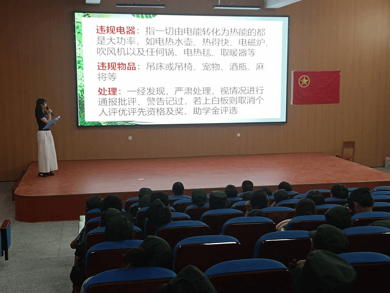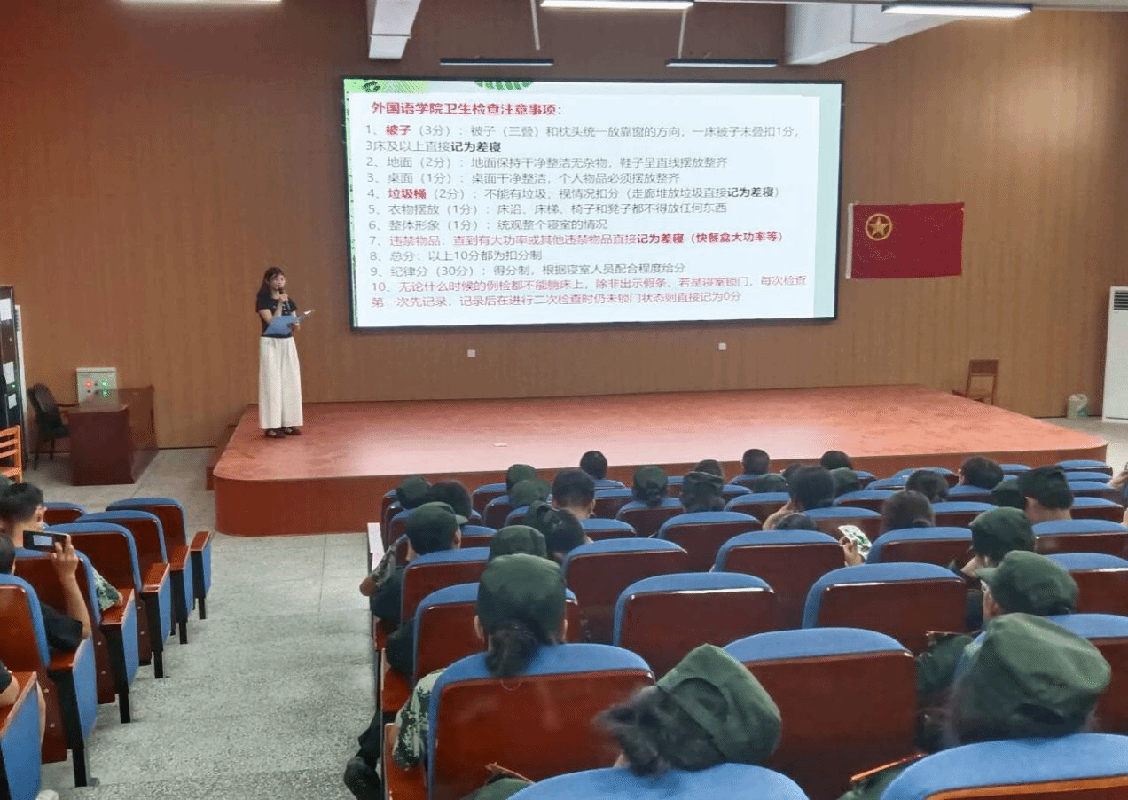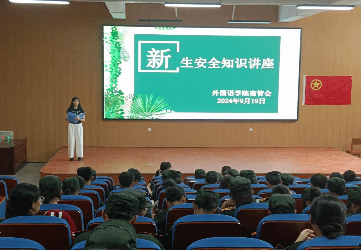 为了更好的加强新生的安全教育、提升新生的安全防范意识和自我保护能力、以及让新生对寝室卫生要求有着更全面的了解,2024年9月19日中午12点30分,外国语学院宿管会于跬步楼1115教室开展新生安全知识讲座。莅临本次讲座的嘉宾有外国语学院党委书记刘佳萍、党委副书记曹金萍、宿管会主任高伟琳、校宿管副主任罗东鑫以及24级全体新生。