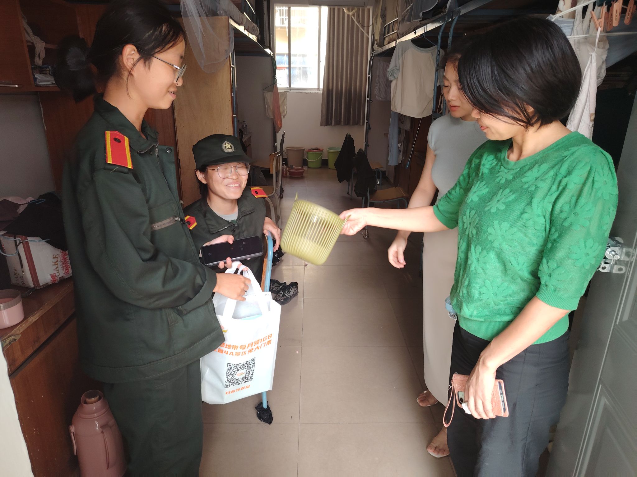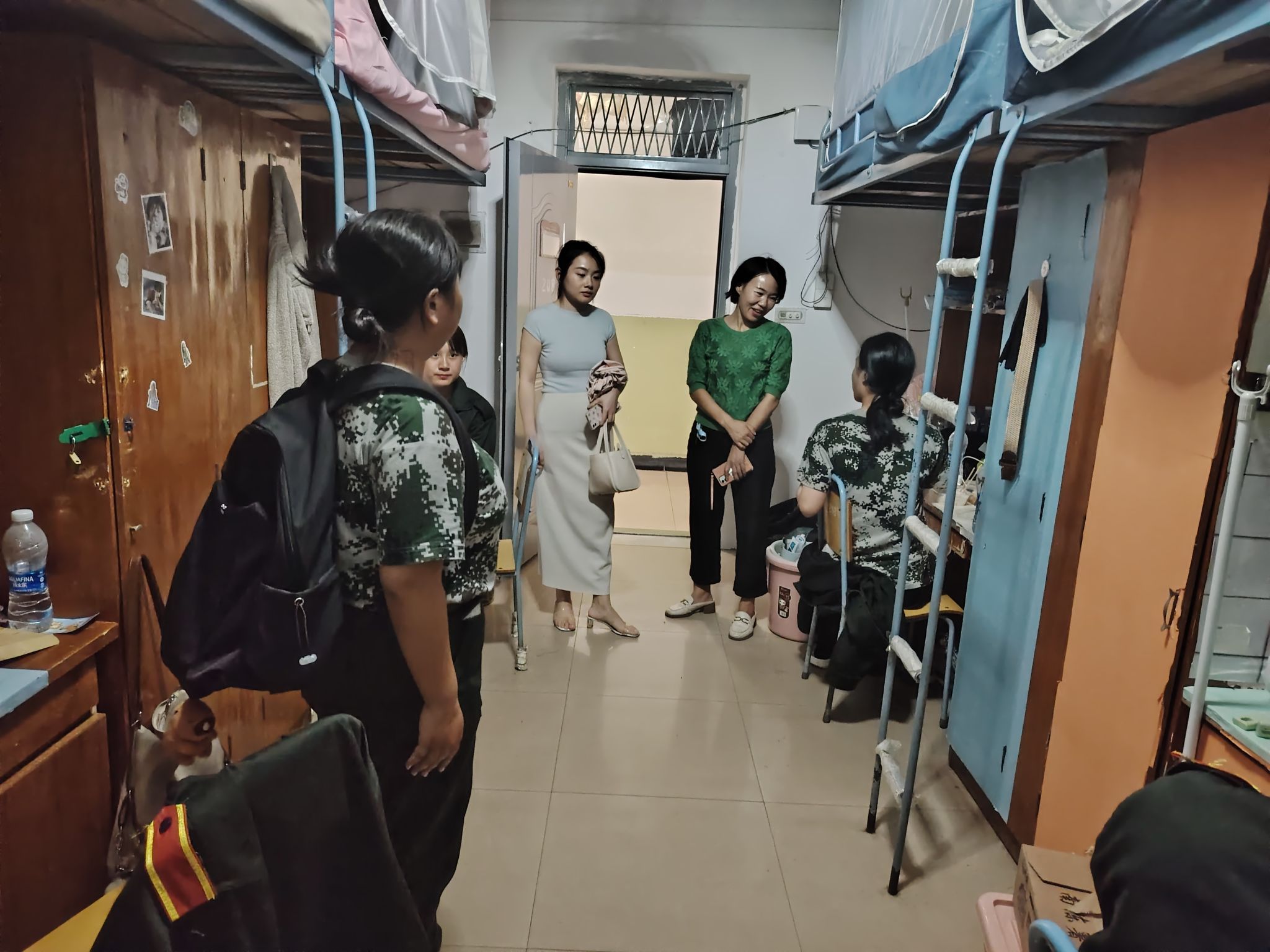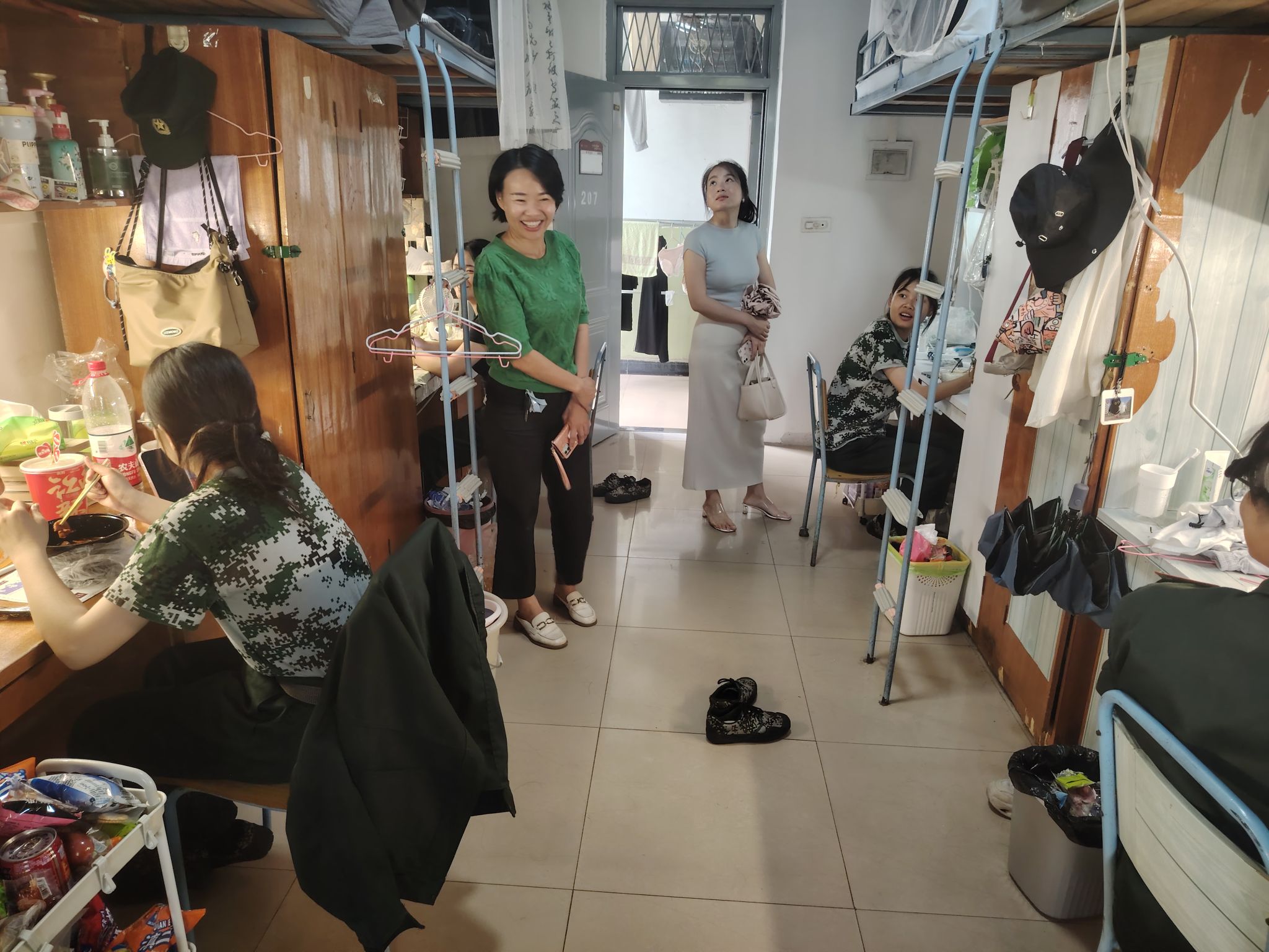 宿舍是新生们大学生活的起点,为他们提供一个温馨如家的环境是外国语学院的职责所在,老师们对每一间宿舍的床铺、桌面、地面、卫生间等进行了全方位检查。检查发现,大部分宿舍地面干净整洁,物品摆放有序,房间通风良好,体现了同学们对生活品质的追求。对存在的问题,也提出了具体的整改意见,并鼓励同学们积极参与,共同营造一个美好的居住环境。老师们在每一个宿舍细致检查了电器使用情况和电线安全,特别强调了安全的重要性,提醒同学们不使用违规电器,确保用电安全。同时,对宿舍的门窗等设施应经常检查,以确保人身和财产安全。卫生检查过程中,曹书记也对处在军训尾声的新生们进行鼓励,希望他们能坚持到最后一刻,为此次军训画上一个圆满的句号。