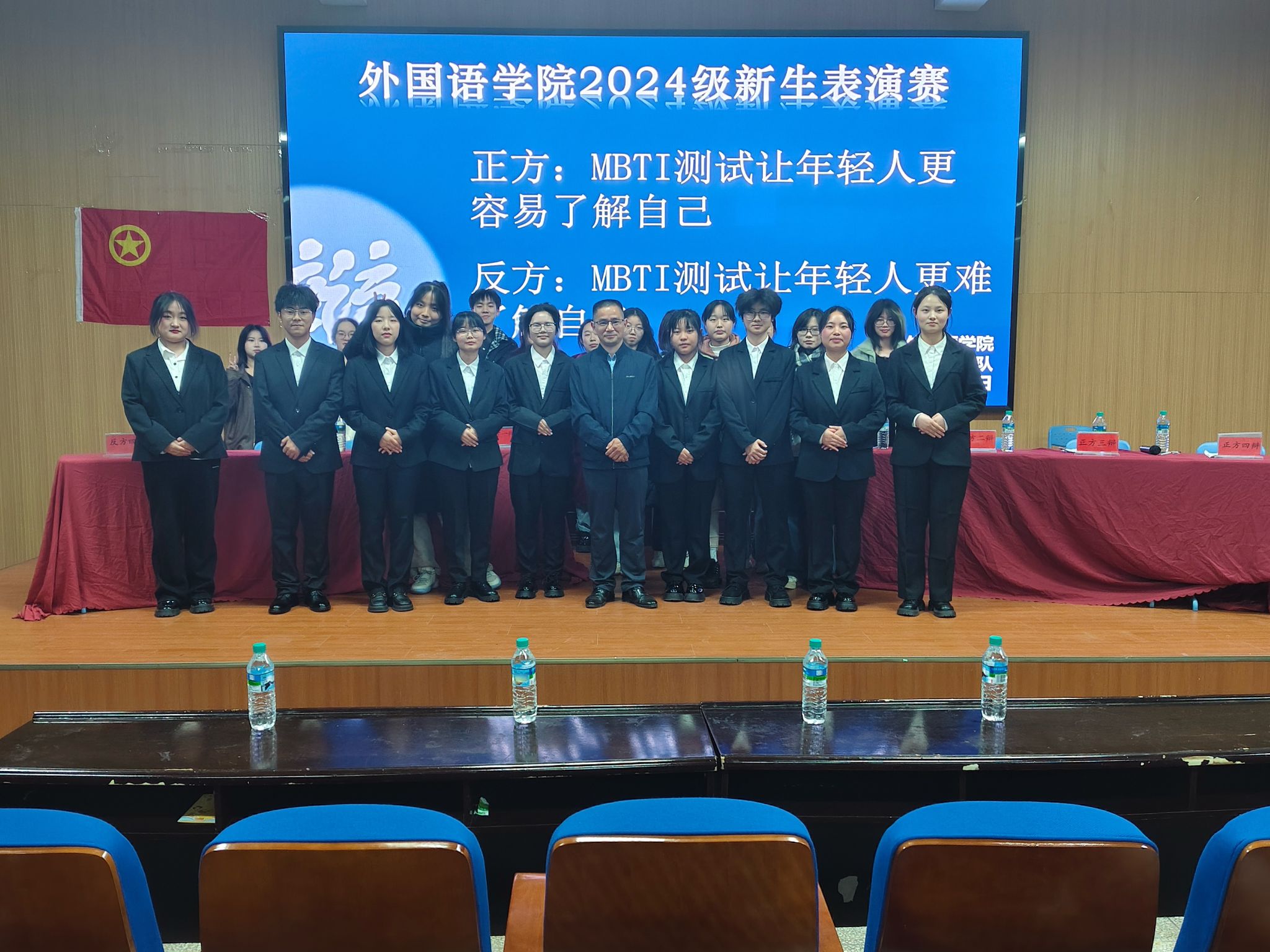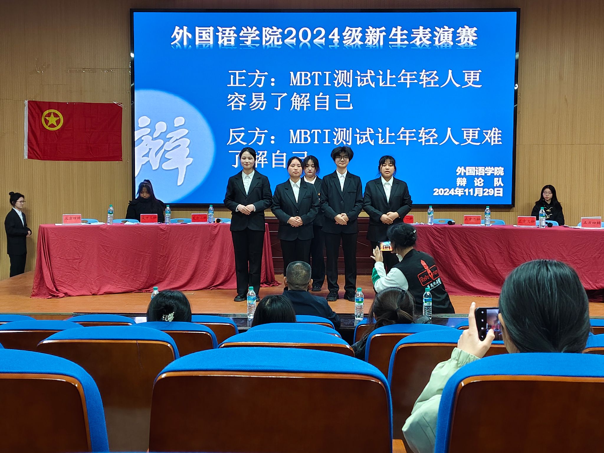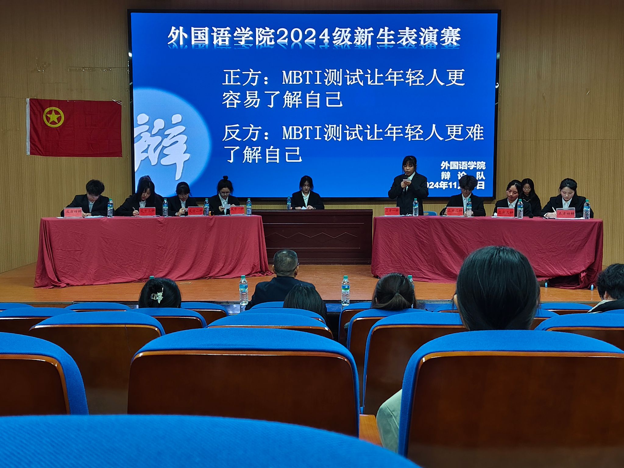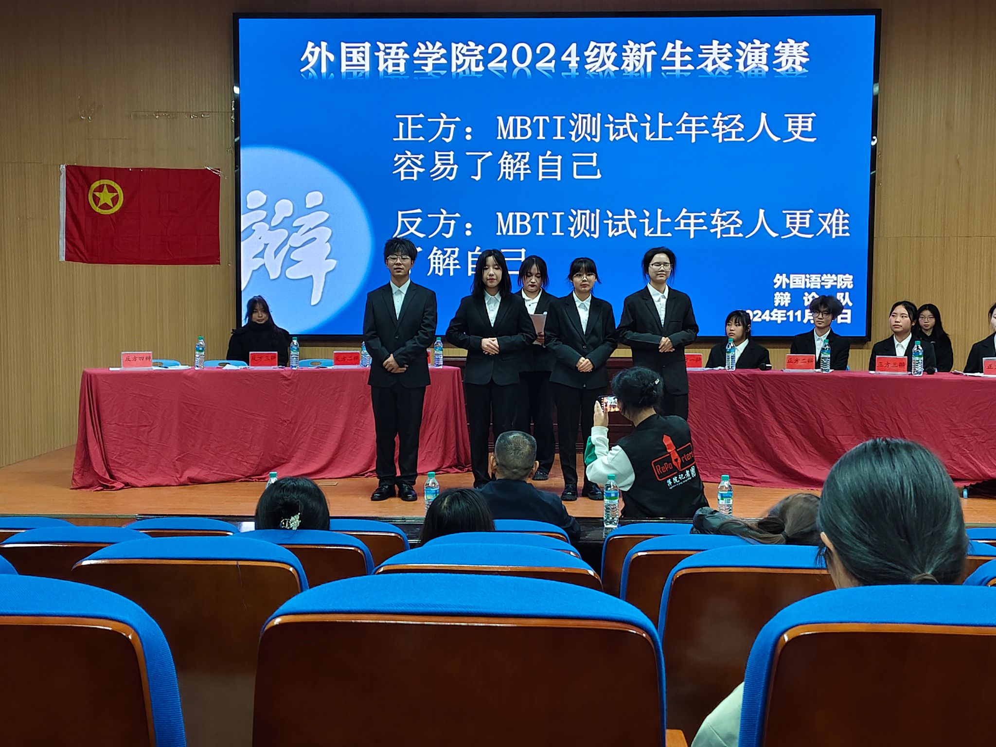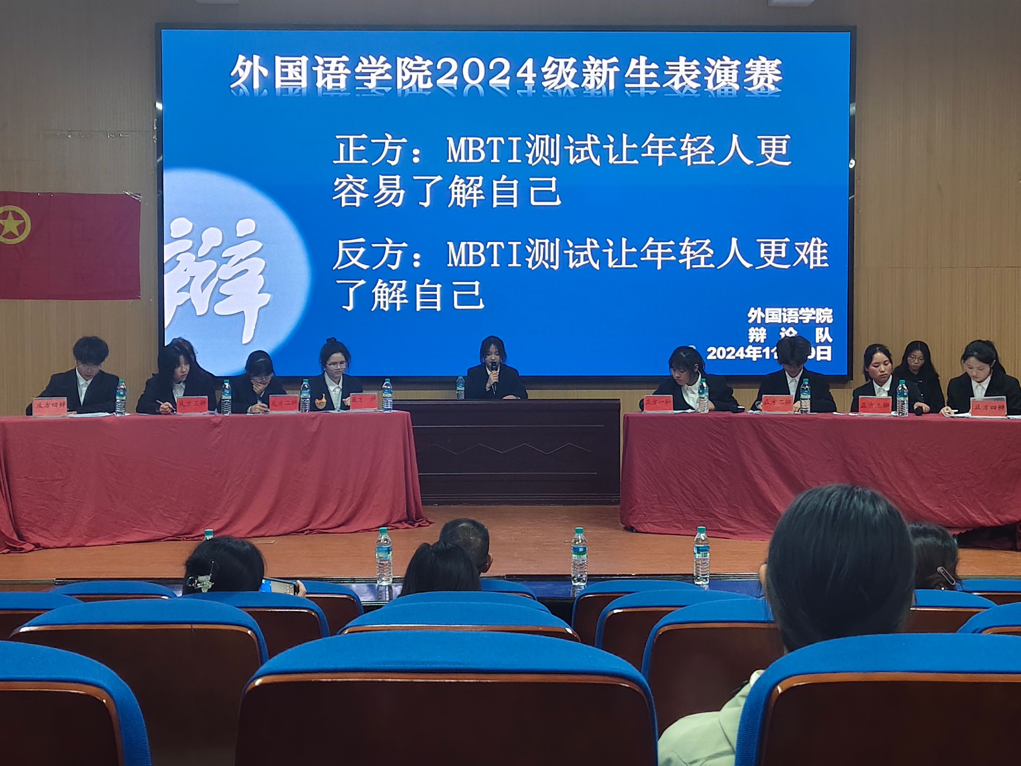 为了进一步拓展学生的思维能力,外国语学院于2024年11月29日晚19:00在跬步楼1115教室举办以 “MBTI 测试是否让年轻人更了解自己” 为辩题的辩论赛,为全院师生带来了一场思维的狂欢。到场的嘉宾有外国语学院党委书记刘佳萍老师,以及部分大一、大二观众。