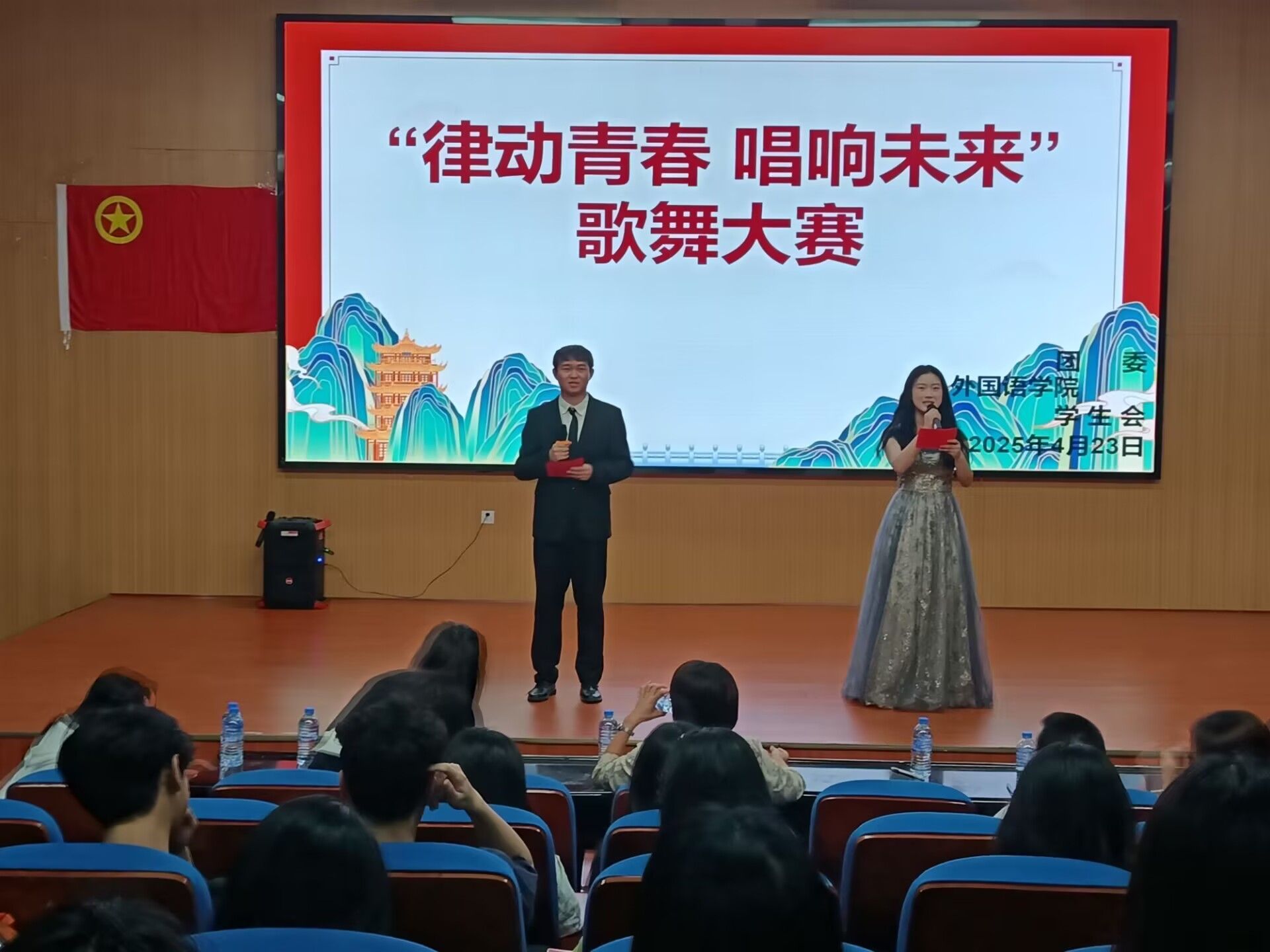 为丰富同学们的课余生活,为外国语学院的学子们提供一个展示自我、释放激情的平台,推动校园文化的多元发展。萍乡学院外国语学院于2025年4月23日晚19:10在跬步楼1115教室,举办了一场别开生面的“律动青春,唱响未来”歌舞大赛。出席此次活动的嘉宾有外国语学院党委书记刘佳萍老师,外国语学院党委副书记曹金萍老师,外国语学院团委书记冷全宝老师,外国语学院团委副书记裘佳美,外国语学院学生会主席黄胜兰,外国语学院学生会副主席邹奕姿,团委书记助理欧阳娜,办公室主任罗静雯,各组织负责人和各部门部长以及大一、大二部分观众。