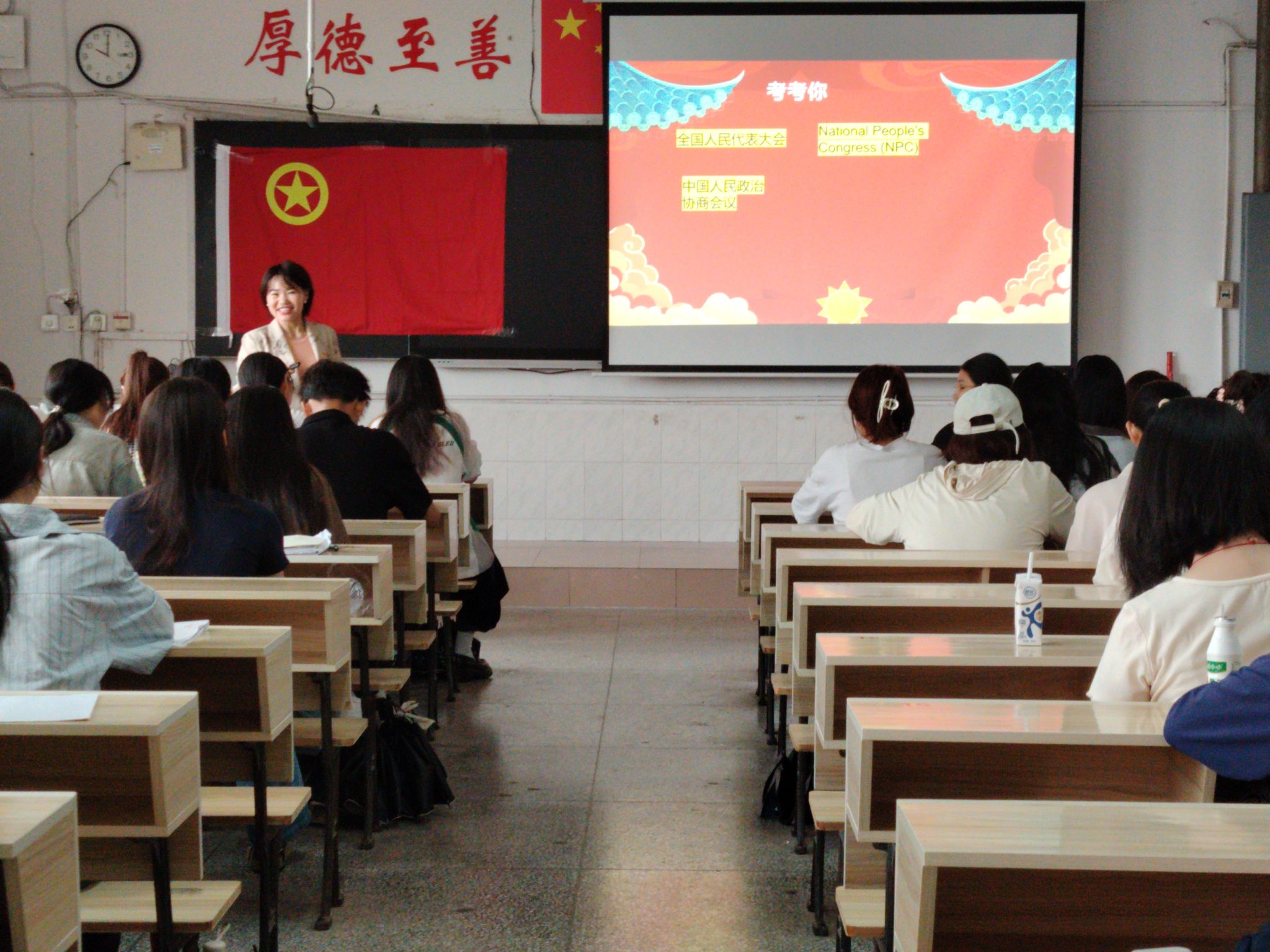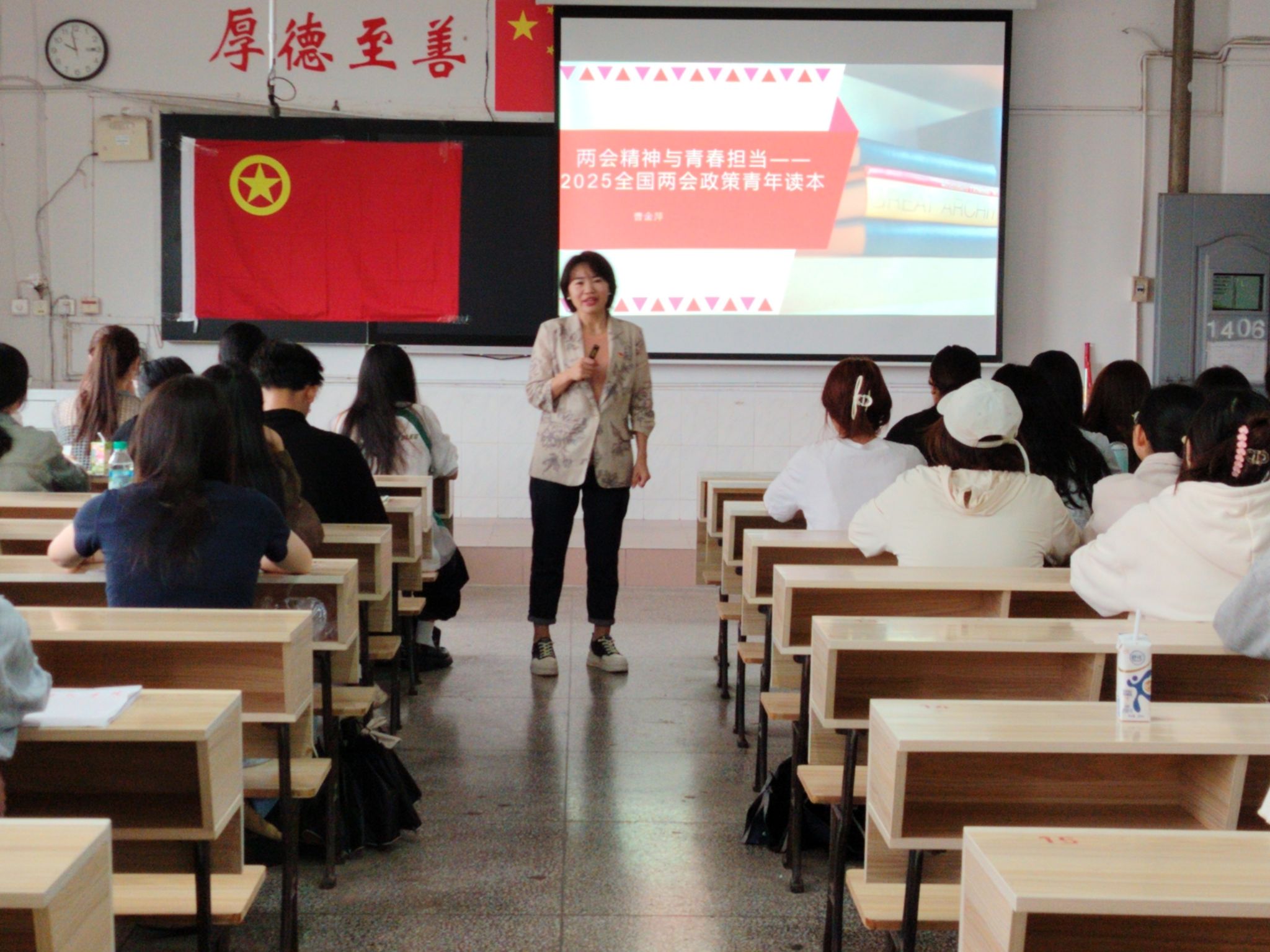 课程在完成考勤后正式开始。本次课程紧扣“两会精神与青春担当”主题,曹金萍书记先带领大家一同回顾2024年工作报告,再从2025年经济社会发展总体要求和政策取向、2025年全国两会热点等方面展开深入解读。曹书记充分结合外国语学院专业特色,创新教学形式。她选取两会报告中 “国内生产总值增长5%左右”、“居民消费价格涨幅2%左右” 等核心语句,组织同学们开展现场翻译实践。同时,曹书记结合2025年全国两会聚焦高质量发展、科技创新、乡村振兴等关键议题,为青马培训班学员锚定奋斗坐标,指明成长路径。例如,在科技创新方面,青年要勇立潮头主动投身新质生产力发展浪潮,在科技攻关中“挑大梁”、“当主角”,以实际行动推动科技强国建设。在乡村振兴领域,广大青年要响应国家号召,深入乡村一线,开展实践锻炼,为乡村产业升级、文化传承、生态保护等贡献力量,成为实现乡村全面振兴的中坚力量。此外,曹书记强调,在人工智能与信息爆炸深度融合的时代背景下,作为外语学习者,面对技术迭代与跨文化传播格局的深刻变革,大家不仅要持续拓宽知识边界、夯实语言专业功底,更需主动拥抱数字技术,培养跨学科思维,实现语言能力、文化素养与数字技能的多维融合,讲好中国故事,传播中国声音。