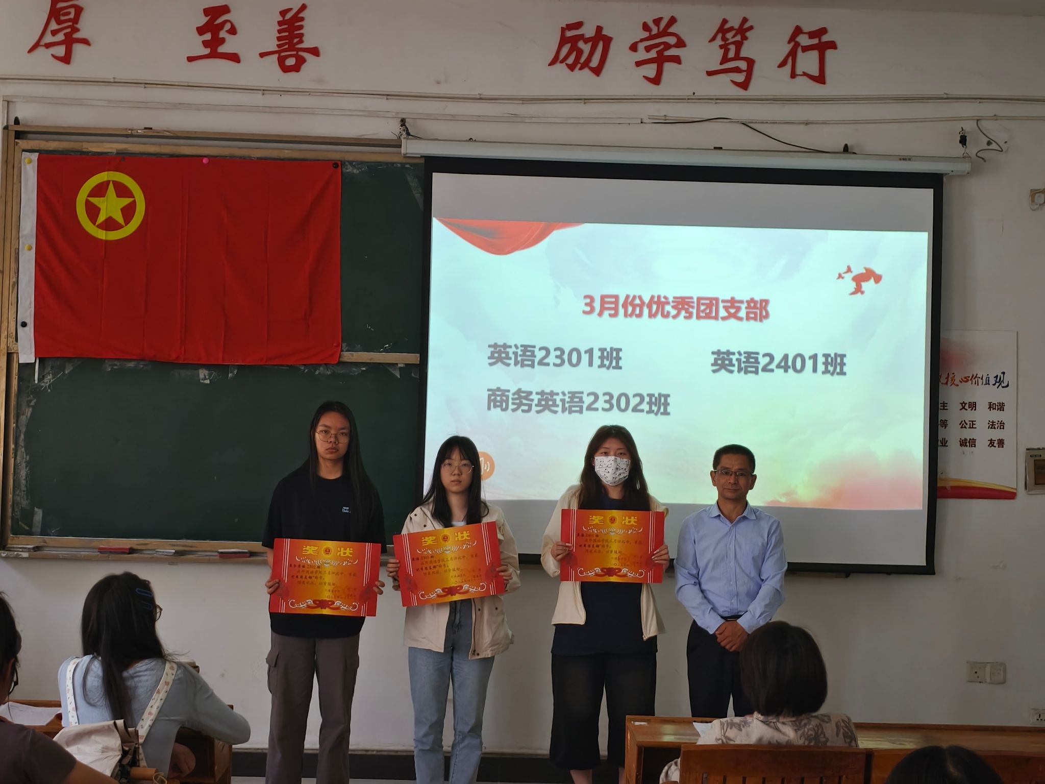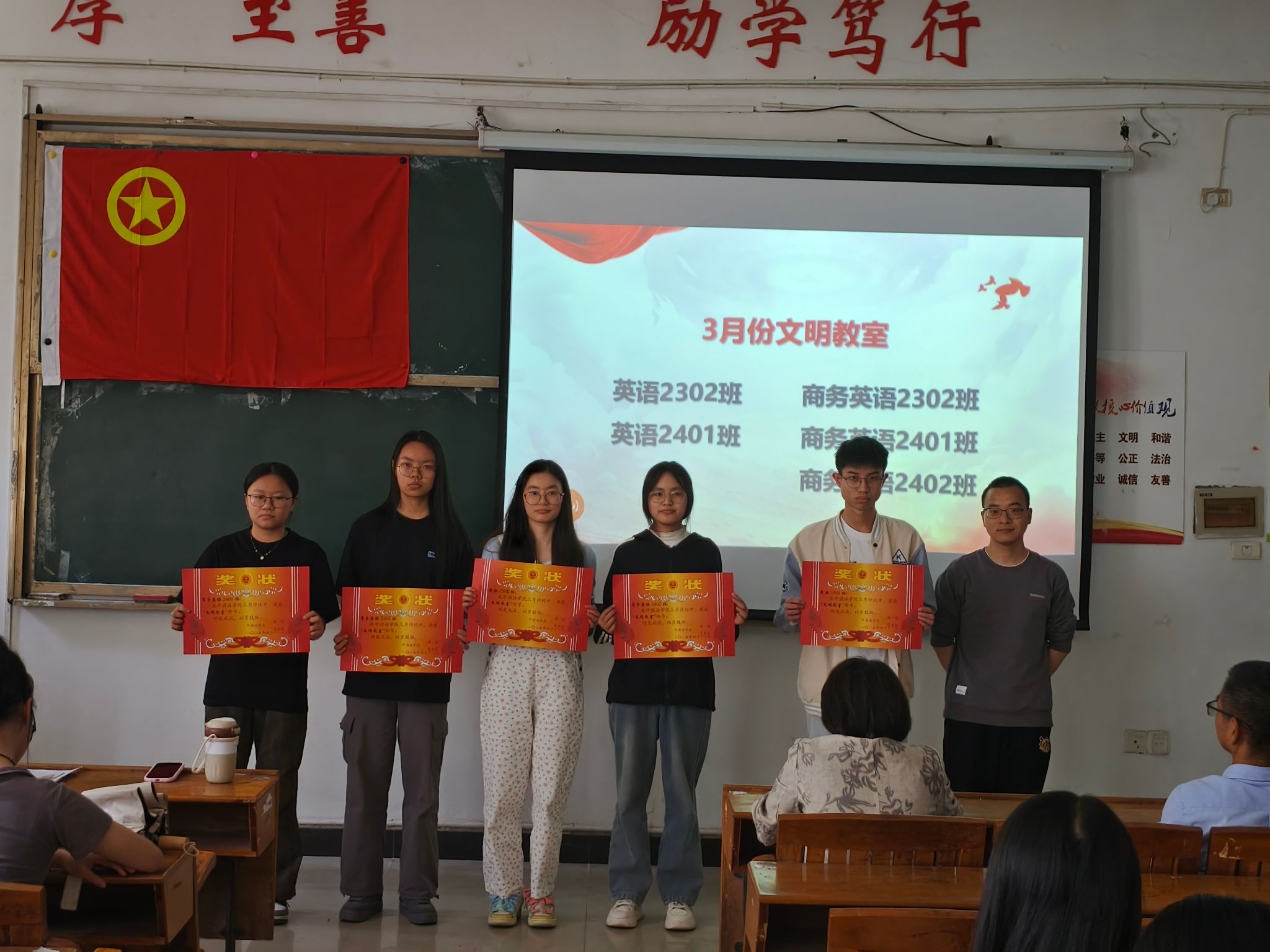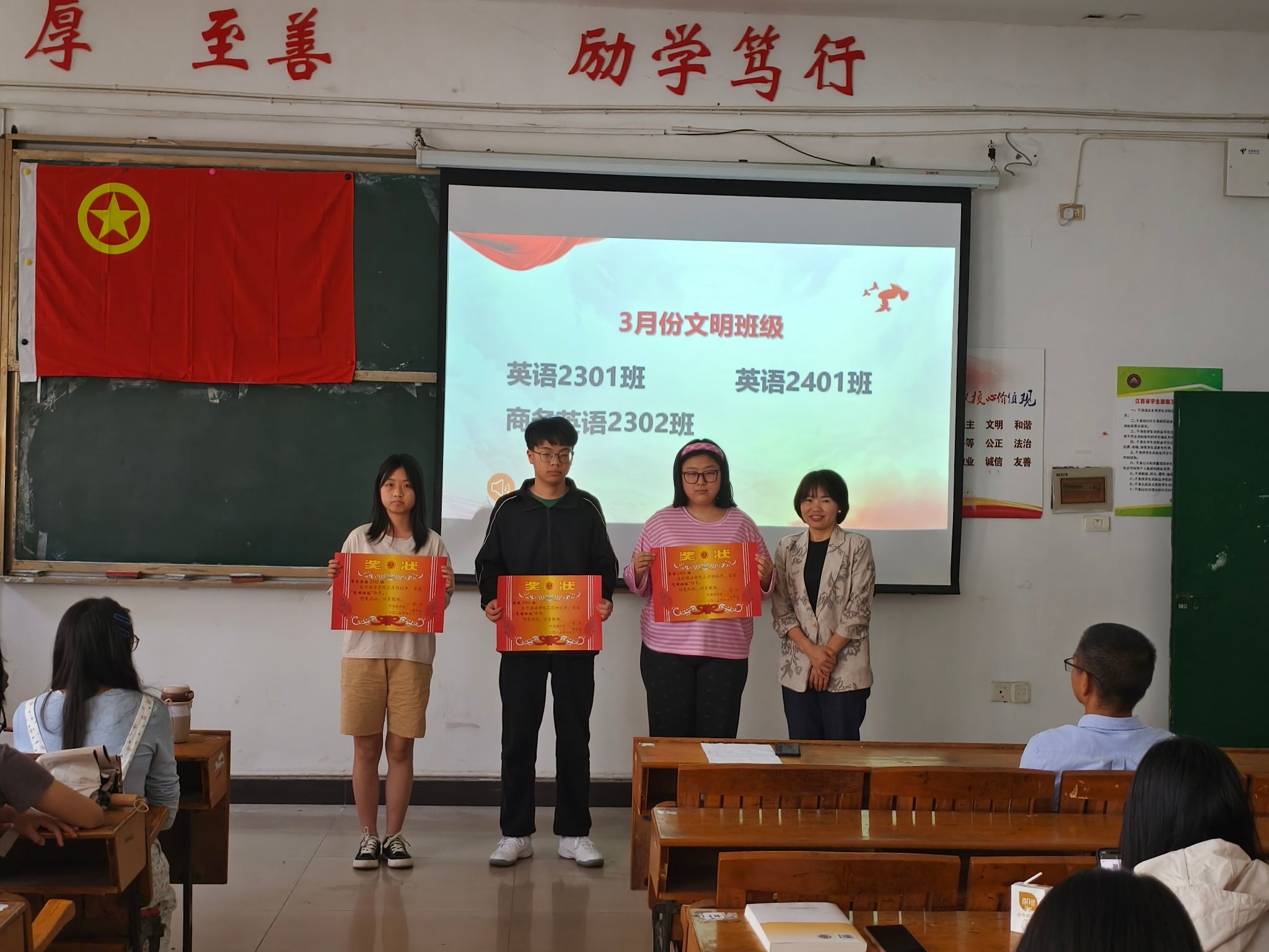 会议开始前,办公室部门成员进行考勤,确保全体学干到齐。随后,会议正式开始。首先,大会对三月份的文明教室进行表彰,由团委书记冷全宝老师为获奖班级颁奖。其次,党委副书记曹金萍老师为三月份的文明班级颁奖。文明教室和文明班级,不仅仅是一种荣誉称号,更是引领师生在追求文明的道路上不断前行的风向标,激励着更多的班级和同学投身于文明创建活动中来。紧接着,对优秀团支部进行表彰,党委书记刘佳萍老师为获奖班级颁奖。优秀团支部的表彰,充分彰显了学院在思想引领与组织建设方面取得的卓越成果,为各团支部树立了标杆,激励着更多团支部积极进取、不断创新。表彰环节结束后,党委副书记曹金萍老师围绕 “红色班级” 创建工作发表讲话。曹书记深入剖析了 “为什么建” 和 “怎么建” 这两个关键问题。讲话末尾,曹金萍老师对外国语学院全体学子寄予了三点殷切希望:一是做好红色精神文化传承者,鼓励同学们深入学习红色文化,将红色基因融入血脉;二是做好班级建设的领航员,积极发挥模范带头作用,带领班级同学共同进步;三是做好中国故事的传播者,运用专业知识,向世界讲好中国故事,传播中国声音。最后,党委书记刘佳萍老师就“立鸿鹄志,做奋斗者”学风建设工作发言。刘书记结合当前严峻的就业环境等实际问题,激励同学们要树立远大志向,明确学习目标。他强调,只有以持之以恒的奋斗精神投身学习,才能在激烈的竞争中脱颖而出。同时,刘书记希望同学们积极营造积极向上的学风,共同为学院的知识殿堂添砖加瓦,打造良好的学习氛围,提升学院整体学习水平。