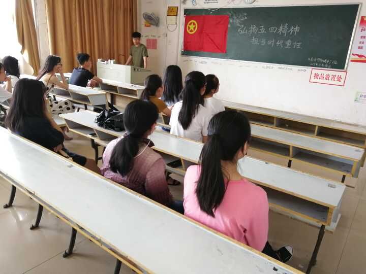 为传承五四精神,担当时代责任,凝聚青春力量,外国语学院18英本2班于2019年5月23日15:00在英华楼3307召开“弘扬五四精神,担当时代重任”主题班会。此次班会由班长和团支书主持,全体同学参与。
