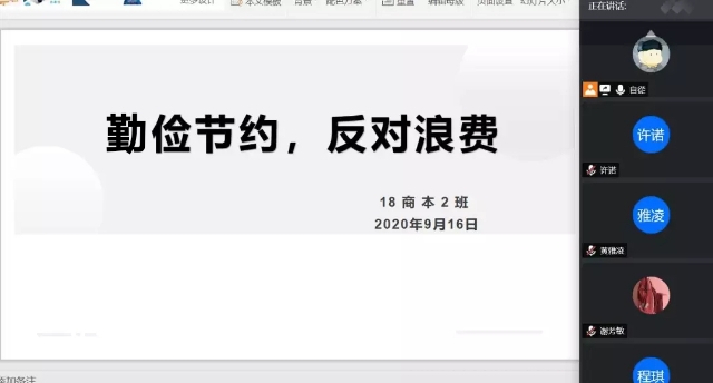 为了增强各位同学的勤俭节约意识,让同学们更好地融入到学习生活中,外国语学院18商本2班于2020年9月16日9:00在腾讯会议召开“勤俭节约,反对浪费”主题班会。此次会议由班长汤志聪主持,18商本2班全体同学参与。