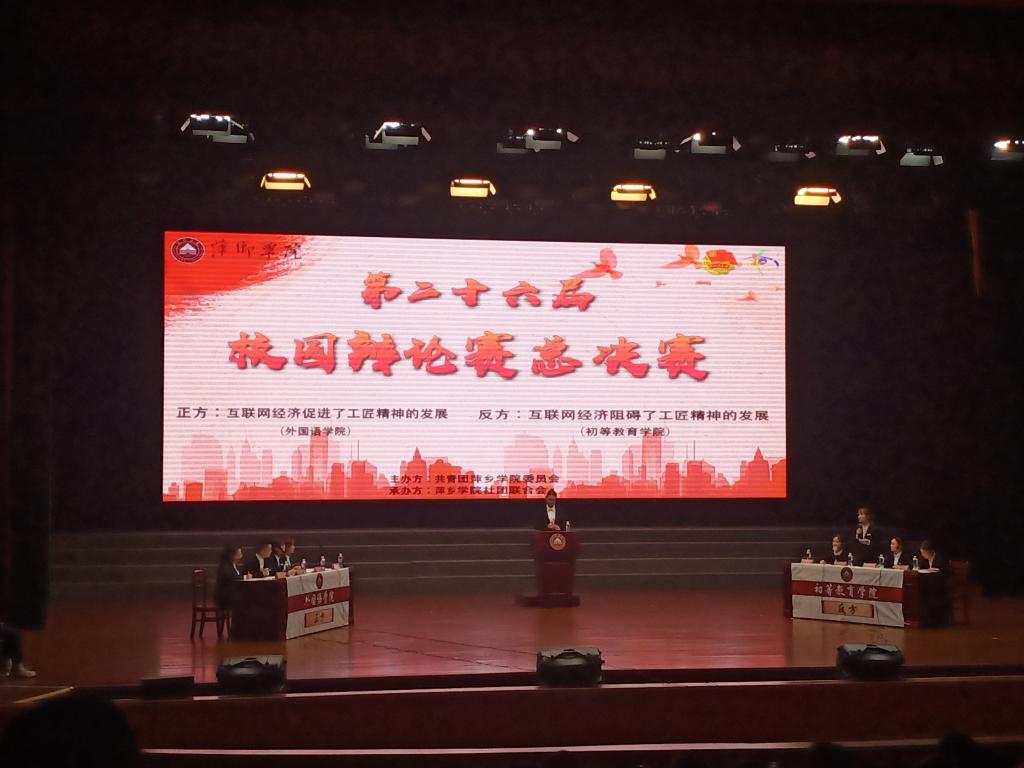 经过一个多月初赛、复赛、半决赛层层挑战,最终外国语学院代表队和初等教育学院代表队进入总决赛。此次辩论赛中,外国语学院为正方辩手,辩题是“互联网促进了工匠精神的发展”;初等教育学院则为反方辩手,辩题是“互联网阻碍了工匠精神的发展”。比赛开始前,外国语学院与初等教育学院进行拉歌活动,歌声一浪高过一浪,热闹非凡。在双方辩友进行简短的自我介绍后,比赛正式开始。比赛开始后,场上双方辩手你来我往,唇枪舌战,围绕着辩题“互联网是否促进工匠精神的发展”展开了激烈的辩论。在辩论中,选手们不失风度,始终面带微笑、侃侃而谈。他们良好的风范、出色的口才、敏捷的思维令场下观众为之折服,掌声不断。比赛最后,北京雍文(萍乡)律师事务所副主任律师姚喻对各位参赛选手的精彩表现进行点评,充分肯定了各位选手出众的思维能力。经过激烈角逐,最终外国语学院代表队凭借着出色的反应能力和严谨的逻辑夺得本届校园辩论赛冠军。