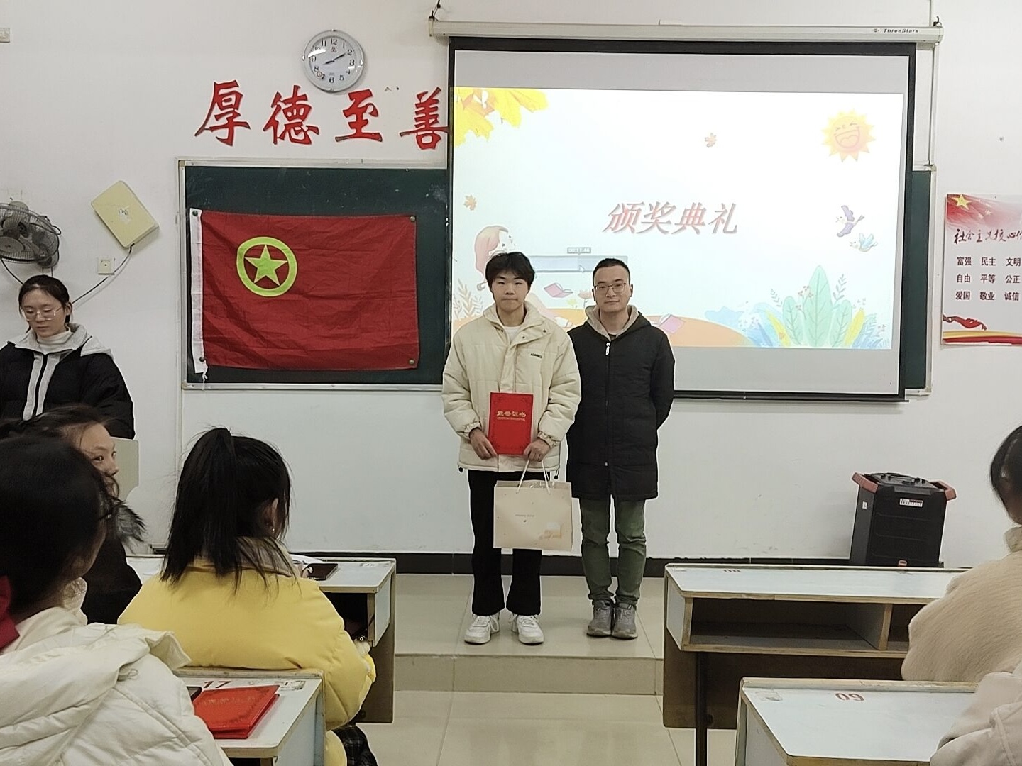 为了促进学生间的文化交流,营造浓厚的校园读书文化。外国语学院于2021年12月20日19:00在英华楼3214教室举办暨日读书分享会阅读颁奖仪式。参加此次活动的有外国语学院团委书记冷全宝、学生会副主席舒正翔、办公室主任林安琪、青年志愿者协会会长王文晶、各部门部长及参赛选手与观众。