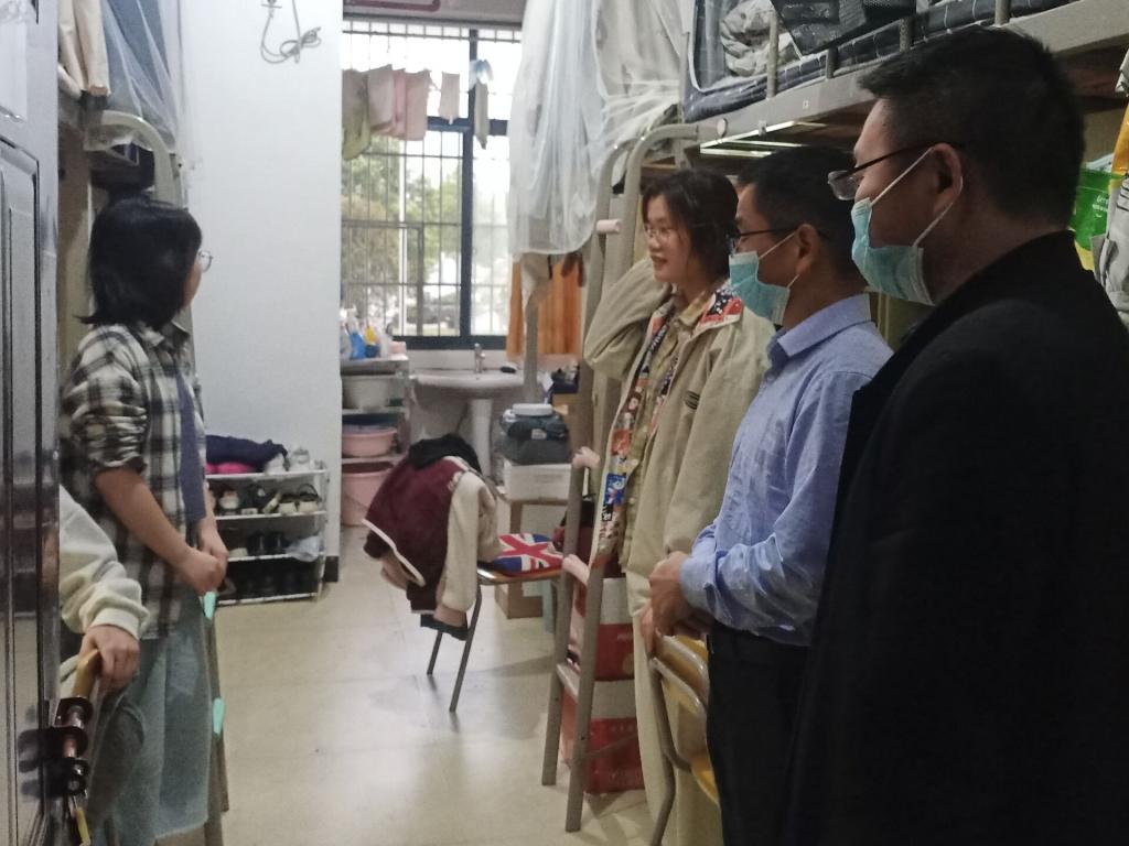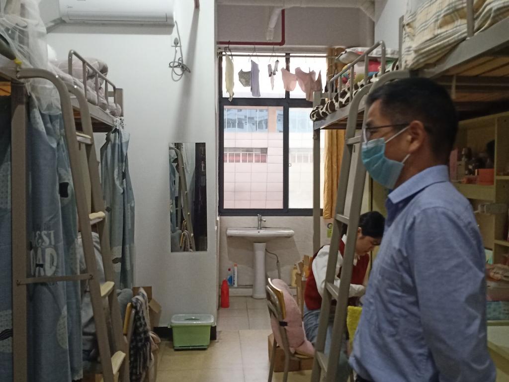 刘书记先是敲门礼貌询问同学们是否可以进入,在得到学生许可后才走进寝室。当同学们看到刘书记到来都纷纷站起并热烈地表示对书记的欢迎。随之书记就防疫工作展开话题,提醒大家要多多注意防疫,尽量不要外出,要注意通风,勤洗手。若外出一定要带好口罩,进校时配合检查,不要去人群聚集处。对于防疫工作,需要大家共同合作。同时书记还关注学生身体状况,叮嘱同学们要注意穿衣,以免早晚温差过大导致着凉发烧,身体是革命的本钱,希望大家保重身体。最后,老师安慰在场学子们不要被疫情所吓倒,要配合防疫工作的开展。希望大家共同努力,遵循学校的防疫工作,携手外院一起打赢这场防疫战。