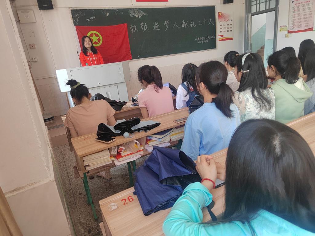 班会开始,徐江萍以PPT展示的形式向大家讲述了过往的全国人民代表大会的现场流程,充分体现了人民当家做主。在新的历史节点,新的征程上,我们都是追梦人。我们享受了祖国的发展,更应该为祖国再创辉煌。党的二十大是我们党进入全面建设社会主义现代化国家、向第二个百年奋斗目标进军新征程的重要时刻召开的一次十分重要的代表大会,是党和国家政治生活中的一件大事。班会的最后文艺委员带着同学们唱国歌,面对着墙上的国旗敬礼。一种民族自豪感油然而生。