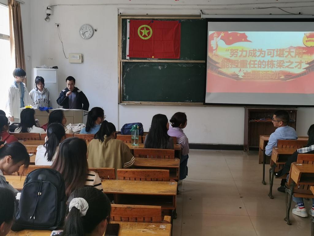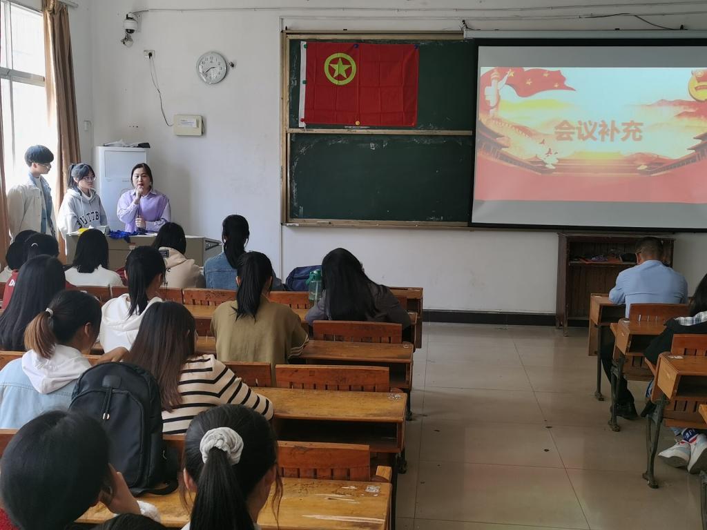 会议初始,先由办公室主任进行考勤。紧接着,进入颁奖环节,由主持人宣布文明班级、优秀团支部获奖情况,刘书记和冷全宝老师为其颁发奖状并合影留念。随即,由刘书记致辞,书记强调在疫情防控期间,学干们应自觉遵守学校的规章制度,非必要不出校。在学习上,认真对待,珍惜时间取得优秀的成绩,不断追逐自己的梦想。在工作上,各位学干要将工作做好做细、多积累经验、不断改进方法,做出成效。同学们也表示将谨记书记教诲,不断提升专业知识水平与思想道德修养。紧接着,由冷全宝老师对“努力成为可堪大用,能担重任的栋梁之才”主题活动进行阐述。他强调大学生要敢于担当,在疫情期间做好相关防护措施,同时学好知识和苦练本领,争做新时代新青年。最后,学生会主席孙世睿进行会议补充。她指出在校期间,大家应该互相协助、共同坚守。同时,她也指出班级内部可以通过开展一些心理活动和小游戏帮助大家更好地学习,一起迎接疫情胜利的到来。