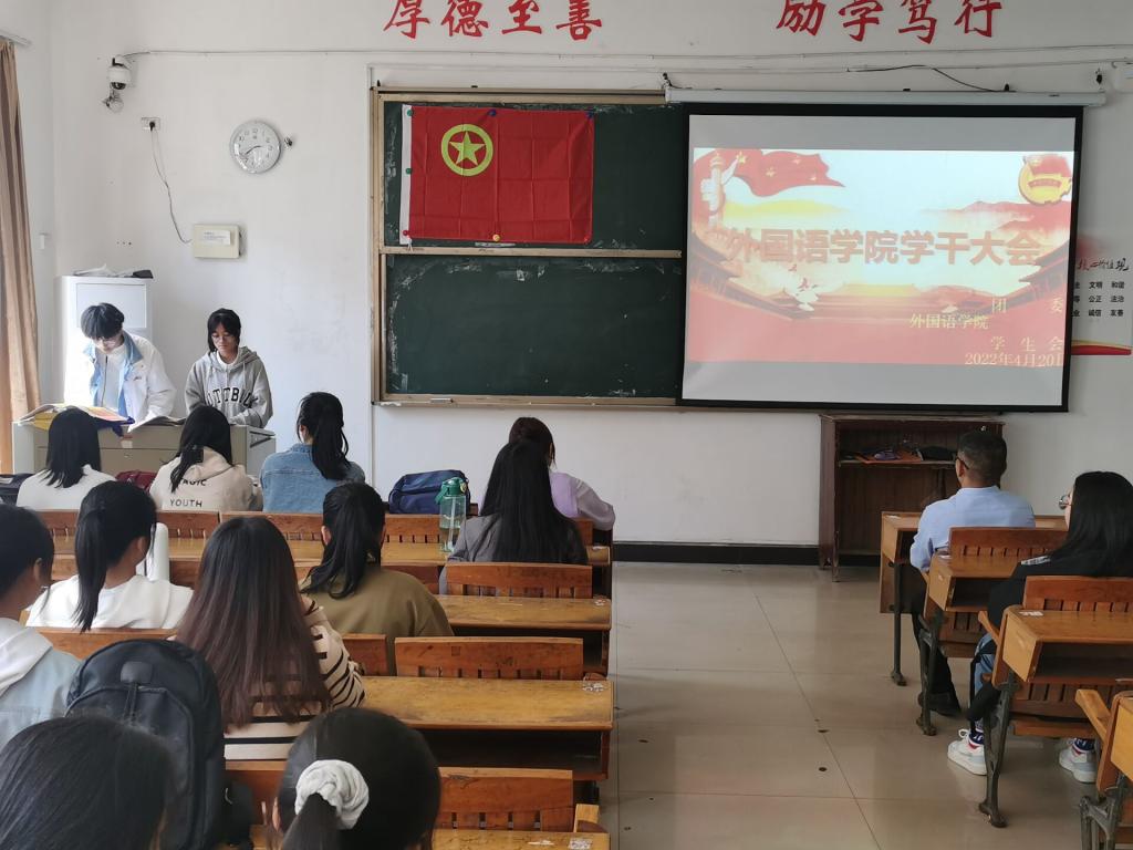 为加强学干的责任担当和防疫意识,提高其工作能力,促进内部交流与建设,外国语学院于2022年4月20日12:20在英华楼3306教室召开学干大会。参加此次大会的成员有外国语学院党委副书记刘佳萍、团委书记冷全宝、18级辅导员何宇,团委副书记雷欣宇、书记助理洪婕、李桂帆,学生会主席孙世睿、副主席郭梅玉,办公室主任林安琪,各部门部长及干事和20、21级各班班长及团支书。