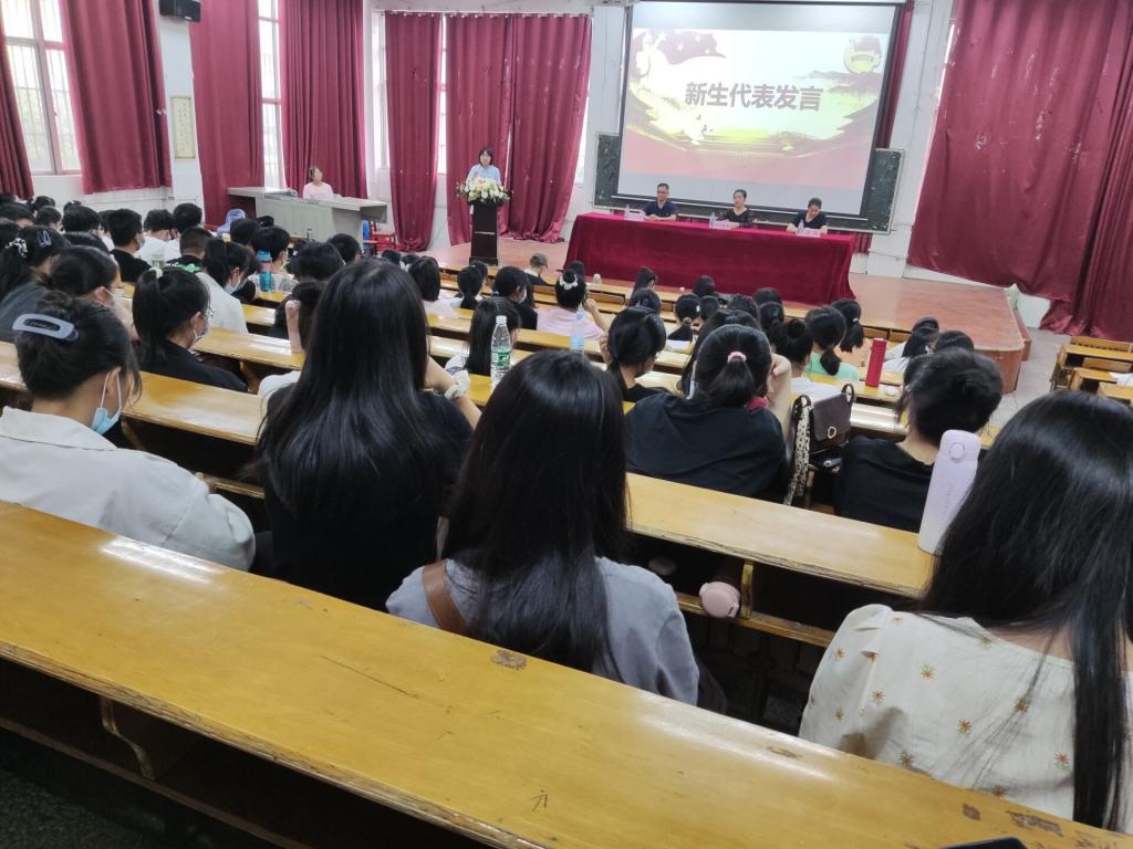 全体人员到齐后,在主持人的宣布下典礼正式开始。典礼第一项,全体成员起立合唱国歌,伴着国歌的雄壮旋律,大家肃然起敬,盯着屏幕认真的合唱起来。大会第二项,由院长欧阳咏梅上台发言。首先,她由衷地对22级新生的到来表示欢迎,同时还为在场的同学们介绍了学校的教学概况,提出了自己的几点建议,希望大家在以后的大学生活中要做有理想有大爱、有思想有情怀、有追求有抱负的人,年轻是我们的资本,但要好好珍惜黄金时光,也要利用好现有的教学资源,早早规划自己的奋斗目标。大会第三项,刘佳萍老师上台致辞。他表达了自己对于这次活动的期待,点出了特殊时期,我们需要做好疫情防控的重点。同时强调了宿舍用电、饮食、出行三个方面的安全问题,警示新生在日常生活中保护好自己的身体与财产。最后书记指出,在大学里提升自身的专业知识很重要,但沟通能力和良好的心态也必不可少,不论怎么样,所有的困难挫折都是可以克服的。大会第四项,由卓玲老师上台致辞。她从现实生活的角度出发,希望大家在当下的生活中,能够做到脚踏实地,而不是空有想法。“现在站在我们前方的人很优秀,但是他们也是我们的振奋剂,我们当然可以超越他们。”最后,她希望同学们可以很好的过渡到大学生活,并祝愿新生们能够实现自己的梦想。大会第五项,由老生代表上台发言。在发言过程中,她结合自身的经验,为大家分享了自己过去的两年生活。庆幸自己加入了学生会,在锻炼自己各方面的能力的同时还结识了许多志同道合的伙伴。在学习方面,她建议大家要把专业知识的基础打扎实,同时也要合理的对未来进行规划。大会第六项,由新生代表上台发言。她回忆了前段时间的“破冰”活动,指出了自己对于学院的认识与憧憬,同时还勉励各位同学要能担重任,大学是一个看重全面发展的地方,而我们要做的便是成为一个合格的大学生。最后,伴着悠扬庄严的校歌,和老师美好的祝愿,新生开学典礼圆满结束。