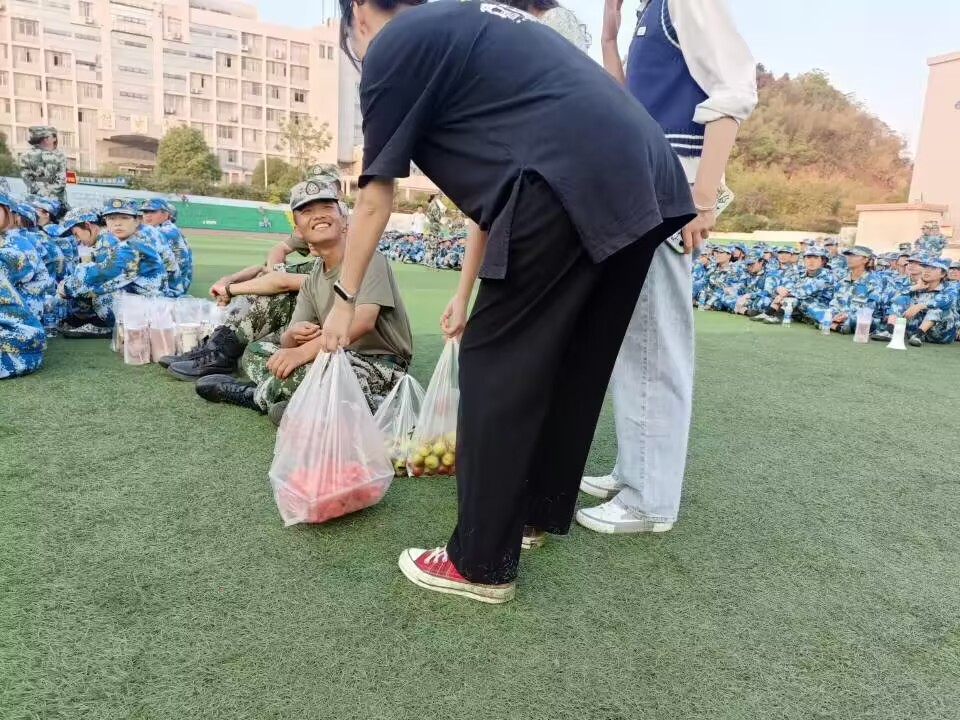 无军训,不青春。军训烈日下同学们脸上的汗珠,我想那便是青春的见证。今年的军训,由于疫情,晚来了一些,但学长学姐的关爱永远也不会迟到。此次活动由学生会各部门负责人自主安排时间展开,前期的准备是繁琐的,看望当天,大家分散各地,水果店、超市、奶茶店都能看到他们忙碌的身影,大堆的东西上贴满了便签,但每个人脸上洋溢着的都是幸福的表情。准备完毕后,提上大包小包的“小惊喜”大家一齐前往了军训场地。烈日当空照,新生们身着统一的军装,排列整齐,活力十足。一到军训场地,大家便迎来了新生热情地问候,一句句“学长学姐好”,温暖人心。教官们也开启了“休息”模式,暂停训练,开始有序地分发水果零食,在这炎热的军训天,送上一份清凉,丝丝关爱入心田。短暂的休息后,新生们又开始了在炽阳下的训练。