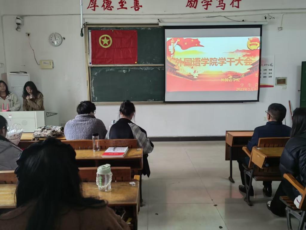 为加强学干的责任担当和使命情怀,提高其工作能力,促进内部交流与建设,外国语学院于2023年3月1日12:20在英华楼3306教室召开本学期第一次学干大会。莅临本次大会的嘉宾有外国语学院党委书记刘佳萍、团委书记冷全宝,团委副书记毕鑫,学生会主席李闫潇,学生会 副主席邓楠楠,书记助理余文彬、李娜,办公室主任黄怡欣,各部门部长及干事和21、22级各班班长及团支书。