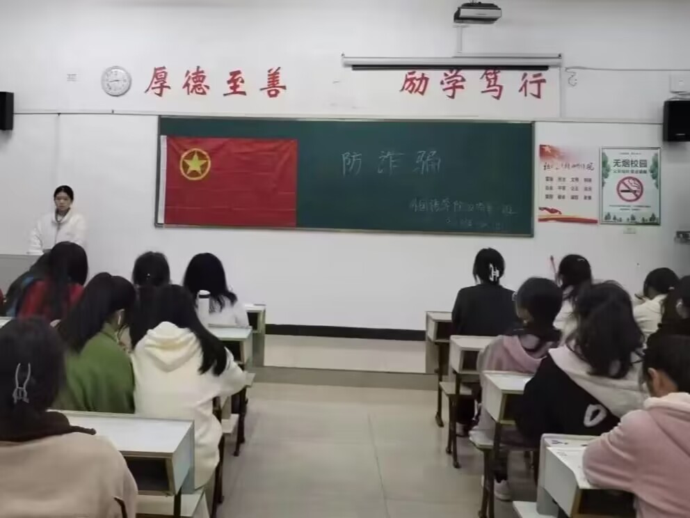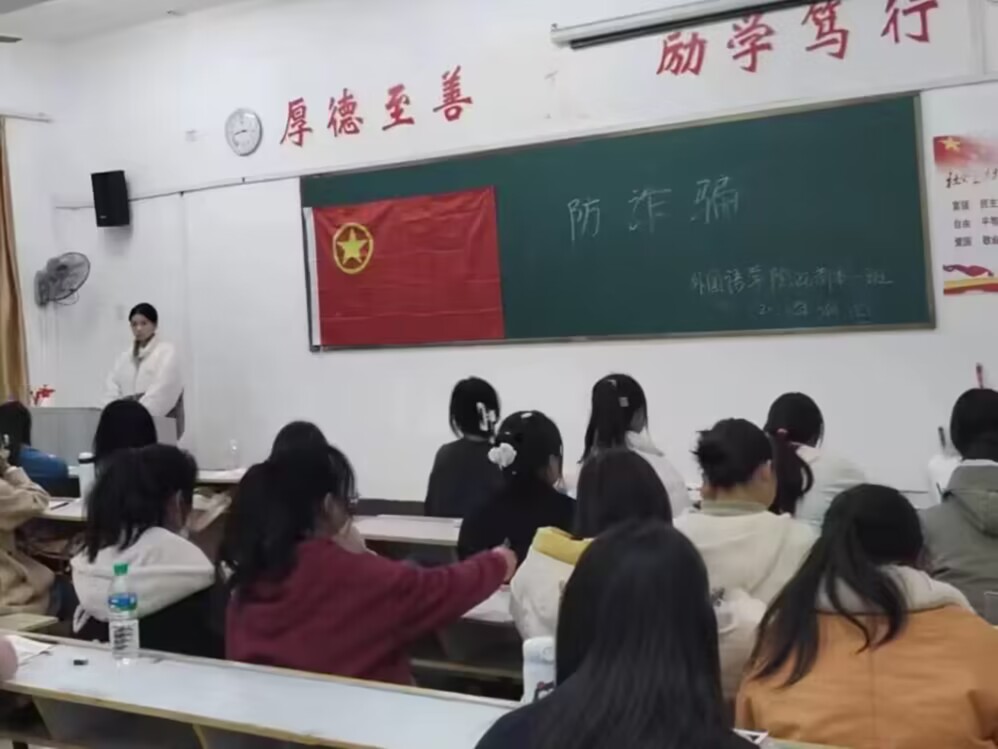 为了提高同学们的防范新型诈骗意识和增强自我辨别诈骗手段能力。为此,外国语学院22商本1班于2023年3月1日在英华楼3508教室召开“防诈骗”主题班会,此次活动由班长张芊芊主持,22商本1班全体同学参与。
