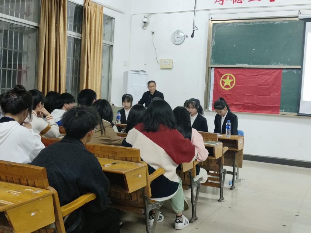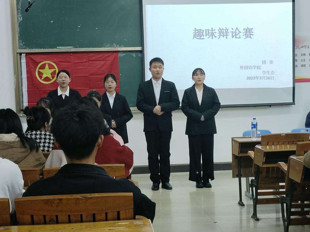 为了活跃校园氛围,促进学生之间的友好关系,开拓同学们的思路,体现学生风华正茂的精神面貌,提高语言组织表达能力和逻辑思维能力。外国语学院于2023年3月26日晚上19:10在英华楼3306教室举办“趣味辩论赛”决赛。莅临本次活动的嘉宾有外国语学院党委书记刘佳萍、团委书记冷全宝、学生会主席李闫潇、学生会副主席邓楠楠、办公室主任黄怡欣、心理站站长王象锋,青年志愿者协会会长余钟晓、环保俱乐部部长汪琪,辩论队负责人卢宇欣、丁雨佳、熊梓睿、郭邦浴,以及各部门部长和21、22级观众。