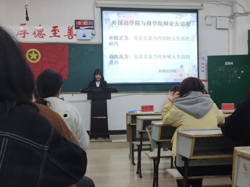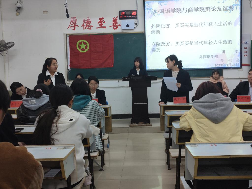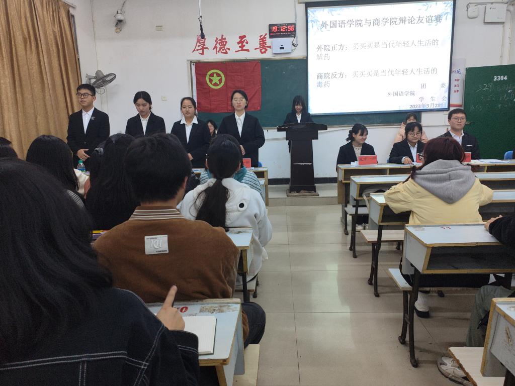 为了提升学生们的语言表达能力,丰富同学们的大学生活,外国语学院和商学院于2023年3月28日晚上19:00在英华楼3304教室举办辩论赛之友谊赛。出席此次活动的嘉宾有外国语学院辩论队负责人熊梓睿,商学院辩论队负责人吴倩,学生会副主席邓楠楠,书记助理余文彬、李娜,办公室主任黄怡欣,环保俱乐部部长汪琪,心理站站长王象锋以及各部门部长,外院22级观众和商院观众。