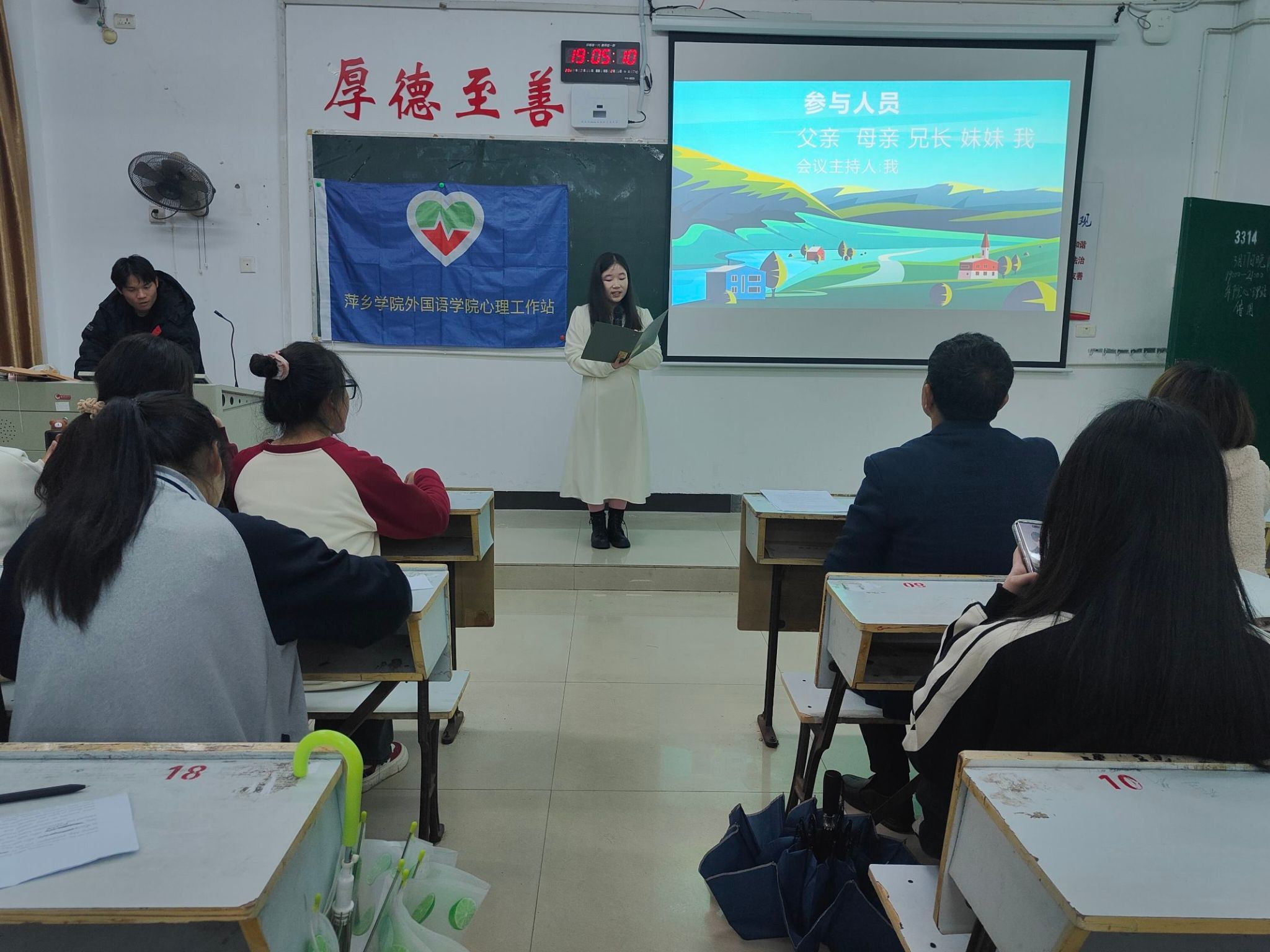 3月17日晚上,外国语学院在英华楼3314教室举办了“家庭会议”成果展示活动。外国语学院党委委员、学生英语支部书记曹金萍,心理站指导老师王卫民,学生英语党支部、商务英语支部干部,心理工作站成员和大一各班代表参加了本次活动。活动由商务英语2301班的鄢宇浩同学主持。