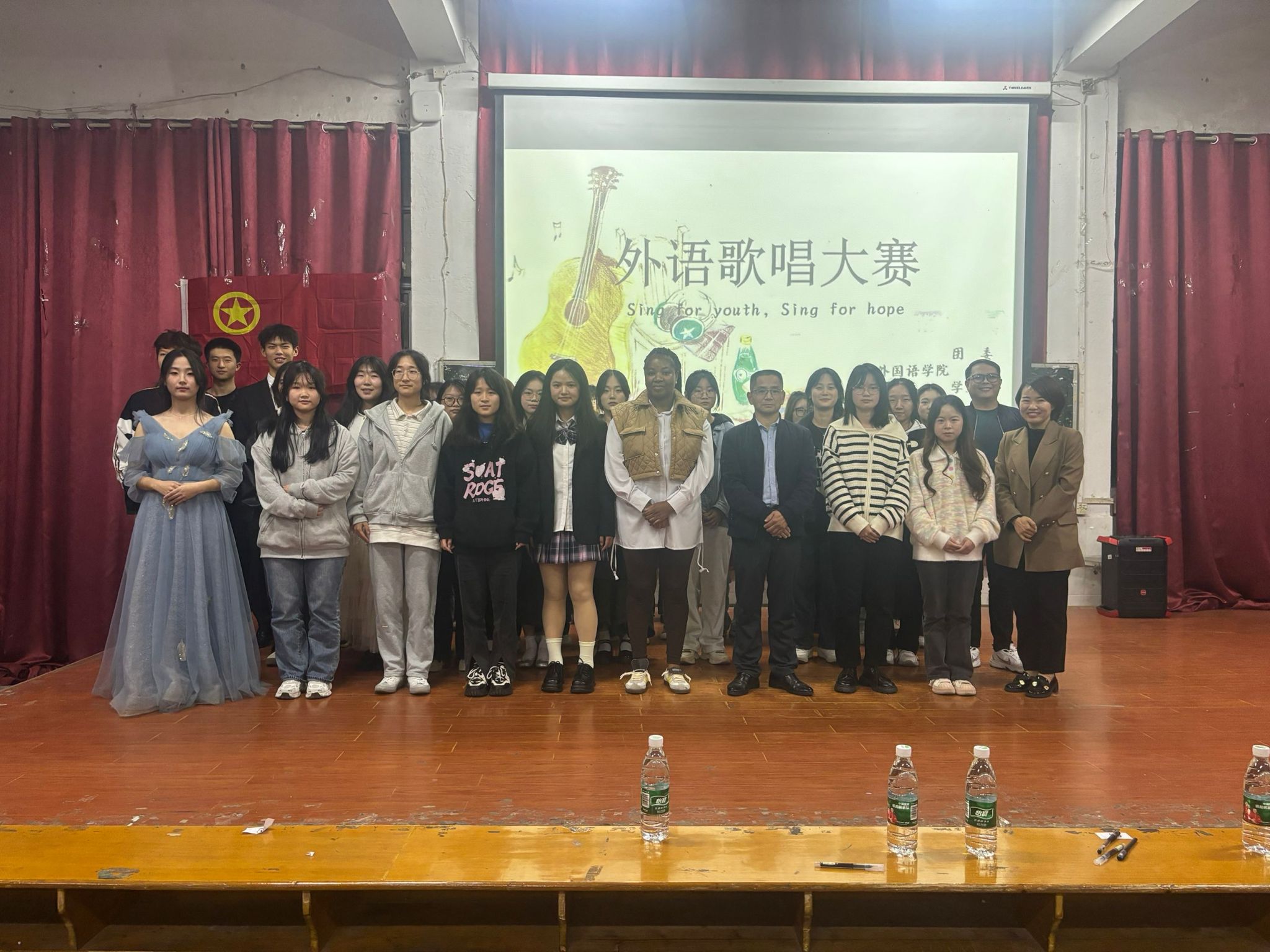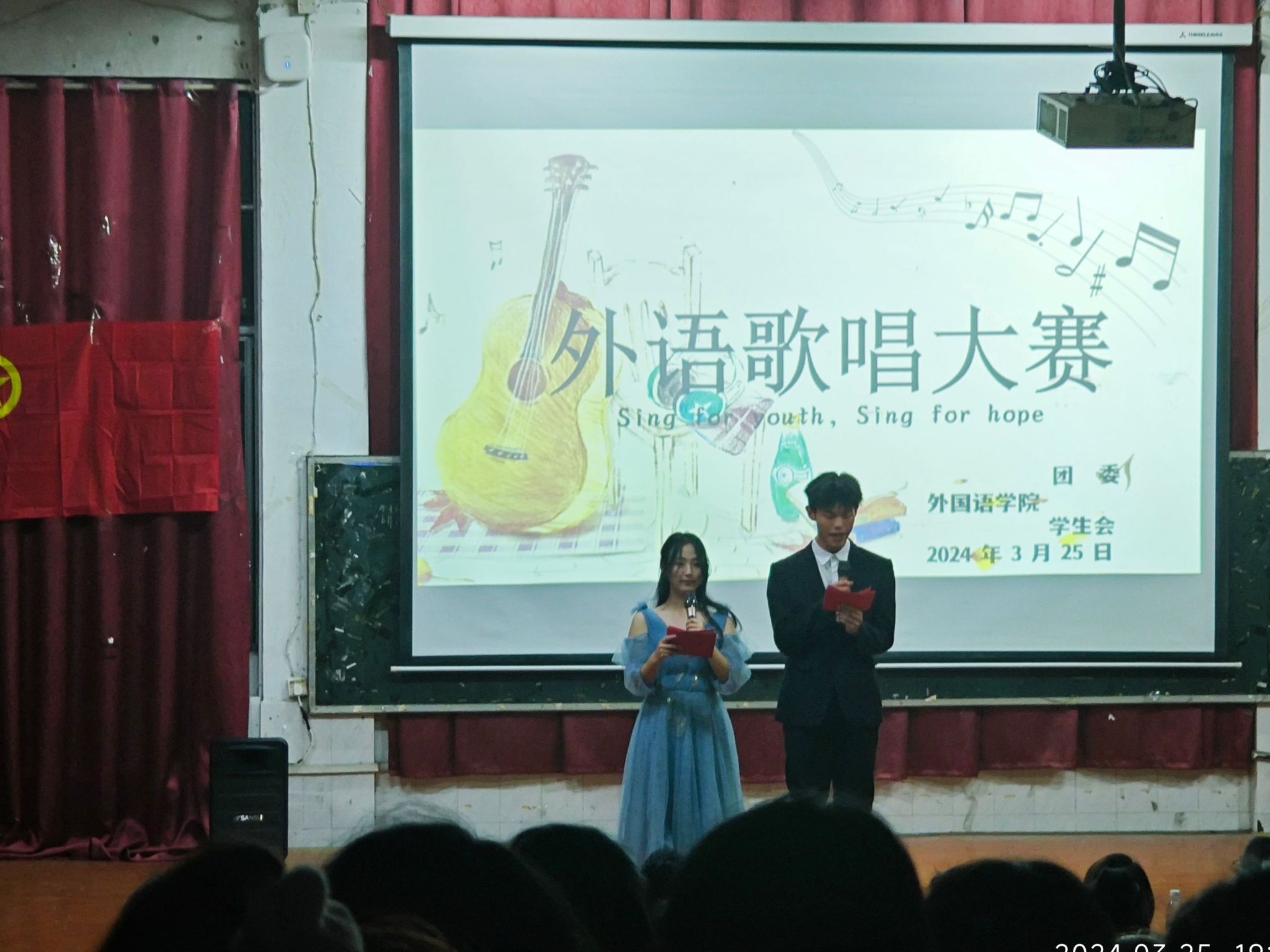 为了满足广大学生的精神文化需求,丰富同学们的课余生活,增强学生外语学习兴趣,为同学们提供一个展现自己的舞台。外国语学院于3月25日晚上19:10在跬步楼1115教室举办外语歌唱大赛。本次比赛邀请了外国语学院党委书记刘佳萍,党委委员、学生英语党支部书记曹金萍,团委书记冷全宝以及三名外教老师Joey、Maria和Aaron,团委副书记李晓雨、胡维琛,学生会主席冯浩,副主席高伟琳、付涵,团委书记助理段园园、邓诗婷,办公室主任李晓妍、以及各组织负责人和各部门部长。