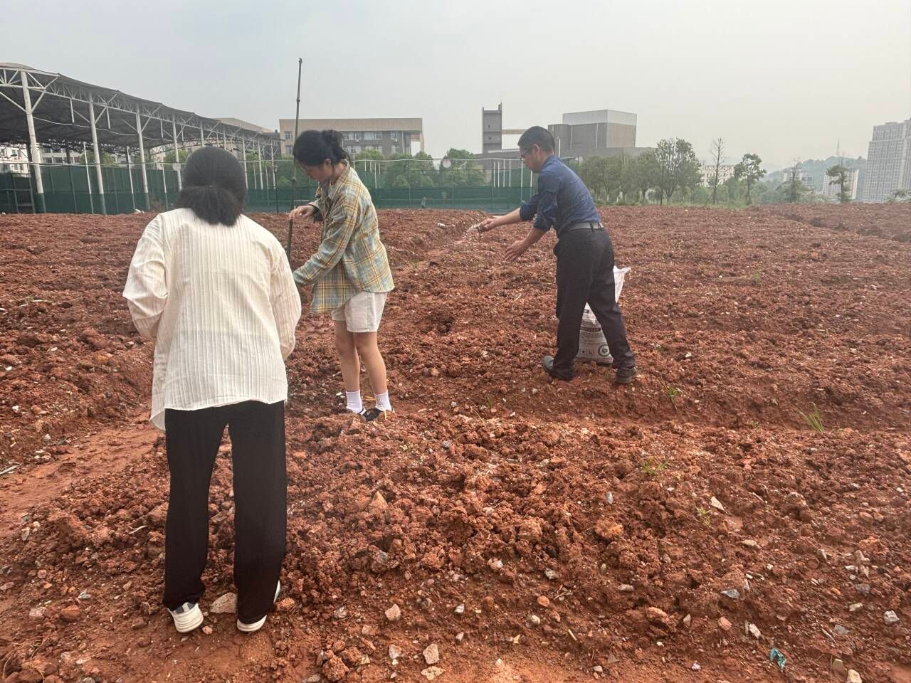 活动开始,刘书记率先向学干们示范耕种,分三步走:一刨坑、二放种子、三盖土。跃跃欲试的学干们在学习刘书记的种菜方法之后,纷纷行动起来。学干们不约而同的形成了一个个小组,默契的配合着。首先,一位学干分发不同的种子,有黄豆种子、玉米种子、四季豆种子等等。接着,每个小组在不同的土地上种起了不同的蔬菜。刘书记忙着给土地施肥,曹书记和老师们还有学干们一起播种种子,虽然忙碌地汗流浃背,但其中快乐无限。正是如“劳动创造幸福”这句话所说的一样,学干们在劳作中感到了其他时候未曾拥有的幸福,同时也体会到了团结协作的重要性。不久,一行行的土地里种下了不同种类的蔬菜种子。随后,播种完种子,冷全宝老师带头接水、浇水。最后,刘书记教怎么耕种的同时,也向学干们传达了“劳动最光荣”的积极思想,劳动是成长成才的必修课。学干们精神抖擞将最后几块土地以接力棒的方式刨完。今天的劳动教育便落下了帷幕。