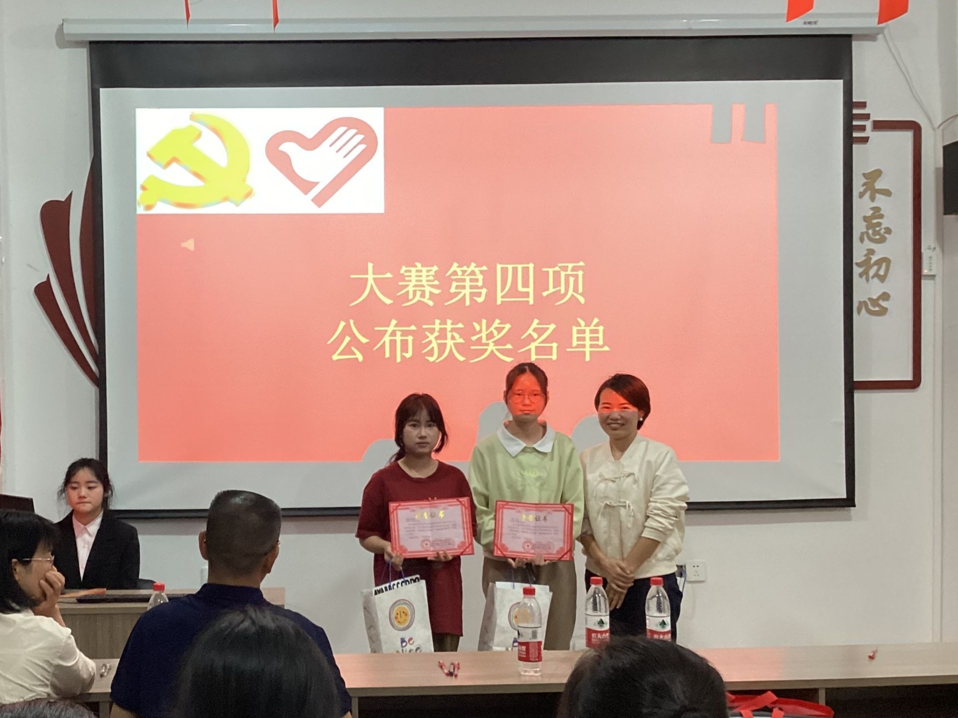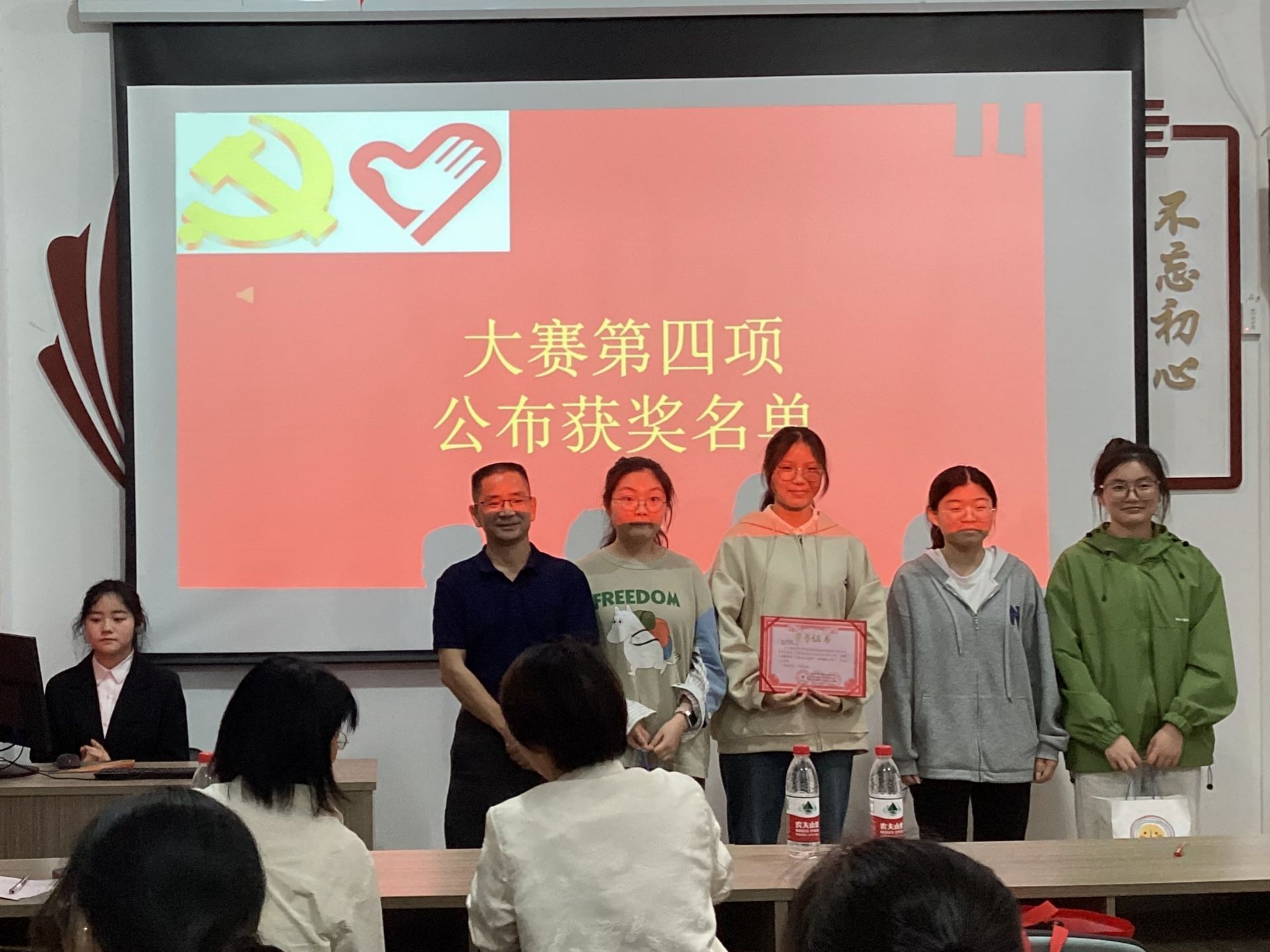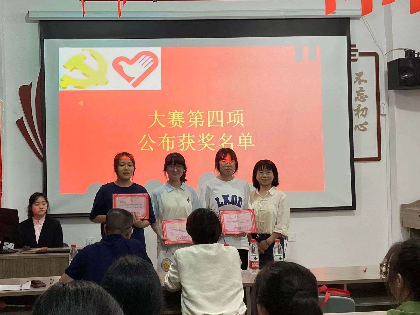 本次比赛共有四项流程。大赛第一项,由主持人吕梦妮介绍到场嘉宾并宣布比赛开始。大赛第二项,参赛选手依次上台展示并介绍作品,此次共有六组选手参与比赛,她们从不同的角度讲述了以钱学森、邓稼先为代表的科学家团队在原子弹研发中的艰苦付出以及中国原子弹的曲折发展历程,每一组作品展示完毕都能迎来在场观众的热烈掌声。大赛第三项,由嘉宾老师做比赛总结,首先是曹金萍老师表达了对原子弹工作者们的敬佩,并对本次活动的举办意义表达了赞扬,之后由刘佳萍老师对各组选手的精彩表现做出了点评,提出了许多宝贵意见。大赛第四项,公布获奖名单,由外国语学院青年志愿者协会指导老师江双莲老师为三等奖获得作品《两弹一星万古长青,爱国情怀永驻人间》,《学习“两弹一星”精神,追求远大理想》和《弘扬“两弹一星”精神,争做时代好青年》颁奖并合影留念,由外国语学院党委委员、学生英语党支部书记曹金萍老师为二等奖获得作品《无双国士,两弹工程》和《中国巨响,震惊世界》颁奖并合影留念,由外国语学院党委书记刘佳萍老师为一等奖获得作品《两弹一星凝国梦,青春星火筑新程》颁奖并合影留念。最后,嘉宾、选手以及工作人员全体合影留念。至此,此次活动圆满结束。