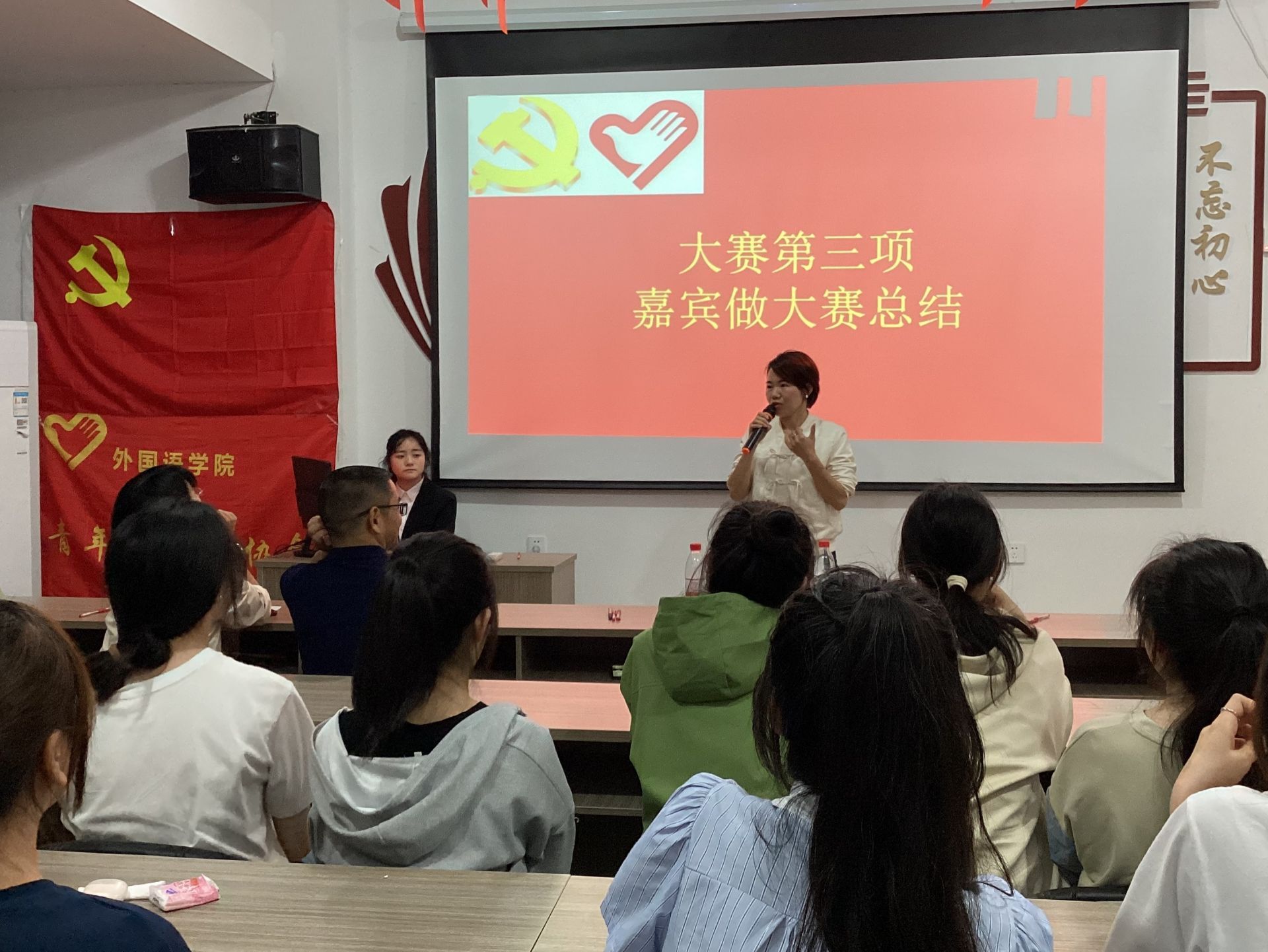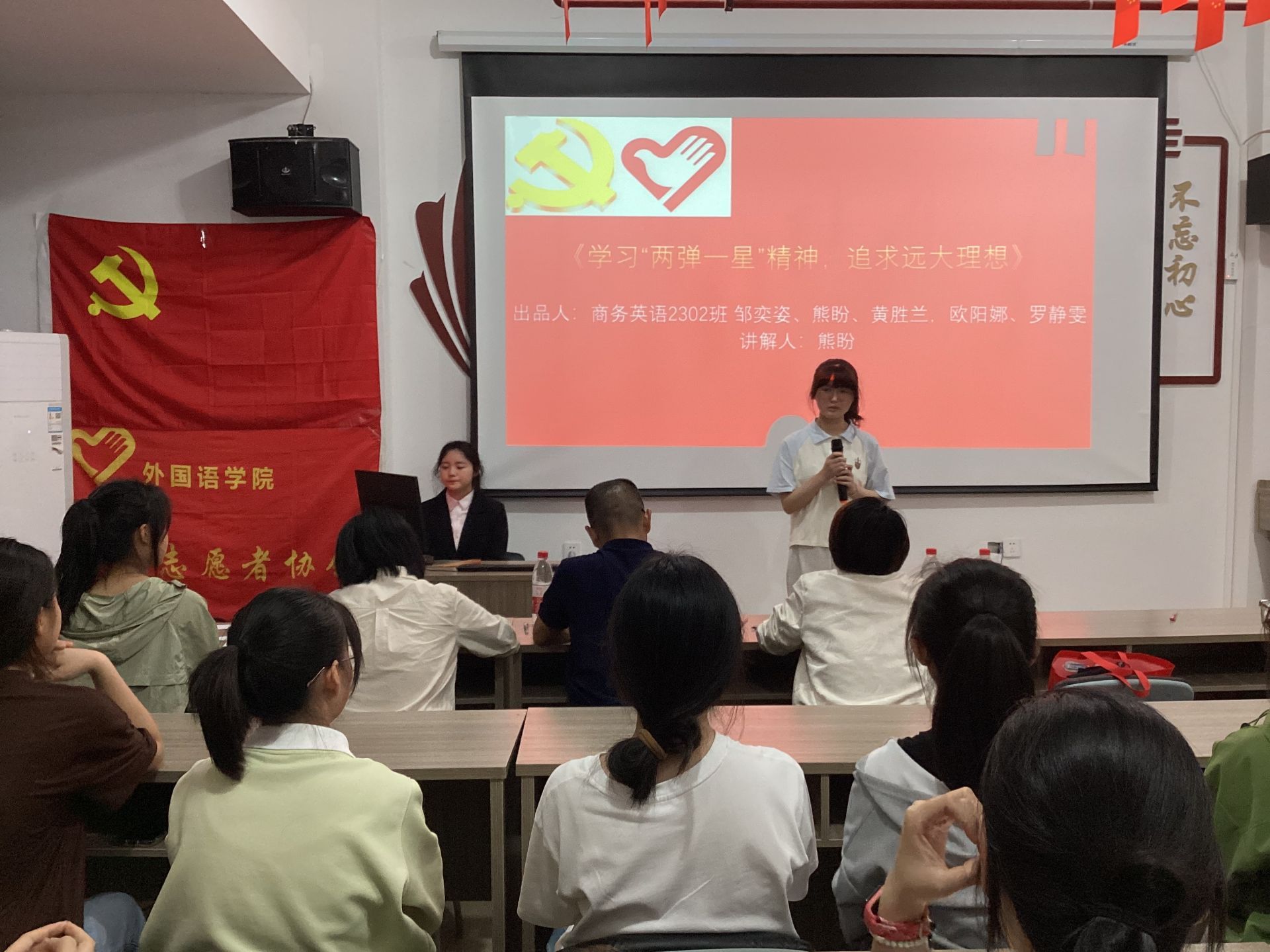 为了追溯红色记忆,传承和弘扬两弹一星精神,纪念中国第一课原子弹成功爆炸60周年,外国语学院青年志愿者协会与外国语学院学生英语党支部和学生商务英语党支部于2024年4月24日晚上7:00于18栋学生社区共同举办了“两弹一星”微视频大赛活动,参加本次活动的嘉宾有萍乡学院外国语学院党委书记刘佳萍老师,外国语学院党委委员、学生英语党支部书记曹金萍老师,外国语学院青年志愿者协会指导老师江双莲老师,外国语学院青年志愿者协会会长邱敏,以及学生党支部负责人陈婷婷。