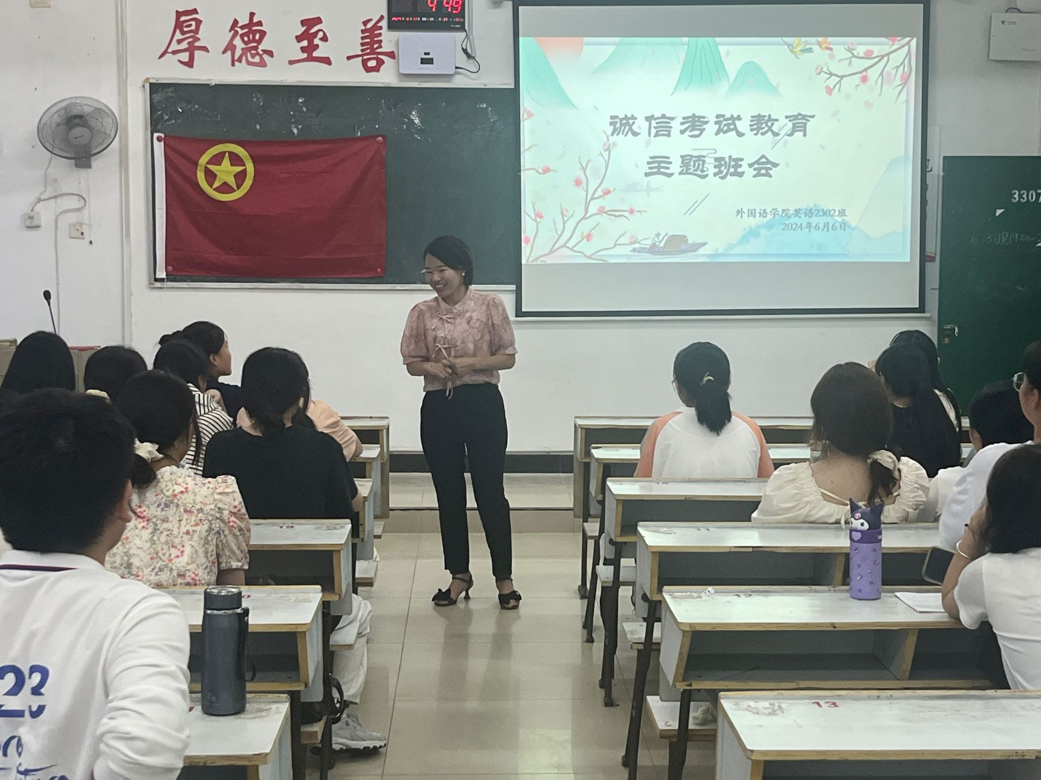 为了加强学生思想道德建设,全面推进素质教育,营造“以德修身,明礼诚信,诚实为本,信誉为重”的校园氛围,外国语学院英语2302班于2024年6月13日在英华楼3501教室召开“诚信考试”主题班会,此次活动由班长裘佳美主持,英语2302班全体同学参与。
