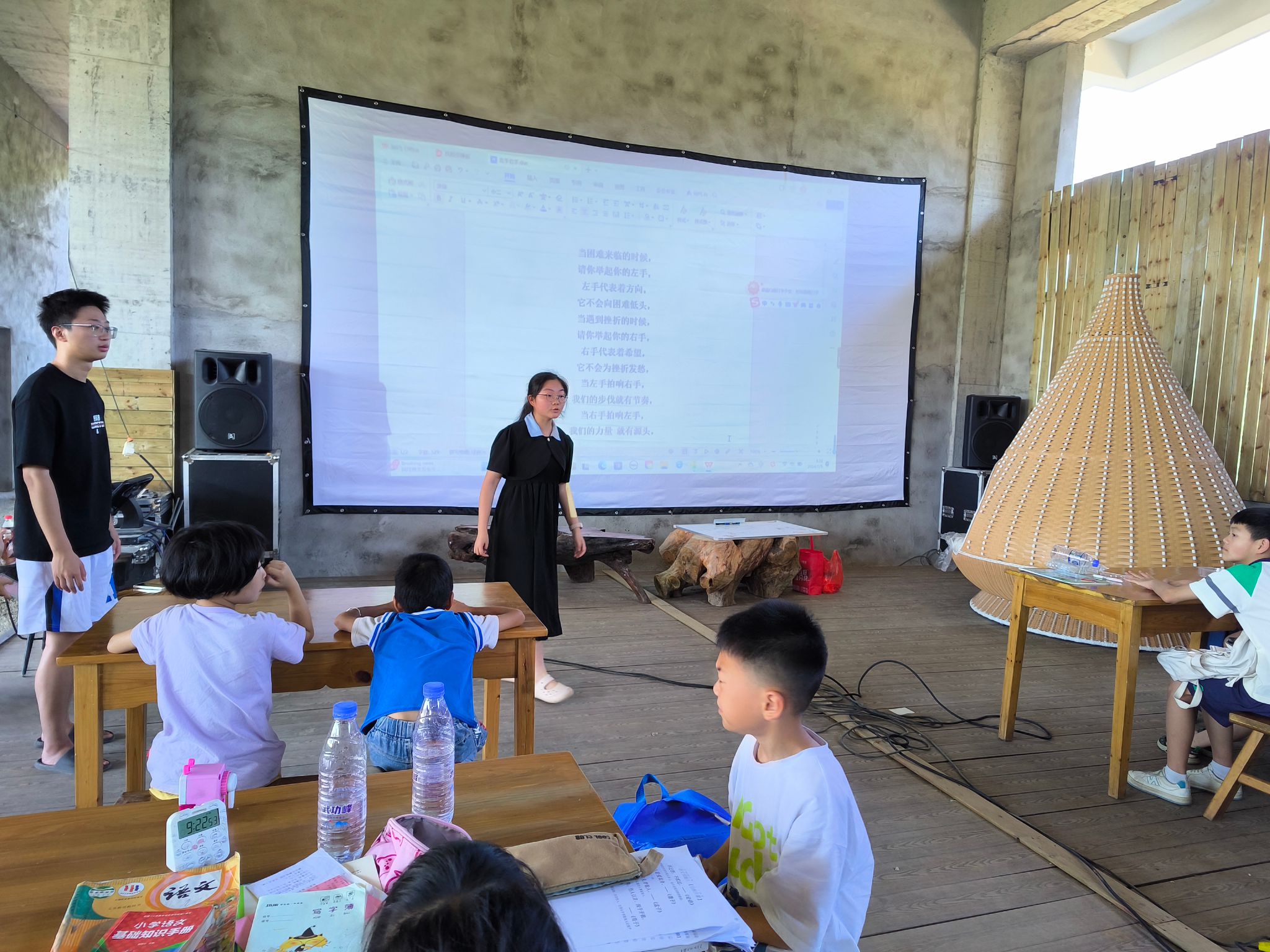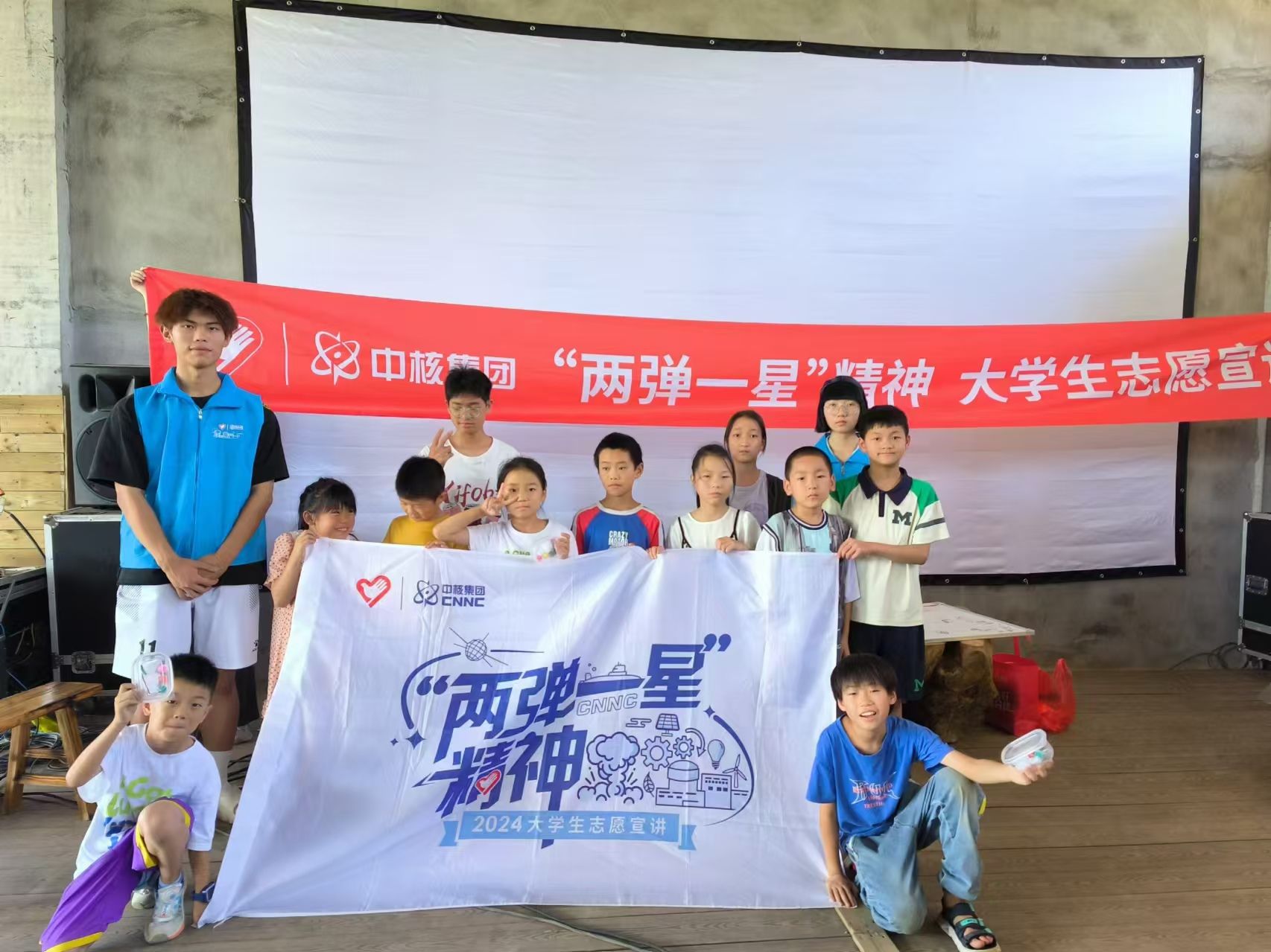孩子到来后,支教老师组织点到,确保孩子们安全到达。随后,便开始了第一节课——集训课,支教老师为大家温习“少年警”体验日所学的内容,并且教大家新动作,蹲下、敬礼。集训课不仅有助于增长大家的精气神,舒展锻炼身体,还是为了教导他们遵守课堂纪律。音乐课上,支教老师教大家一起唱“左手右手”,配上肢体动作,现场气氛活泼有趣,好似童年陪伴成长的动画中的小伙伴又出现在身边。“两弹一星”精神宣讲课,也是一场知识竞赛,老师给孩子们下发资料,讲明竞赛规则,并给予十五分钟的准备时间,时间一到,竞赛正式开始。老师在台上念读题目,孩子们把答案写在答题纸上,有的孩子游刃有余、认真书写,有的孩子迷茫着急、抓耳挠撒。竞赛结束后,孩子们把答题纸交给老师批改,批改结果出来后,老师为前三名的同学准备了奖品,也为其他的孩子准备了礼物,鼓励他们继续加油。“两弹一星”精神是中国人民宝贵的精神财富和动力源泉,而儿童作为祖国的未来,让他们了解此精神内涵,铭记历史,传承精神,助力成长成才,为实现中华民族伟大复兴的中国梦而努力奋斗。朗诵课上,老师带大家回顾昨天所学内容,并将孩子们不认识的生字再逐一教学,让孩子们深入领略中国话的魅力。