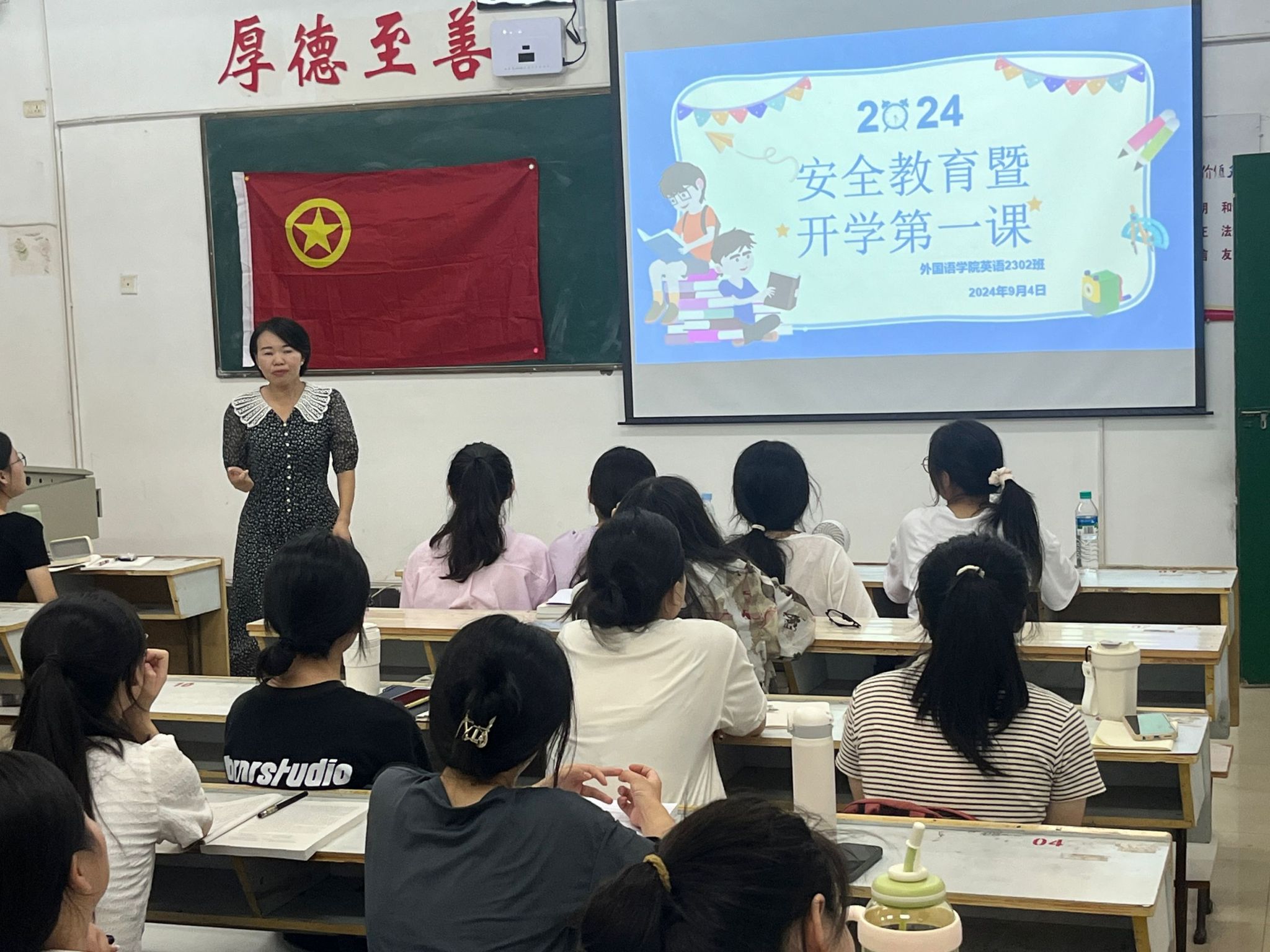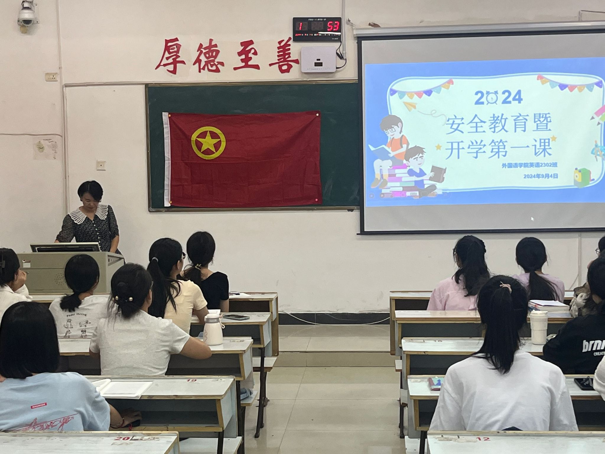 为了加强学生对各类安全问题的认知,提高学生对危险因素的识别能力,从而形成积极的安全意识,外国语学院英语2302班于2024年9月4日在英华楼3301教室召开“安全教育”主题班会,此次班会由辅导员曹金萍主持,英语2302班全体同学参与。