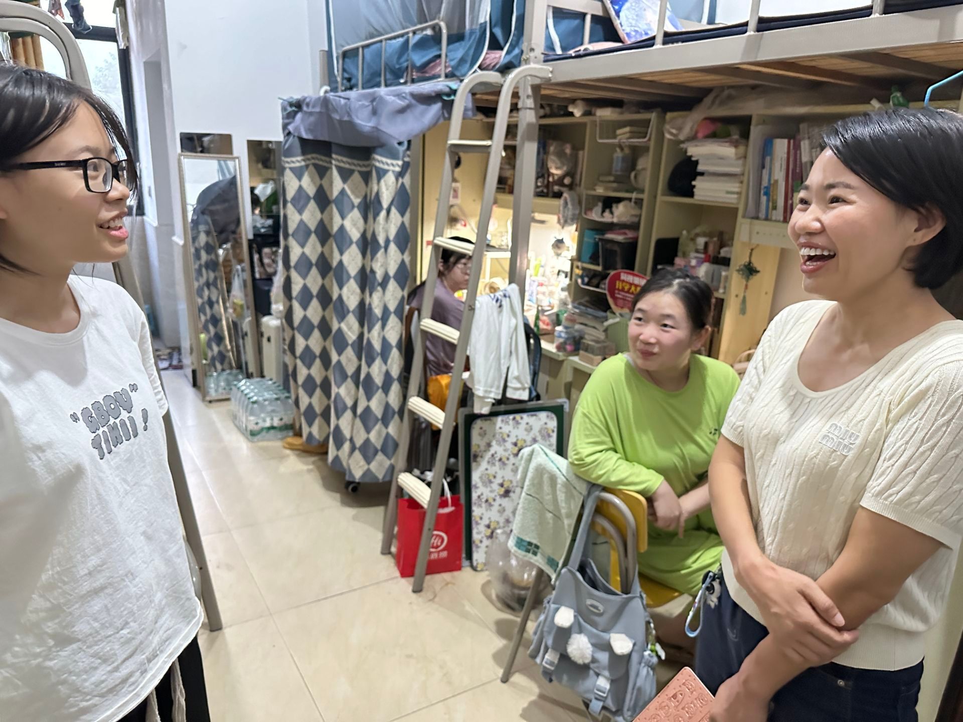 曹金萍老师在新生军训前去到寝室看望新生。见到一张张新面孔,曹老师的喜悦溢于言表。她不断向同学们介绍寝室的设施,叮嘱她们要多加注意安全。老师指出,在大学里大家将与信任敬佩之人并肩同行,将邂逅期待已久的美好时光,未来的路或许是艰难的,抑或许是撒满阳光的,所以需要尽快适应新生活,以饱满的姿态迎接未来的所有。军训即将开始,同学们须做好思想准备,虽然军训生活可能很难,但是坚持的你们身上闪烁着光芒。