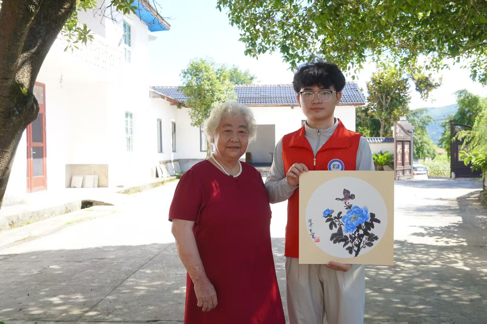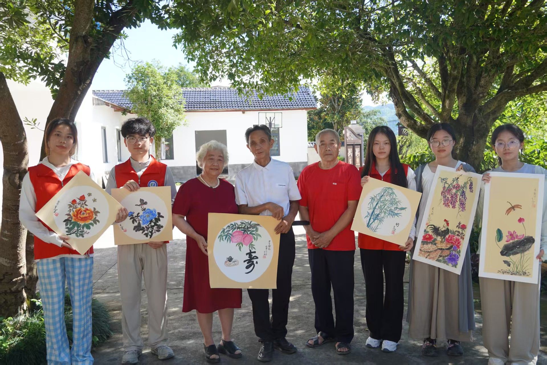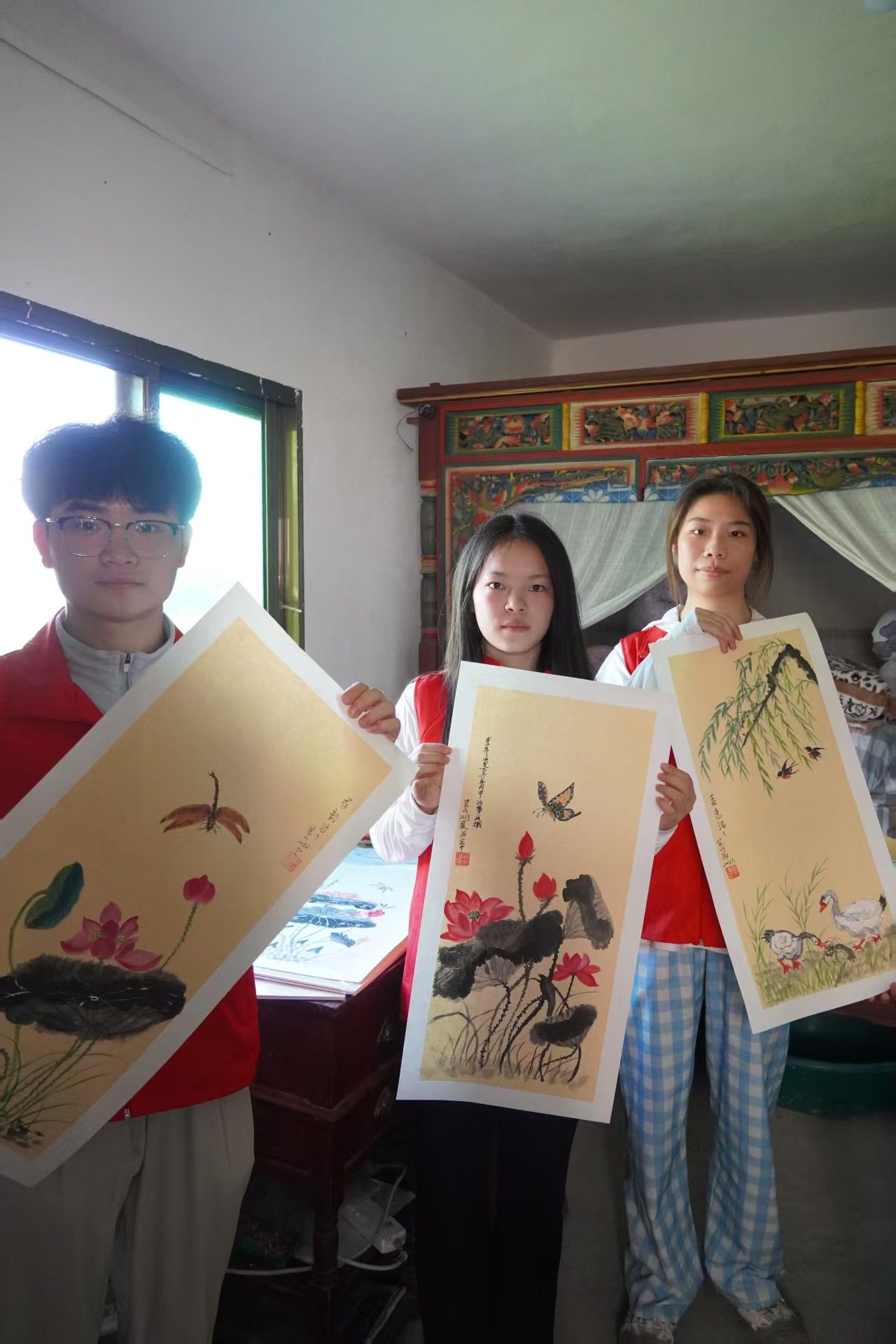 在开展书法支教的同时,团队也在村中老人的带领下,共同寻访村中的墨香匠人。在聂政光爷爷家,志愿服务团成员邂逅了篆书的魅力。走访严小山奶奶家时,墙上梅兰竹菊水墨画跃入眼帘,经交流得知,这些是奶奶退休后自学创作的作品。志愿者们围站欣赏,听奶奶分享水墨技法,讲述创作时对“四君子”高洁品格的理解,传统文化在交流互动中,悄然流淌进每个人心里。离别时,奶奶赠予每位志愿者一副自己画的的水墨画,成为这段文化交流最美的纪念。