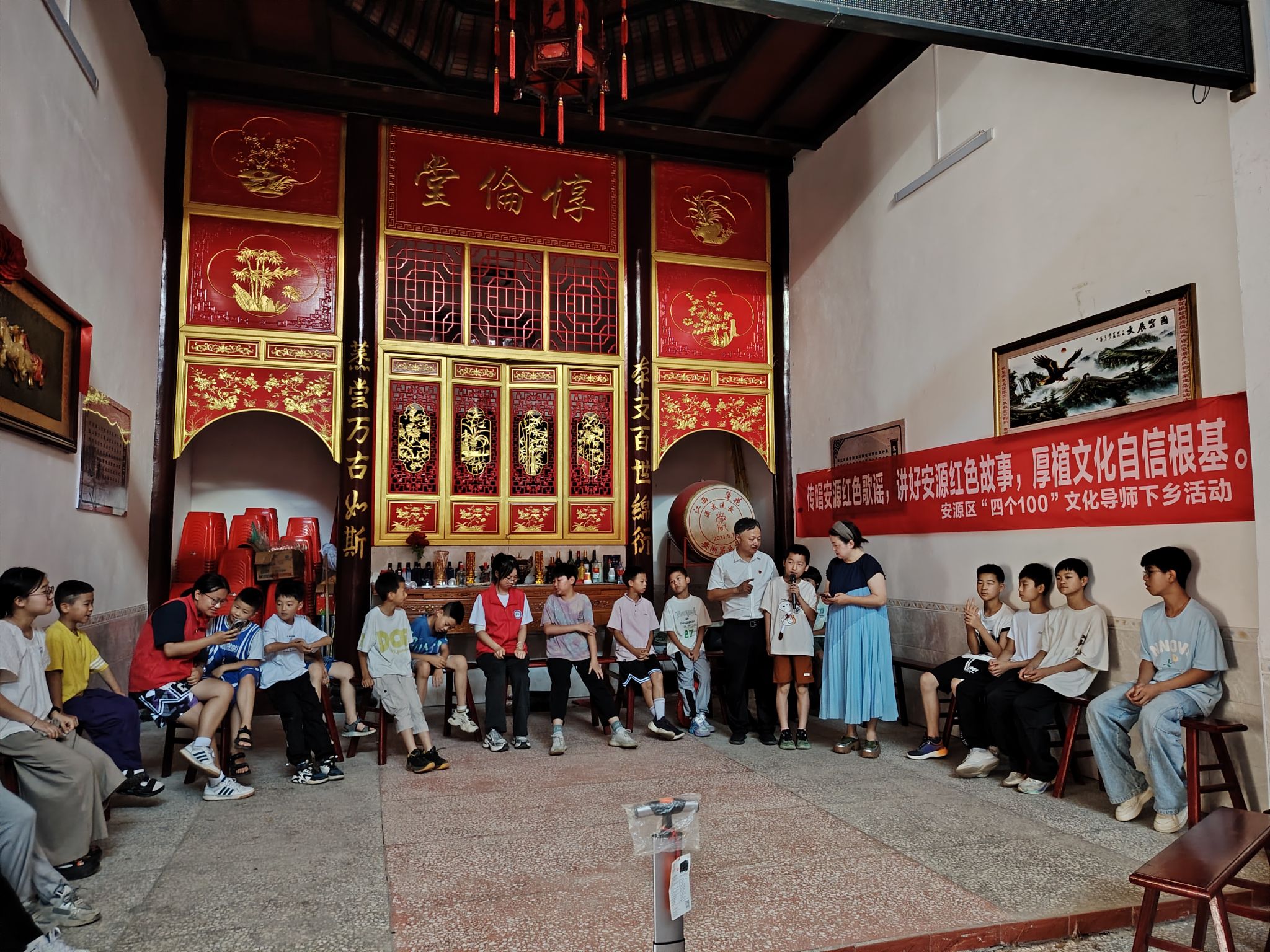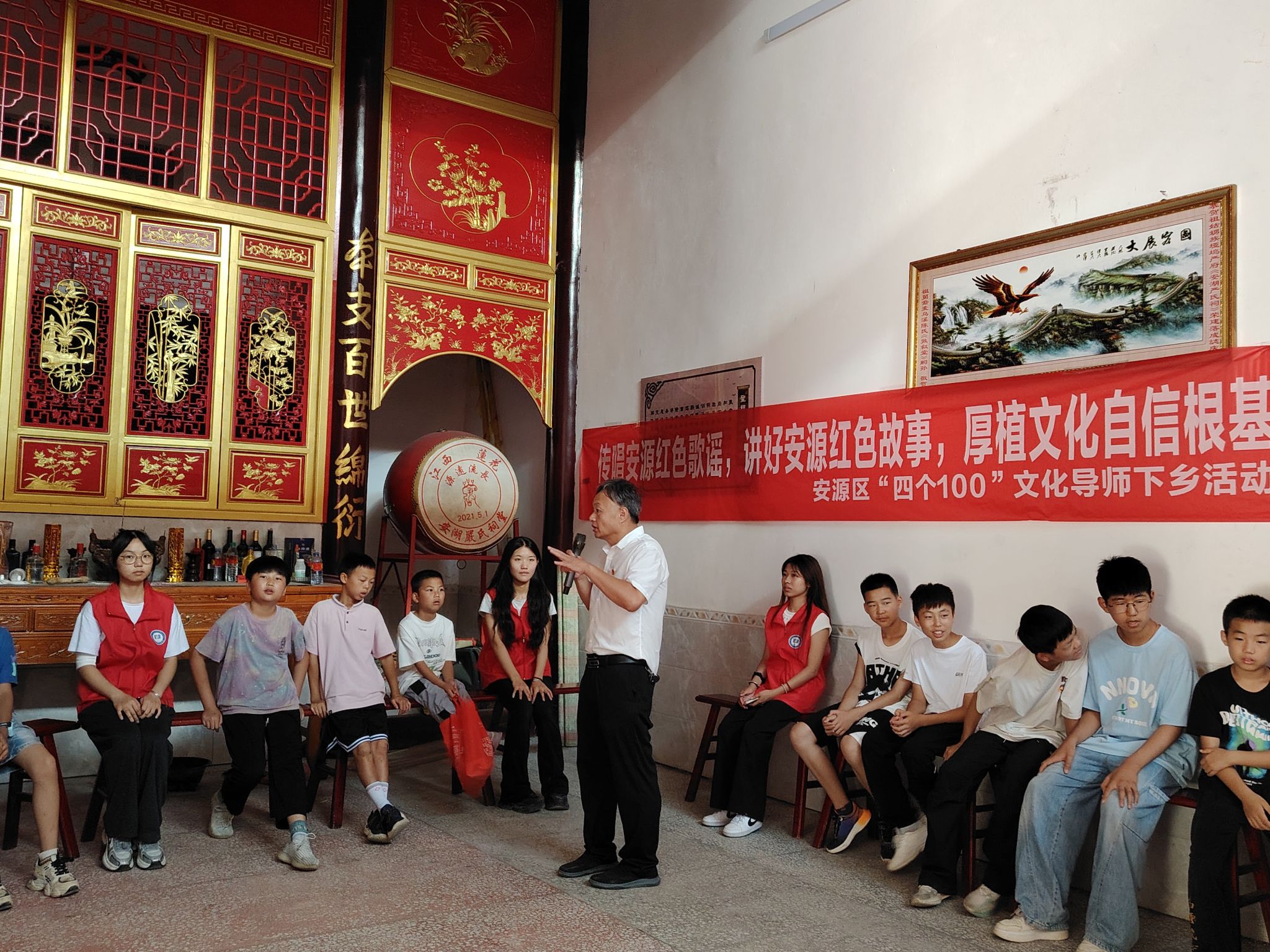 活动开始,糜文宇导师以“少年进炭棚”的经典歌谣为切入点,深入浅出地讲解了《张家湾的红灯》的历史背景和深远意义,诠释了语言工作者独有的讲述技艺,让革命故事焕发新的生命力。黄瑶老师将安源红色故事的丰富情节和深刻内涵娓娓道来,带领学生们“穿越时空”,见证先辈们艰苦卓绝的抗争;甘璐琼老师则通过现场演唱和教学,演示了歌谣独特的唱腔与方言韵味,让稚嫩而坚定的歌声在宗祠内回荡,传递着对革命先辈的缅怀与对红色精神的传承。