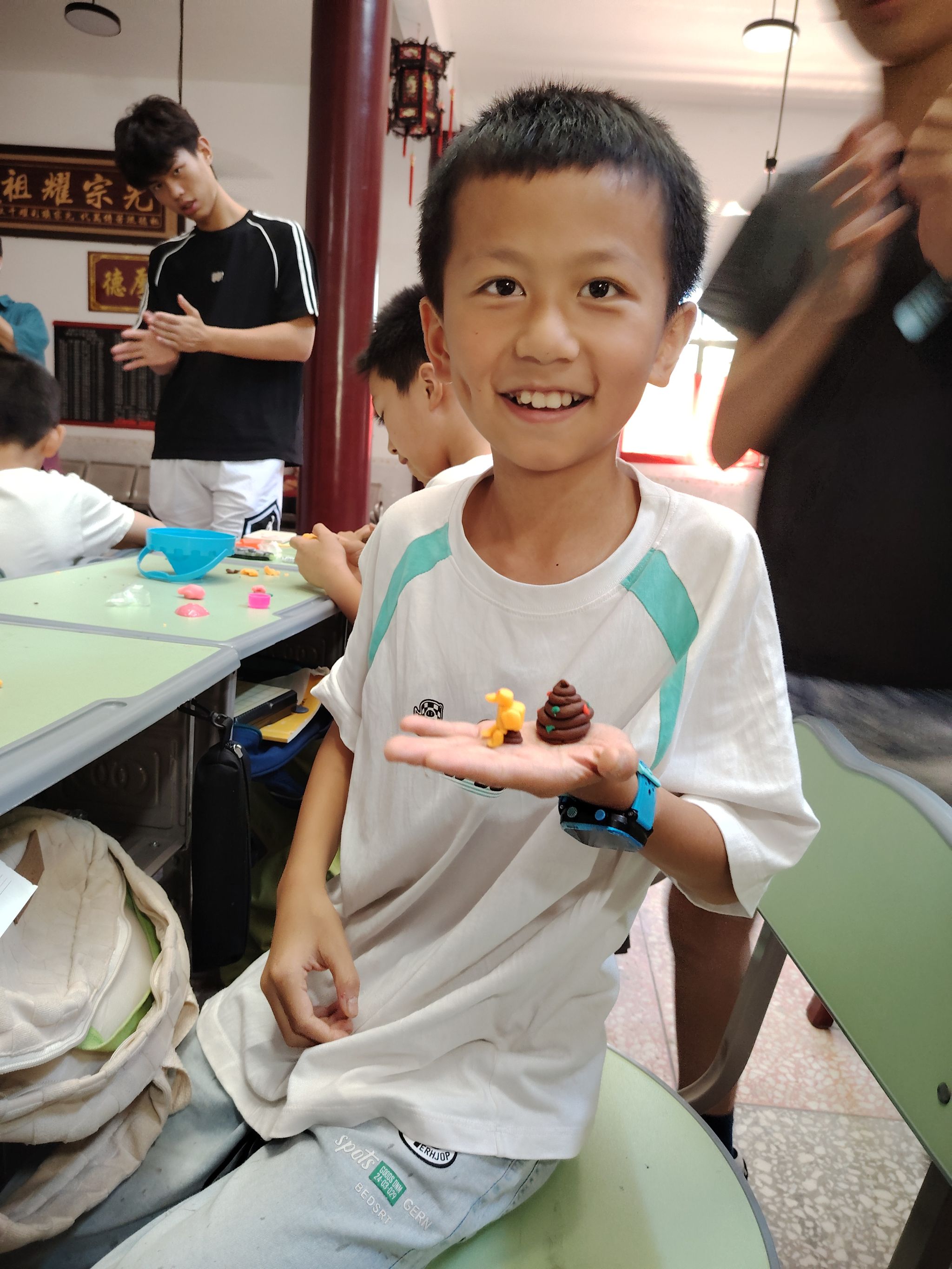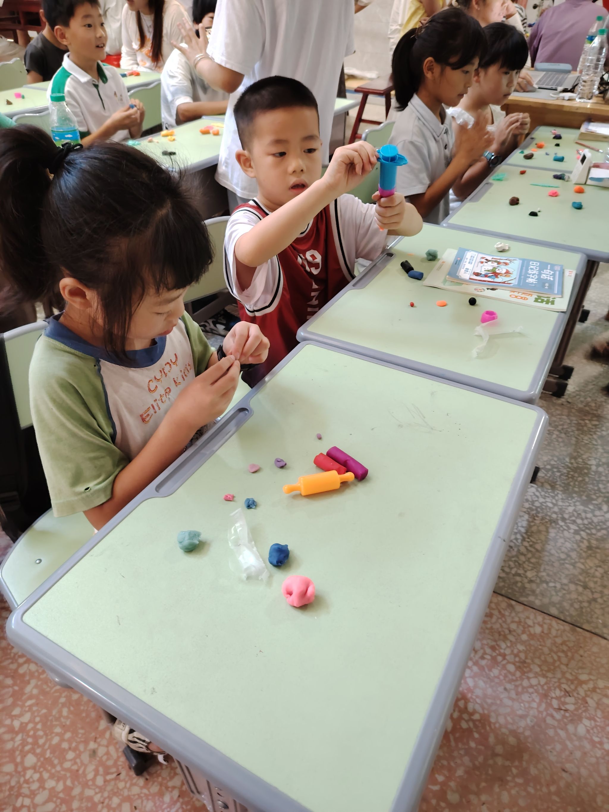 理论学习结束后,志愿者们将彩泥和模具一一分发到孩子们手中,并鼓励大家大胆创作。拿到材料的孩子们瞬间欢呼雀跃,迫不及待地埋头创作起来。志愿者们则穿梭在课桌间,时而帮孩子调整彩泥形状,时而手把手教他们刻画细节。孩子们一边捏着彩泥,一边叽叽喳喳地交流着,眉眼间满是藏不住的兴奋。有的小朋友皱着小眉头,专注地雕琢细节;有的则高高举起半成品,迫不及待地向身边人展示。很快,课桌上便摆满了童趣十足的作品:憨态可掬的小动物、五彩斑斓的花朵,还有充满奇思妙想的创意造型。欢笑声、讨论声交织在一起,让整个教室都充满了温暖而欢快的氛围。这些浸润着童心的面塑作品,不仅是艺术启蒙的生动注脚,更是传统文化基因在新时代少年血脉中悄然传承的鲜活见证。