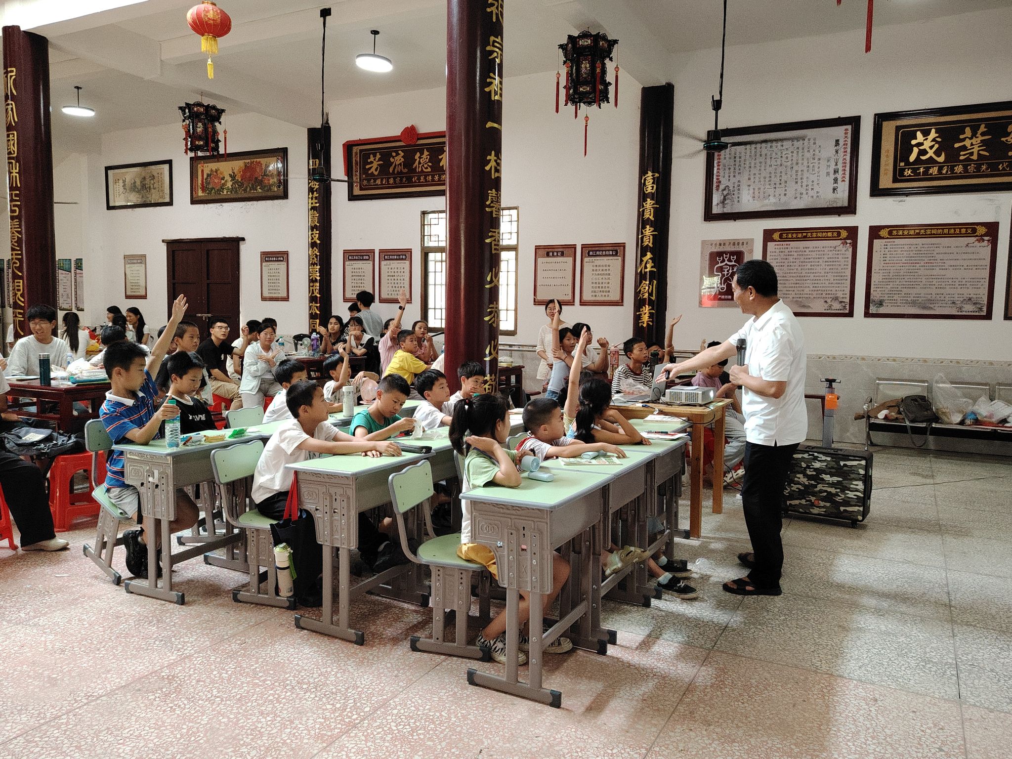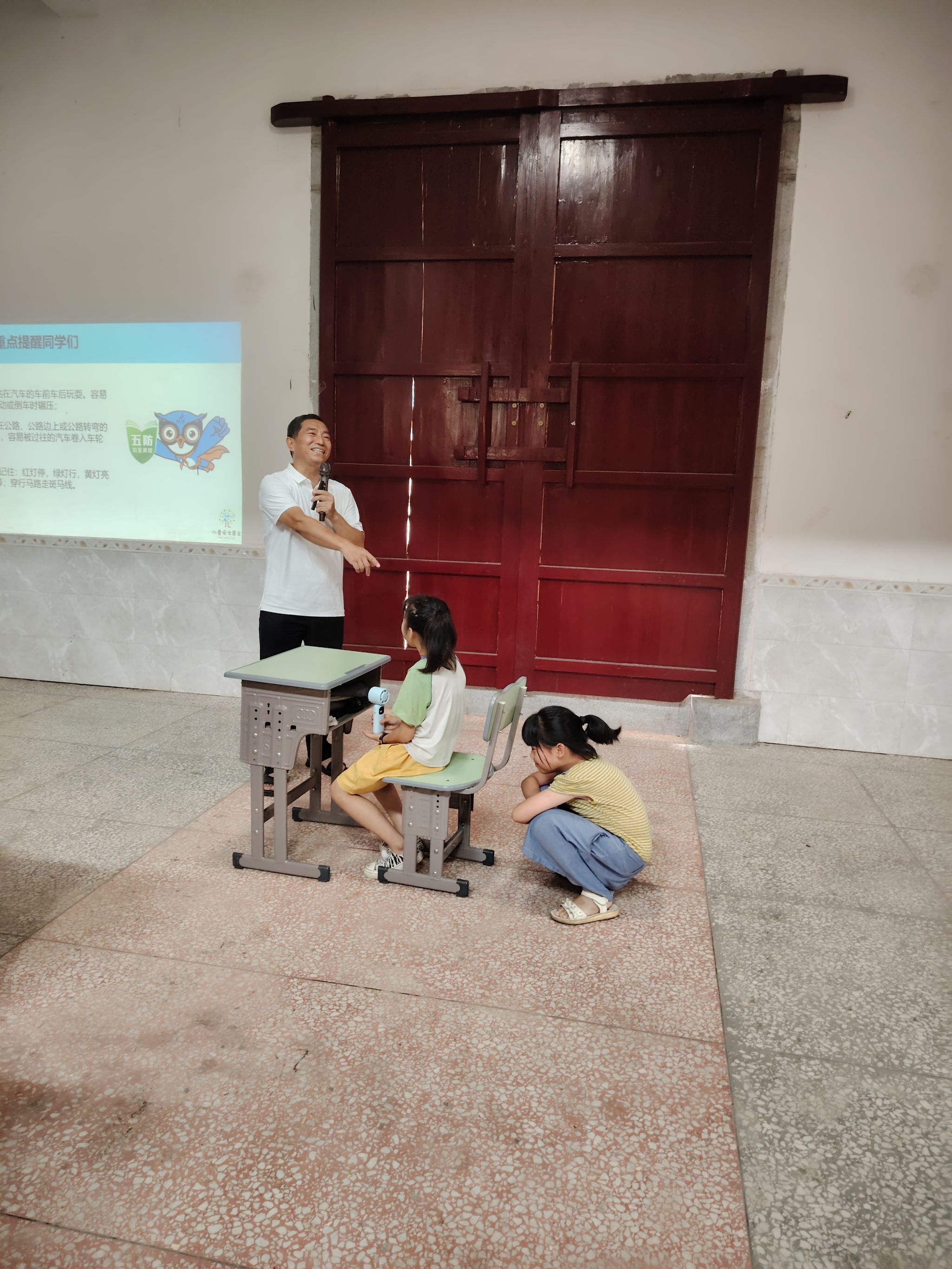 课堂上,王卫民老师化身亲切的“安全导师”,从防溺水、防火灾、防交通事故、防拐卖、防性侵五个关键维度展开讲解。每切入一个主题前,他都会抛出充满启发性的思考问题,如“发现同伴溺水该怎么办”“遇到火灾如何逃生”,迅速点燃孩子们的求知热情。一双双稚嫩的小手高高举起,孩子们踊跃回答,此起彼伏的童声让祠堂内洋溢着热烈的学习氛围。为了鼓励孩子们积极参与,王老师还准备了美味的小零食作为奖励,答对问题的孩子接过零食时,脸上绽放出自豪又开心的笑容。此外,为了让抽象的安全知识变得直观易懂,王老师精心设计了现场互动环节。在讲解急救知识时,他邀请一位学生模拟拨打120电话,通过一问一答的方式,引导孩子清晰说出事故地点、人员状况等关键信息;在交通安全知识讲解中,他巧妙地将课桌当作车辆,安排一位同学扮演司机坐在“驾驶位”,另一位同学则蹲在“司机”视线无法触及的角落,生动展示车辆视野盲区的危险,让孩子们对交通安全有了更深刻的认识。生动的互动与实践,让安全知识真正“活”了起来。