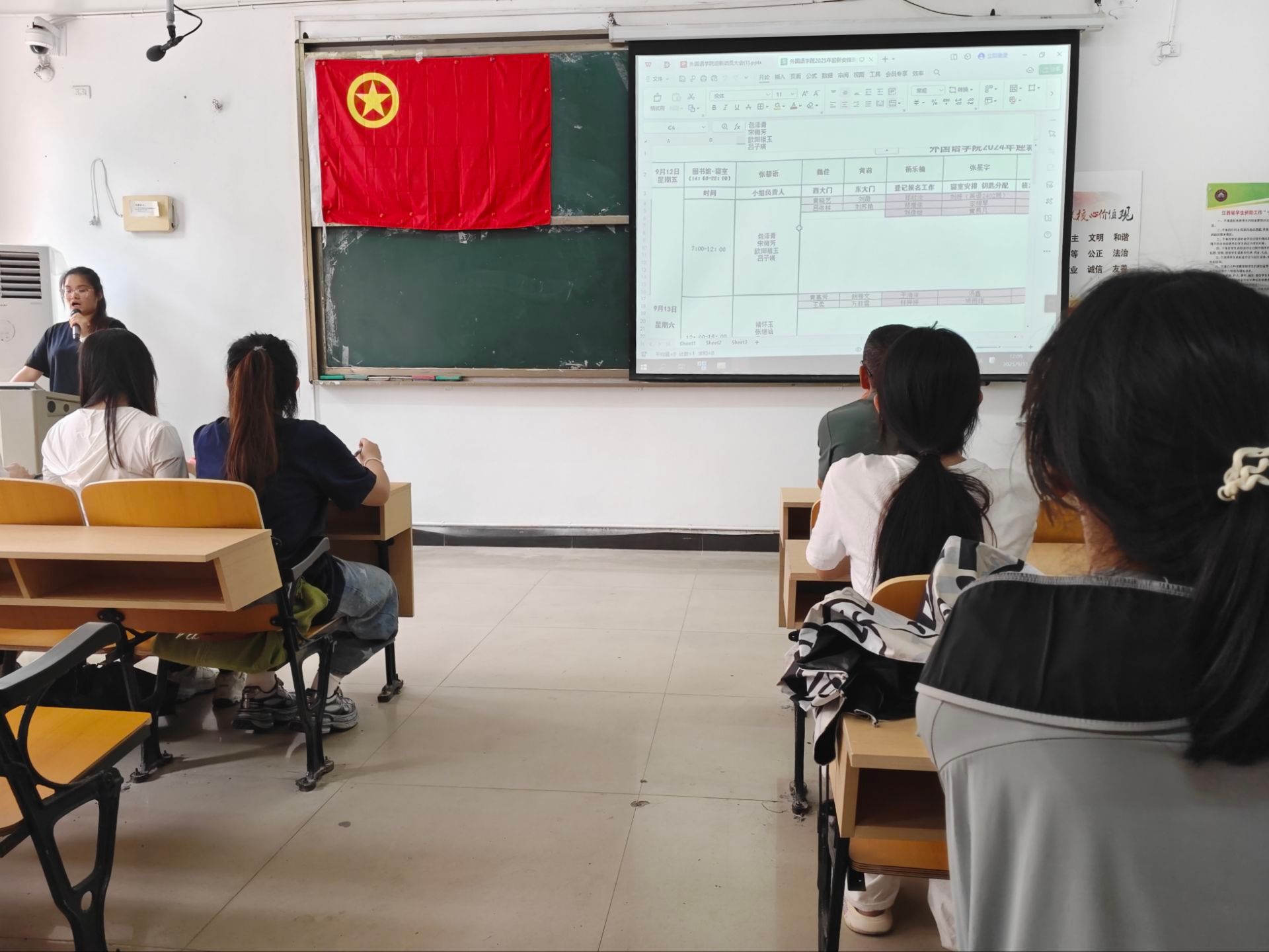会议开始,学生会主席团助理张藜语细致拆解迎新流程,为迎新工作划定了每个人的工作安排。在流程安排上,她明确迎新当天将设置“校门口报到引导”“报到处资料审核”“生活区宿舍帮扶”三大核心岗位,每个岗位配备3至5名学生干部,要求全员提前熟悉流程、模拟演练,确保新生无需多跑、无需久等,“一站式”高效完成入学手续。服务层面,学院精心筹备迎新地图和手册,内含标注教学楼、食堂、图书馆位置的校园地图;同时特设帮扶提行李者,更针对家庭困难、行动不便的新生,安排专人一对一全程陪同,让新生倍感温暖。细节把控上,她强调全体志愿者需统一穿戴印有外院标识的短袖、穿好红色马甲,提前练习“同学你好,我是外院迎新志愿者”“有需求随时叫我”等礼貌用语,同时做好应对天气变化、人员拥挤等突发情况的预案,以规范化服务展现外院风貌。