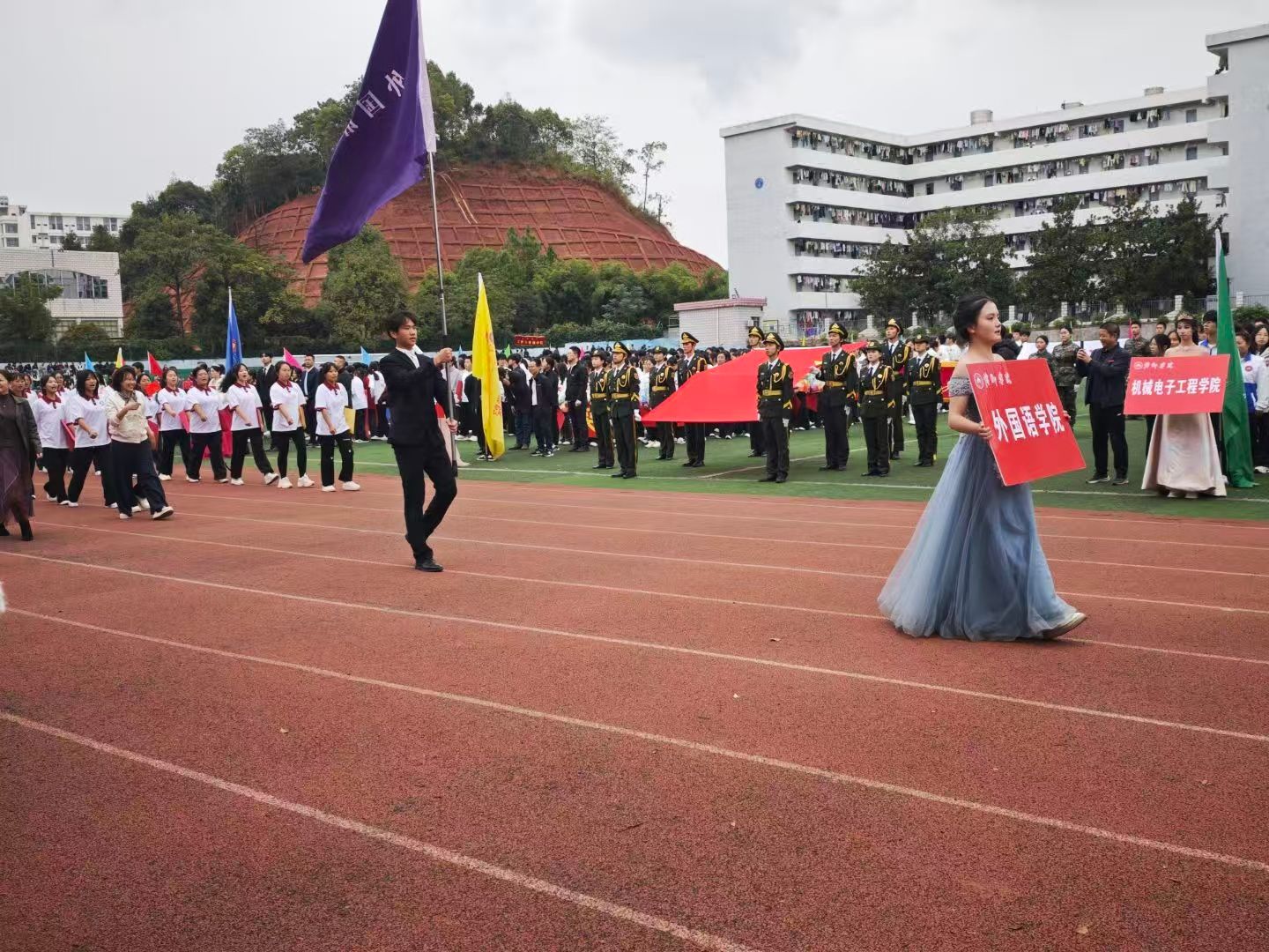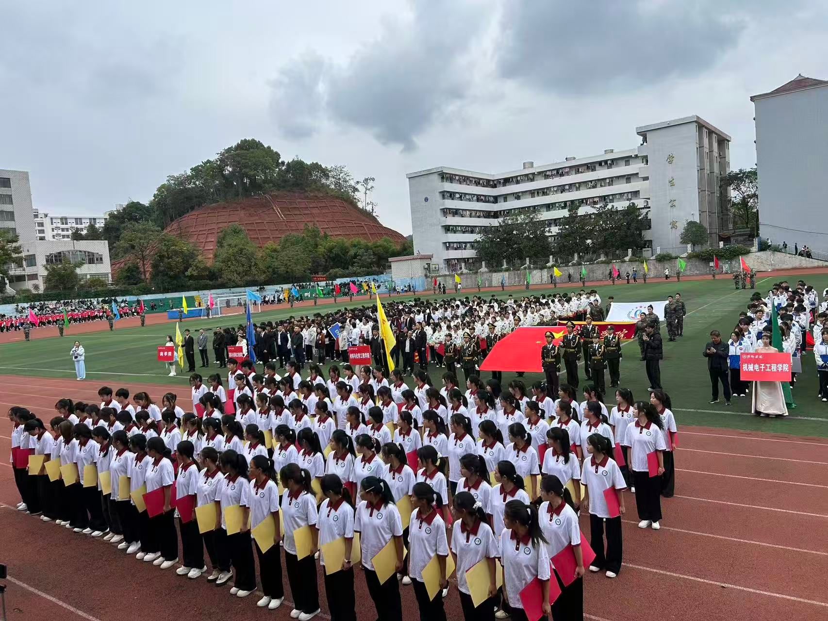 这场开幕式不仅是双运盛会的起点,更是学校精神风貌与文化内涵的集中展现。校长的讲话为全体参与者注入了奋进动力,各院方阵的入场彰显了院系特色与集体凝聚力。这场运动会不仅点燃了赛事的激情,更让红色基因与青春活力深度融合,为全校师生搭建了凝聚情感、共筑校园文化的平台,也为接下来的赛事奠定了积极向上的基调,让拼搏、团结、爱国的精神在校园中生根发芽。
