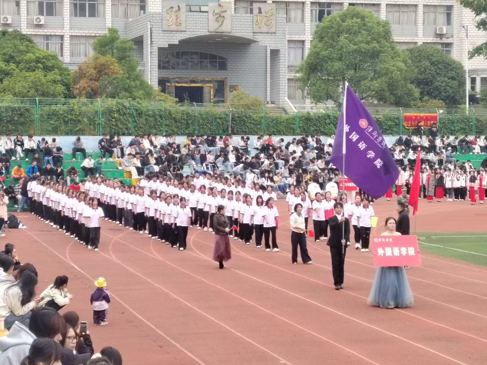 开幕式流程丰富有序,每一个环节都饱含深意。首先,校长刘林芽将发表讲话,既回顾了学校体育教育与红色文化建设的成果,也为全体师生送上寄语,凝聚起拼搏向上的力量;随后,各学院学子组成的方阵依次入场,其中外国语学院方阵尤为亮眼——学子们身着整齐院服,步伐整齐划一,他们以昂扬的姿态迈过主席台,“外语辉煌、青春激昂、外院长青、势不可当”口号响亮有力,既展现了外院学子的国际视野,也彰显了青春的蓬勃朝气;最后,随着宣布运动会正式开始的指令下达,现场掌声与欢呼声交织,双运盛会的大幕正式拉开。