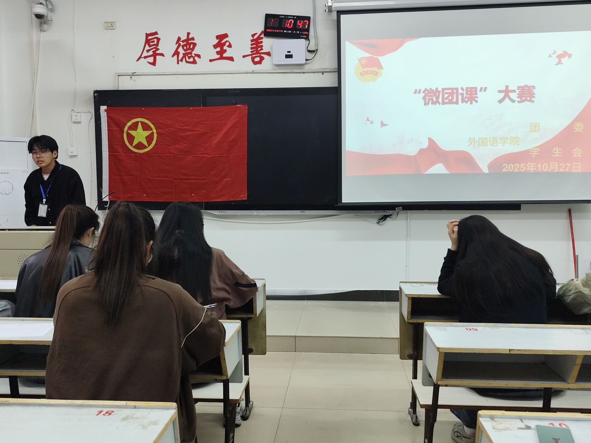 为从青年视角出发,以更鲜活的形式实现思想引领、为青年团员成长赋能,外国语学院于2025年10月27日16:10在英华楼3305教室开展“微团课”大赛。参与此次微团课大赛的嘉宾及选手包括外国语学院团委学生会23级主席团成员、24级主席团助理及十余名青年团员,这是滋养青春、凝聚力量的重要方式,为青年成长注入了源源不断的能量。