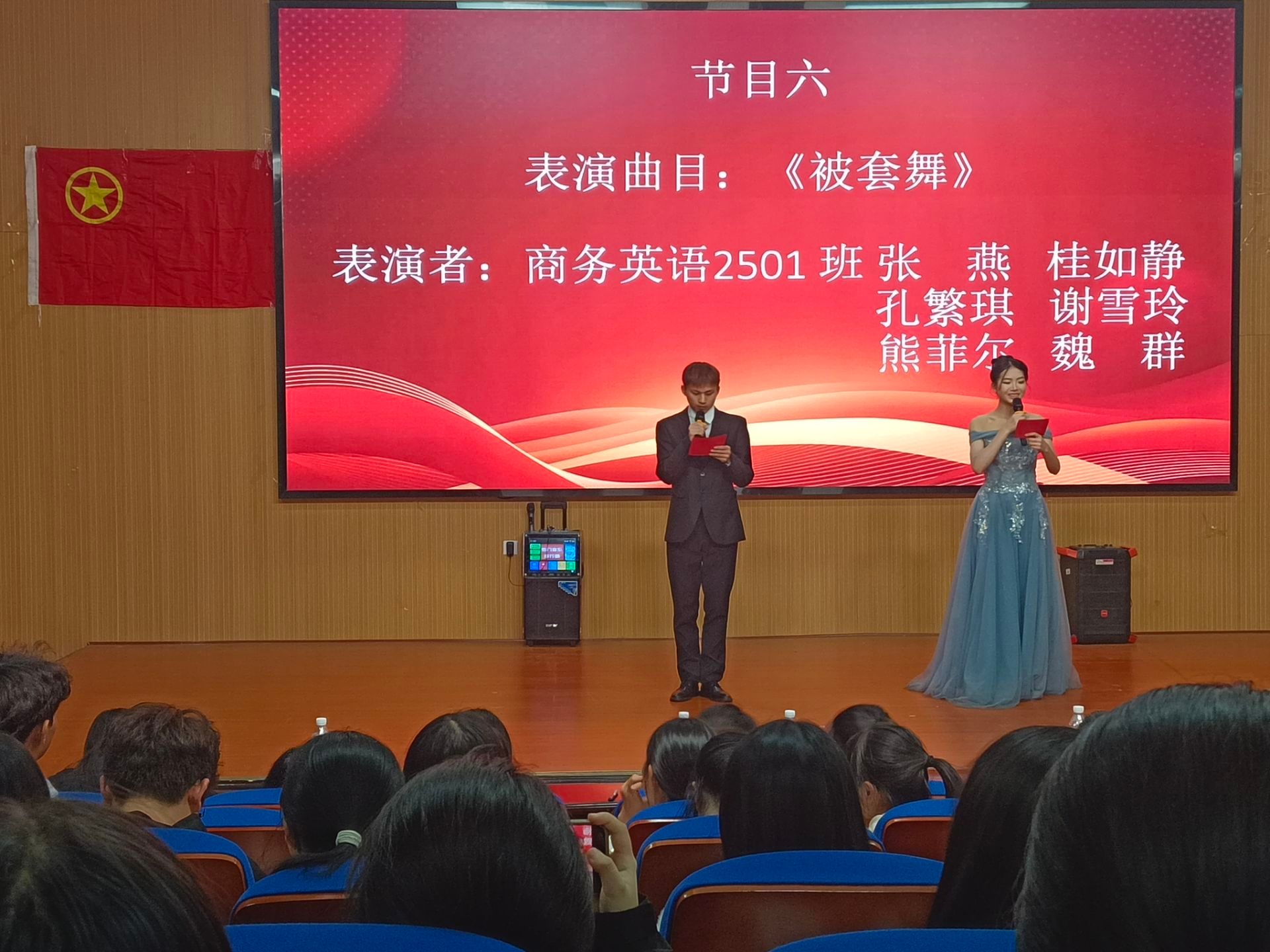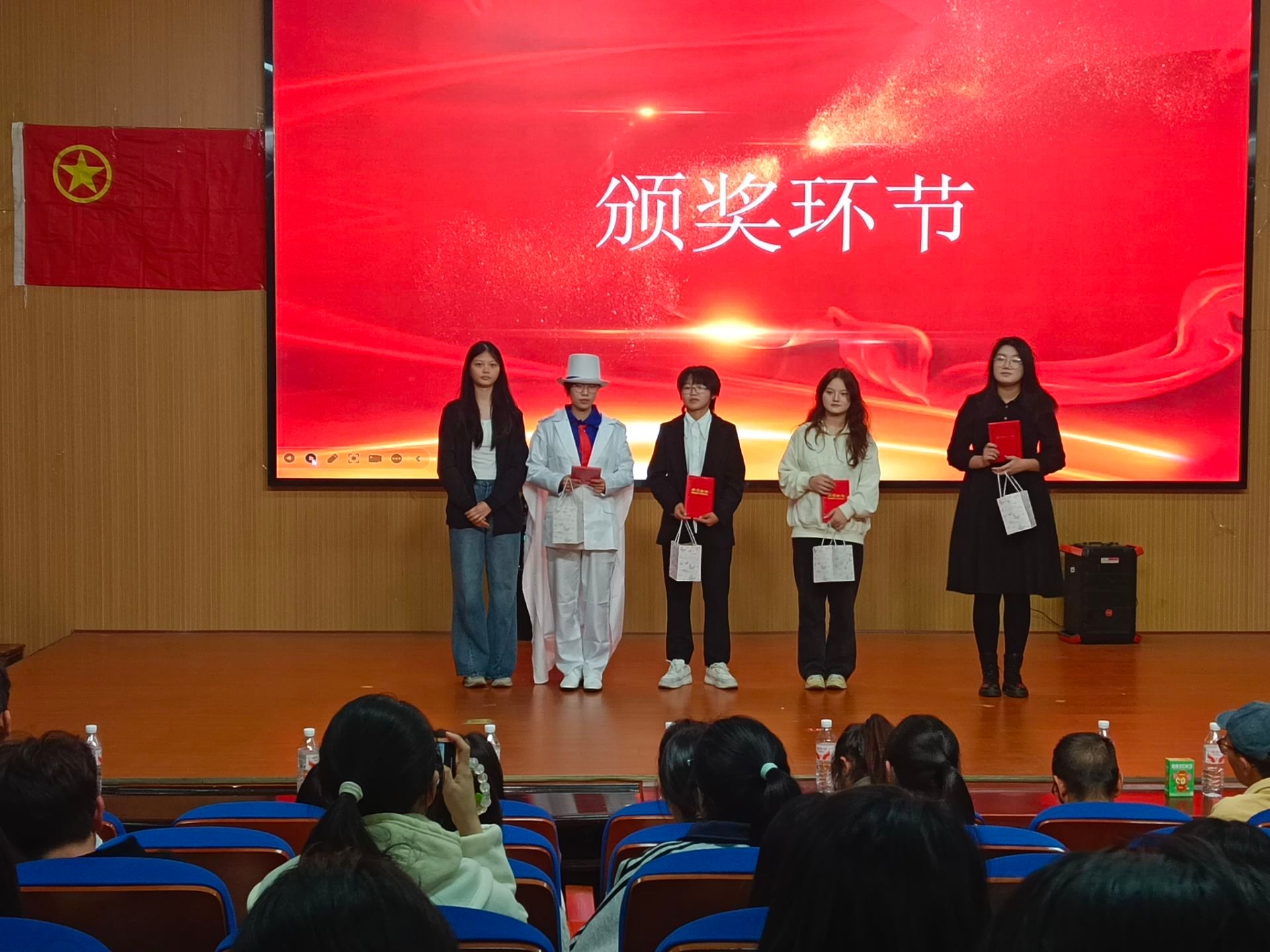 大赛在主持人的精彩开场中拉开帷幕,节目形式多样、内容精彩纷呈。商务英语2502班张丽清带来独唱《世界赠与我的》,动人歌声赢得阵阵掌声;商务英语2501班蒋紫涵、易雪婷、姜晚词、杨鑫滢联袂演绎《摇摆的菠萝仔》+《有点甜》,活泼风格瞬间点燃全场氛围;商务英语2503班刘瑾妍演唱英文歌曲《Try Everything》,在旋律中展现外院学子的外语素养;商务英语2501班张燕、桂如静、孔繁琪等表演的《被套舞》活力满格,将青春气息传递给在场每一位观众;商务英语2503班李星月带来的《蝴蝶》旋律优美,余韵悠长;多人合作呈现的《人间四月天》《雪distance》更是各具特色,为观众带来别样艺术体验。现场还设置“猜歌游戏”“反向指令小游戏”等互动环节,同学们踊跃参与、积极互动,现场欢笑与喝彩交织不断。随后,外国语学院党委书记刘佳萍老师上台讲话,对参赛选手的精彩表现给予高度肯定,同时鼓励新生在大学期间主动参与各类活动,在实践中拓展视野、实现全面发展。最后,大赛进入颁奖环节,嘉宾为获奖选手依次颁发荣誉证书与小礼品,这份认可不仅是对选手们才艺的肯定,更成为他们开启大学生活的一份温暖纪念。