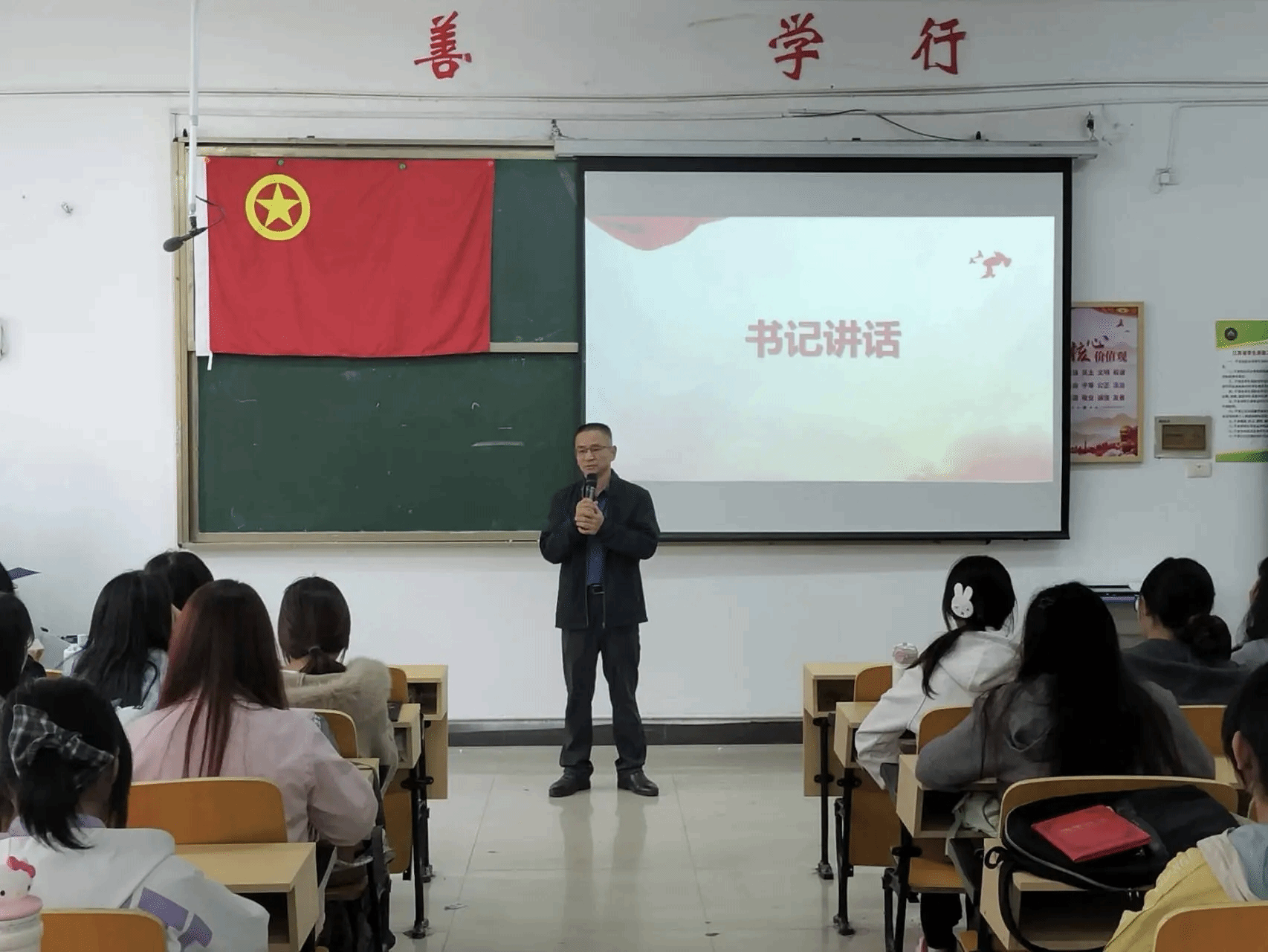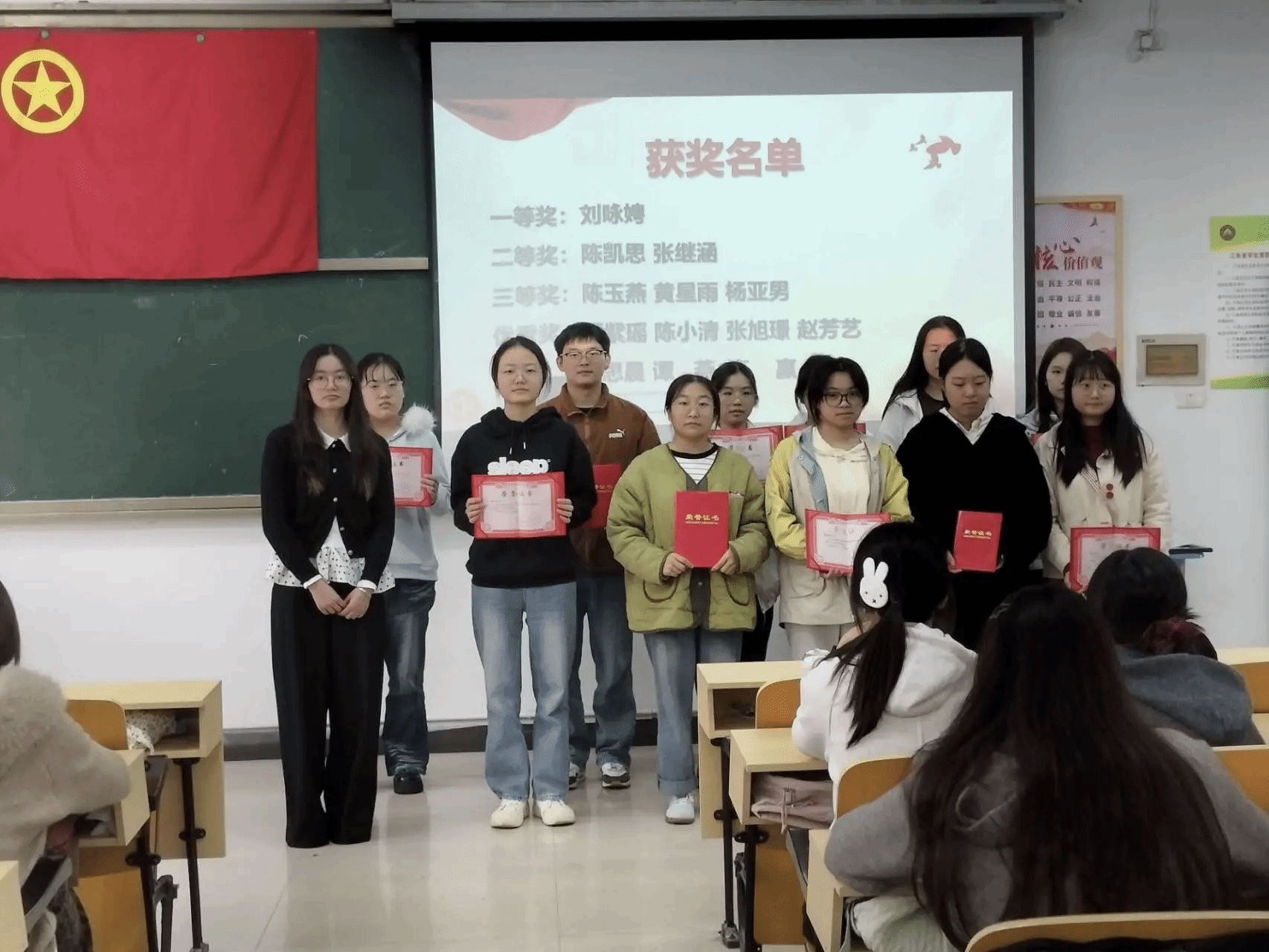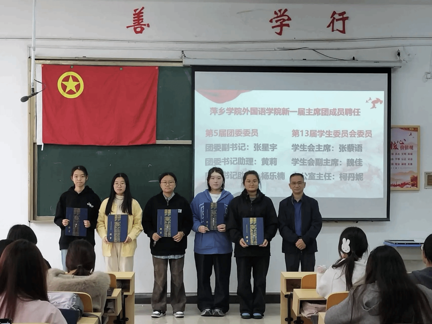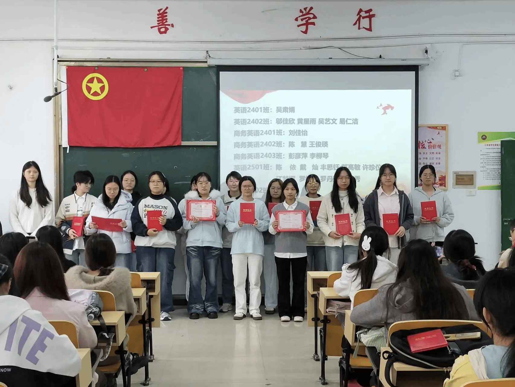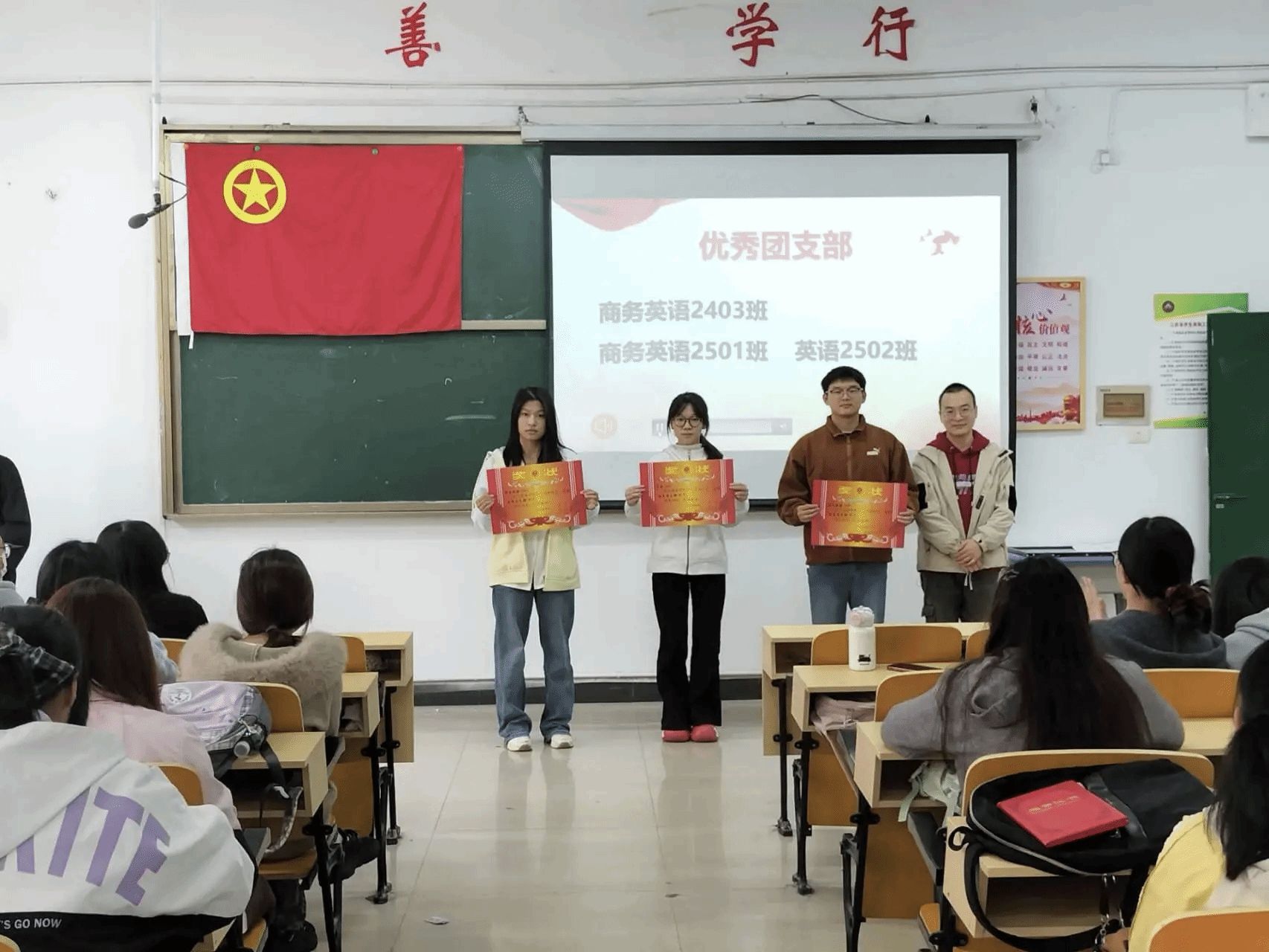 大会伊始,随着主持人宣读的获奖名单,先举行了“微团课”大赛与晨读达人的颁奖仪式,获奖的同学们凭借自身的不懈努力,赢得了这份独属于自己的认可与嘉奖。紧接着,进入集体表彰环节。其中,商务英语2403班、商务英语2501班、英语2502班因支部内部成员的凝聚力和协作力荣获“优秀团支部”称号;商务英语2403班、商务英语2501班、英语2502班凭平日班级班风正、学风浓厚,以良好的班级风貌荣获“文明班级”称号;英语2402班、商务英语2402班、英语2501班、商务英语2501班以教室环境整洁与积极的学习氛围荣获“文明教室”称号。接下来,大会进入新一届干事聘任及证书颁发环节。外国语学院团委书记冷全宝老师为新一届团委学生会各部门部长逐一颁发聘任证书,外国语学院党委书记刘佳萍老师为学管会成员及新一届主席团成员逐一颁发聘任证书,证书承载着学院的信任与期许,更加明确了各位部长以及干事的职责与使命。表彰环节结束后,进入书记讲话环节。刘佳萍老师首先提醒同学们要积极配合教育审核评估,展现良好风貌,共筑校园发展根基;此外,他还围绕校园及出行安全,再次叮嘱同学们提高交通安全意识、规范出行行为、警惕交通事故风险,切实保护自身安全。