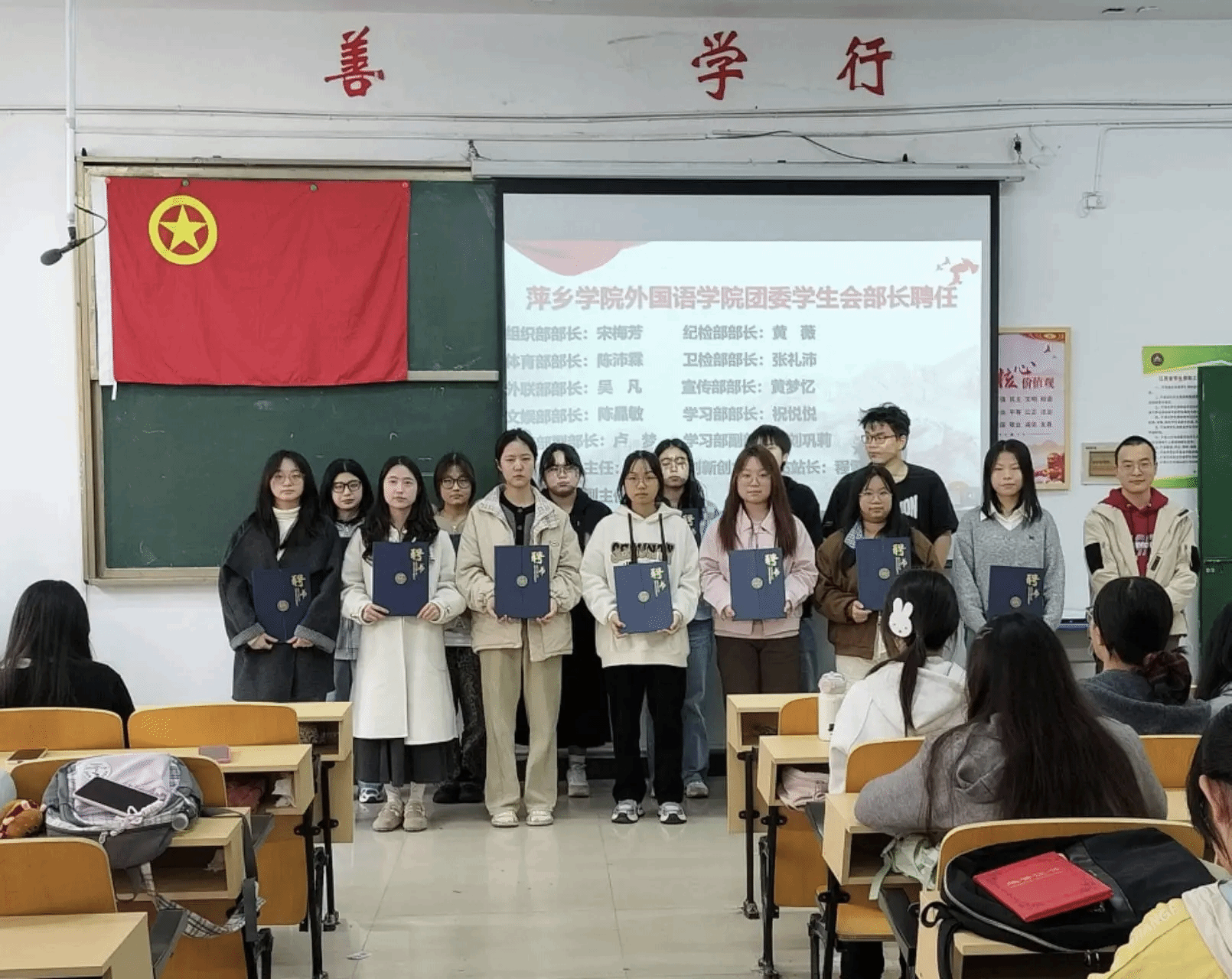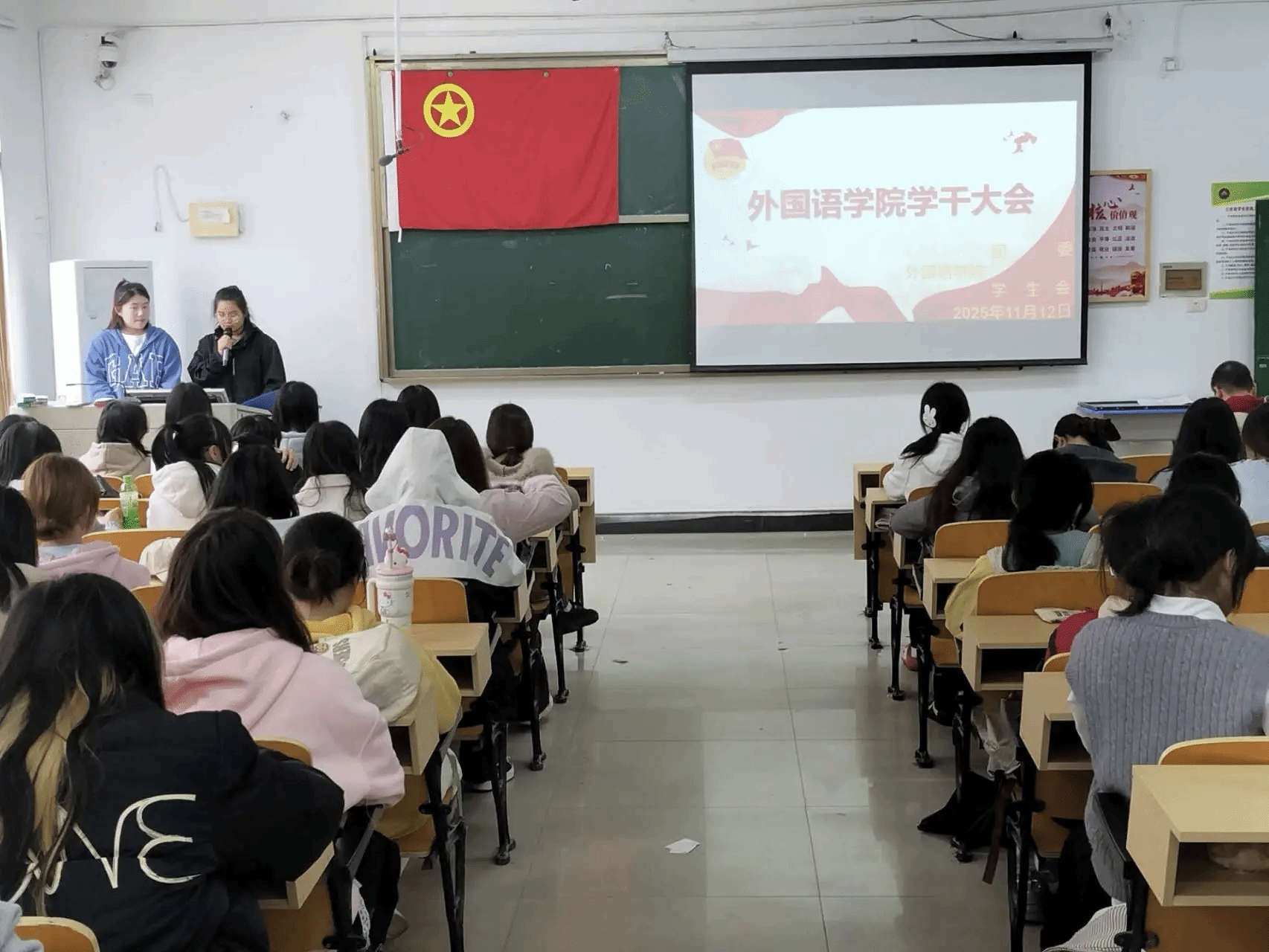 金秋送爽,弦歌不辍;青春集结,共赴新程。为进一步凝聚学生骨干力量,明确工作方向,筑牢服务根基,外国语学院于2025年11月12日12:20在英华楼3306教室召开学干大会。莅临本次会议的嘉宾有外国语学院党委书记刘佳萍老师,外国语学院团委书记冷全宝老师,外国语学院团委副书记裘佳美,外国语学院学生会副主席邹奕姿,外国语学院团委书记助理欧阳娜,办公室主任罗静雯及各部门部长,参与本次大会的人员有25级全体学干,现场氛围庄重有序且饱含青春活力,为后续学生工作的高效开展奠定了良好开端。