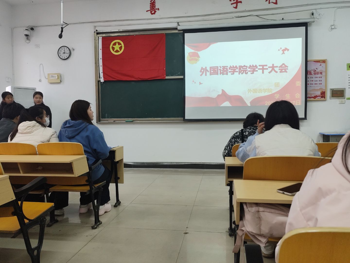 为凝聚青年力量,彰显学干担当,锻造过硬学干队伍,外国语学院学干大会于2026年3月17日12:20在英华楼3306教室顺利召开,莅临本次大会的嘉宾有外国语学院党委书记刘佳萍老师,外国语学院党委副书记曹金萍老师,外国语学院团委书记冷全宝老师,外国语学院25级辅导员何宇老师,外国语学院24级辅导员江双莲老师,外国语学院23级辅导员钟倩老师,外国语学院团委副书记张星宇,外国语学院学生会主席张藜语,外国语学院学生会副主席魏佳,外国语学院团委书记助理杨乐楠,外国语学院团委书记助理黄莉,外国语学院办公室主任柯丹妮,以及各部门部长。大会旨在进一步加强学生干部队伍建设,提升学生骨干的责任意识与服务意识。