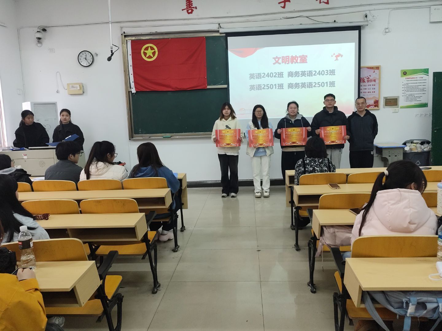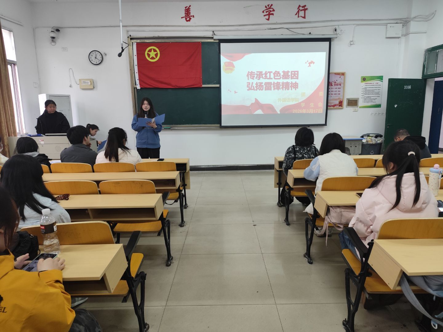 会议伊始,主持人首先为全体参会同学播放了一段弘扬雷锋精神的红色主题视频,带领大家重温雷锋事迹、感悟雷锋精神的时代内涵。视频结束后,大会正式拉开帷幕,各项议程有序推进:首先公布了办学四十周年优秀志愿者名单,对积极投身志愿服务的先进个人予以表彰;紧接着为获奖集体颁发荣誉,包括获评“文明教室”的英语2402班、商务英语2403班、英语2501班、商务英语2501班;获评“文明班级”的英语2402班、商务英语2501班、商务英语2502班;以及获评“优秀团支部”的英语2402班、英语2502班、商务英语2502班,现场掌声阵阵,氛围庄重热烈。颁奖环节结束后,进入书记讲话环节,首先是外国语学院党委副书记曹金萍老师讲话,曹书记对全体学生干部提出殷切期望,强调要以雷锋为榜样,将奉献精神、服务意识融入学风建设、校园活动、志愿服务等日常工作中,切实履行学生干部职责。随后,外国语学院党委书记刘佳萍老师发表重要讲话,勉励学生干部不忘初心使命,充分发挥模范带头作用,在学院各项核心工作中主动作为、履职尽责,为学院学生工作高质量发展贡献青春力量。