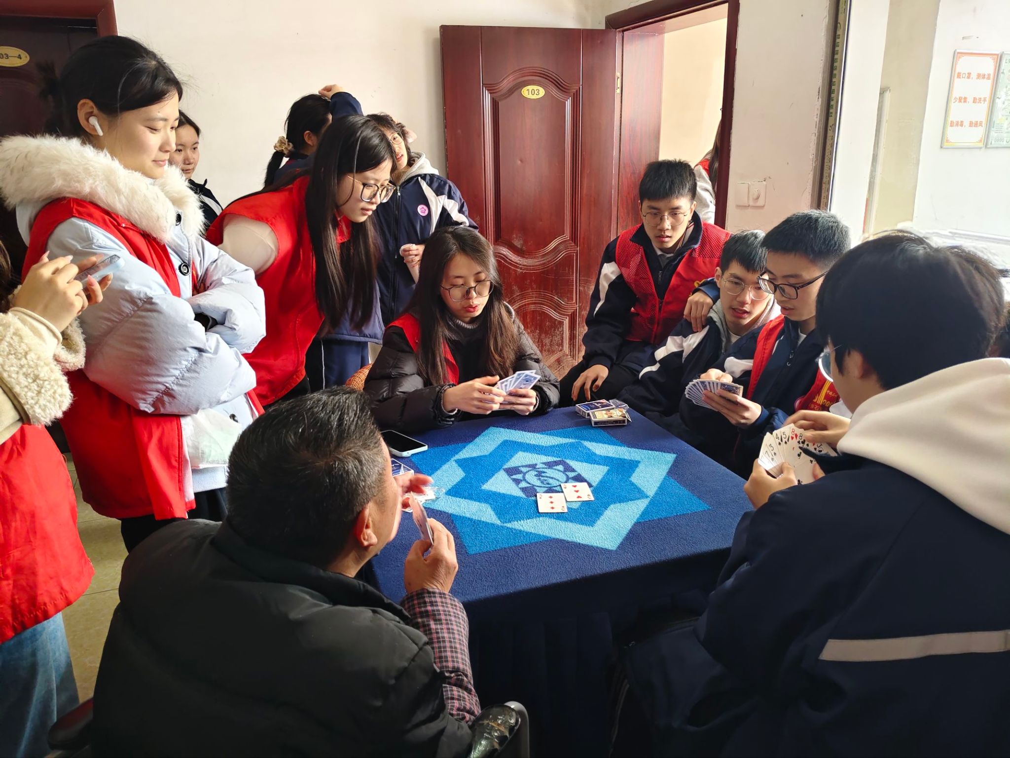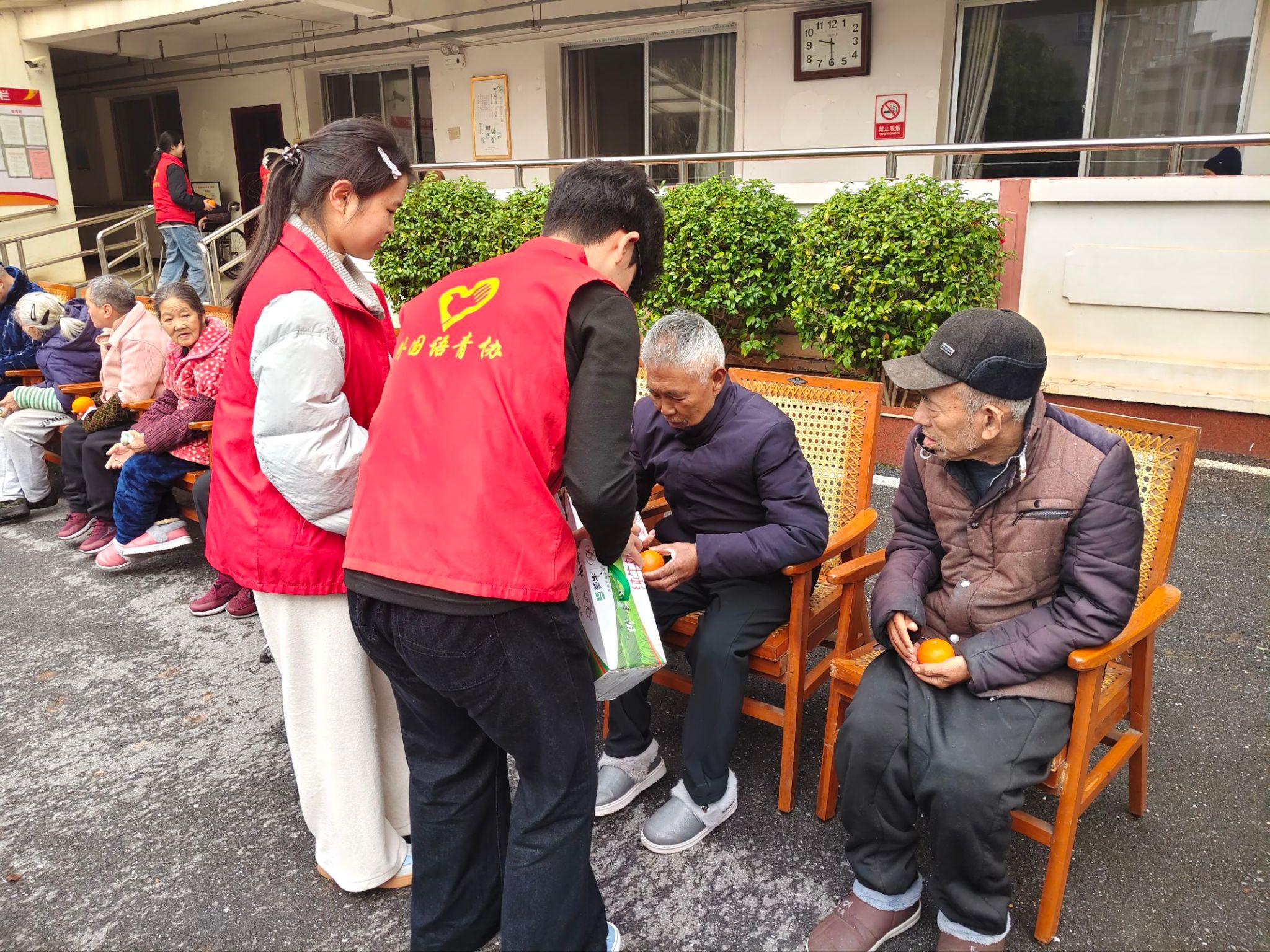 活动伊始,志愿者们携事先准备好的牛奶与水果,步行抵达安源镇敬老院。刚步入院门,便受到一位热情的老爷爷亲切迎接,现场氛围温馨融洽。随后,志愿者们将慰问物品交予敬老院负责人,并简要说明来意,院长对大家的到来表示诚挚欢迎。在互动环节中,志愿者们精心准备了丰富多彩的文艺节目。舞蹈《桃花朵朵开》和《福气要来到》活力四射,现场气氛轻松愉快;歌曲《外婆的澎湖湾》旋律悠扬,唤起了老人们的美好回忆。老人们有的轻声哼唱,有的随着节拍拍手,现场洋溢着浓浓的温情与欢乐。节目结束后,志愿者们将带来的慰问品一一送到老人手中,老人们笑容满面,连连道谢。随后,志愿者们主动投入到卫生清扫中,帮助整理院落、打扫房间,力求为老人们营造更加整洁舒适的生活环境。清扫结束后,志愿者们与老人围坐在一起,有的和老人聊家常、谈往事,有的与老人们下象棋,打扑克,现场氛围活跃,欢声笑语不断。活动尾声,大家与老人们合影留念,在彼此真诚的祝福中依依惜别,活动圆满落下帷幕。