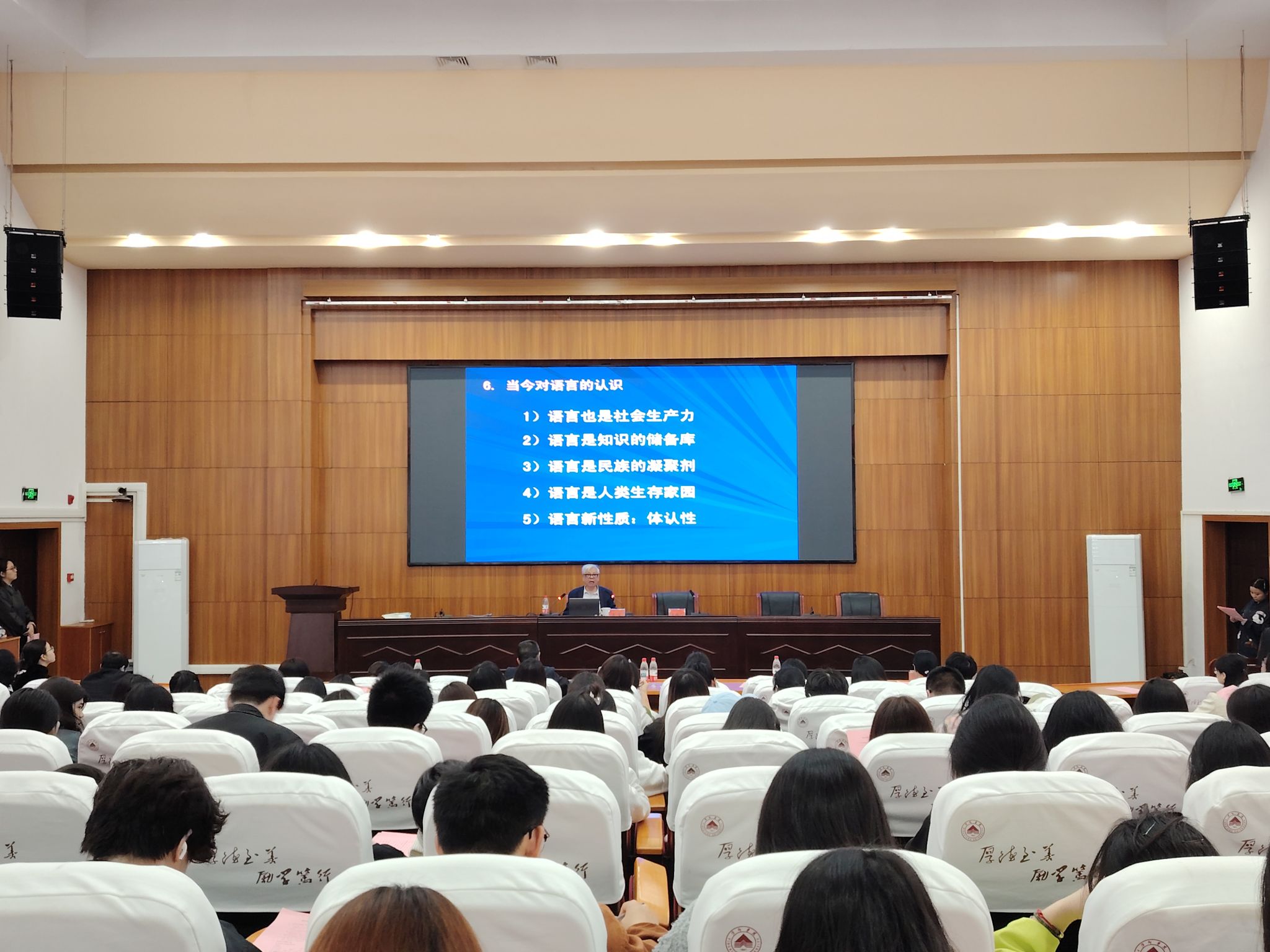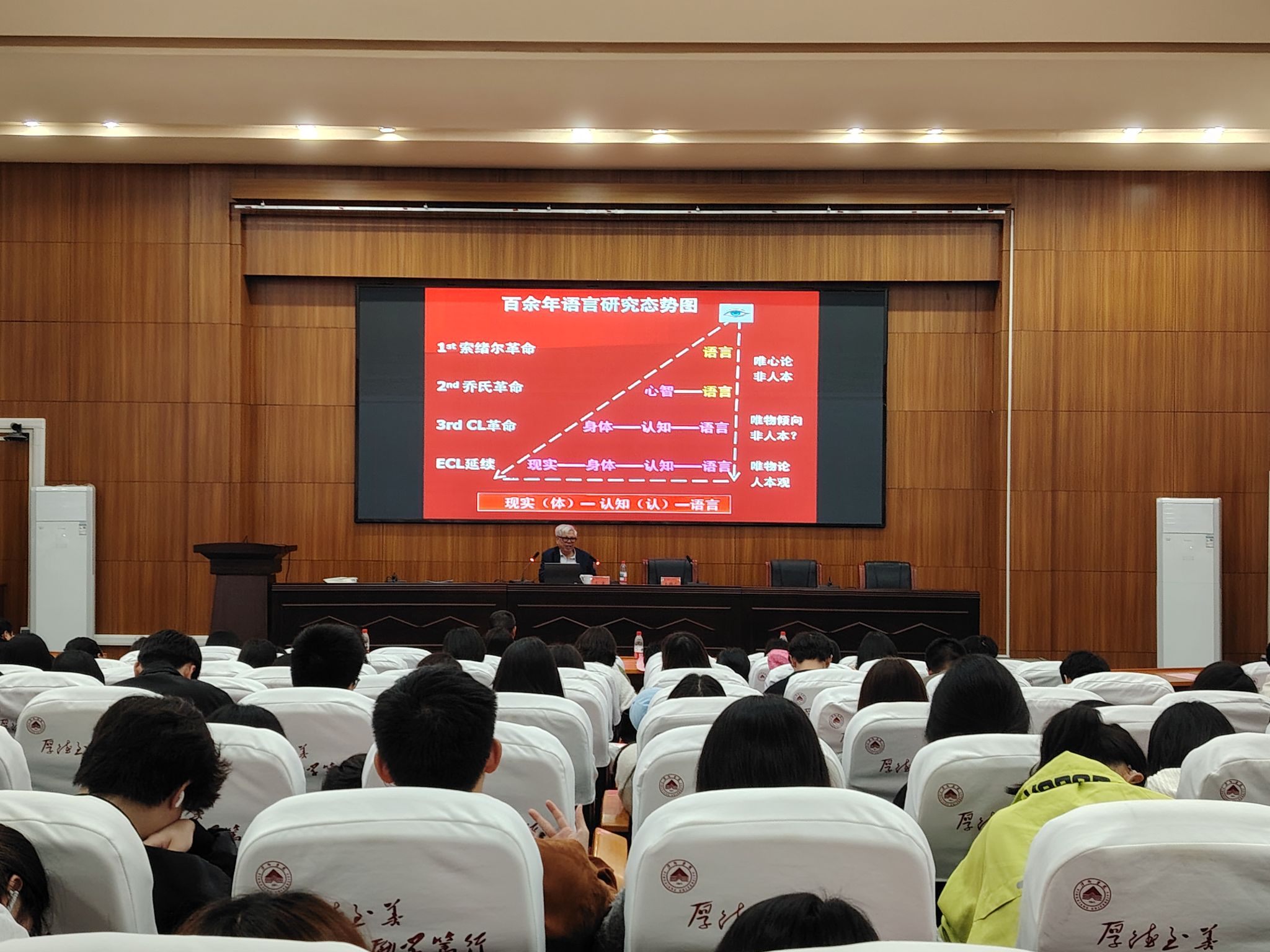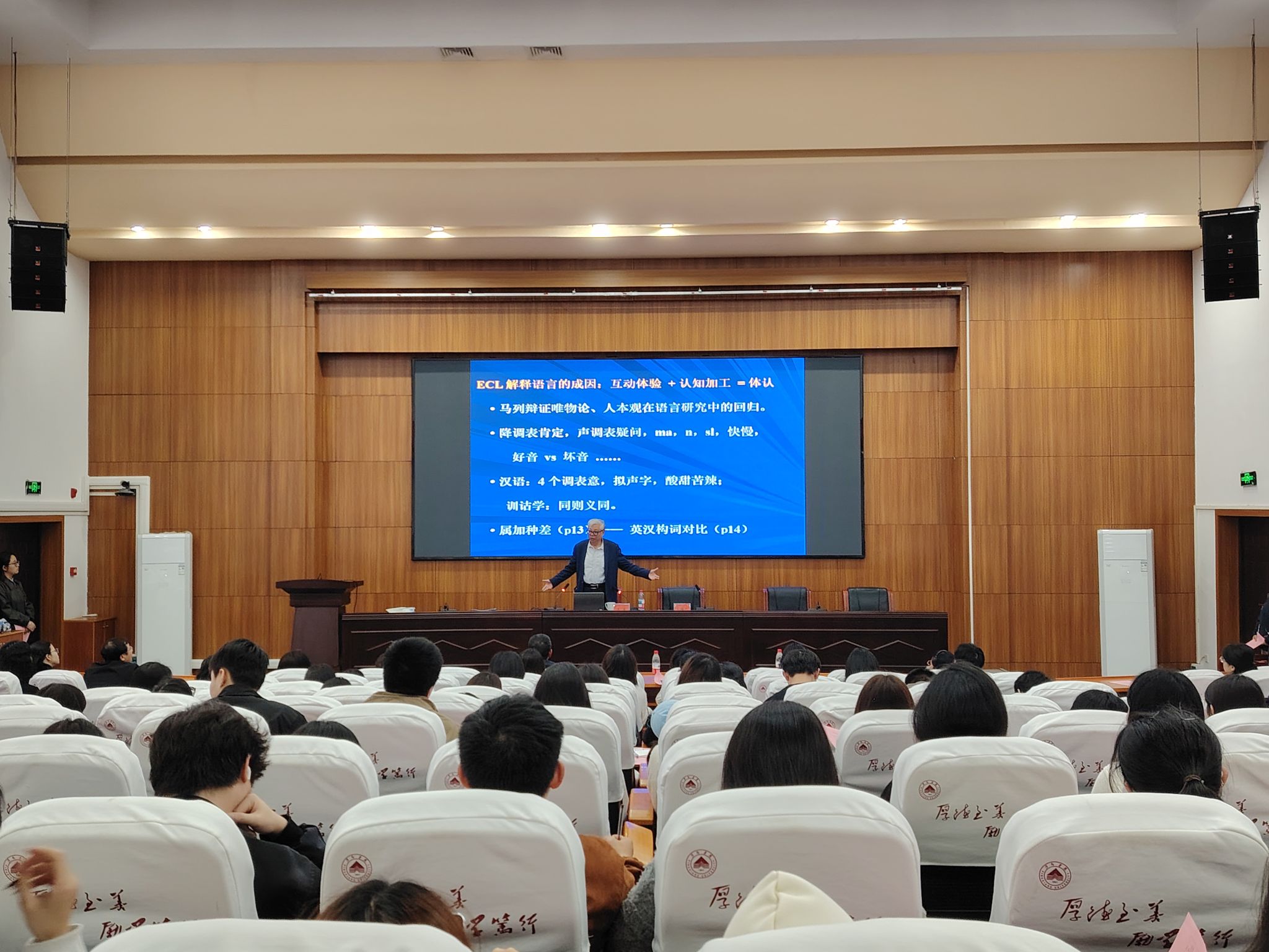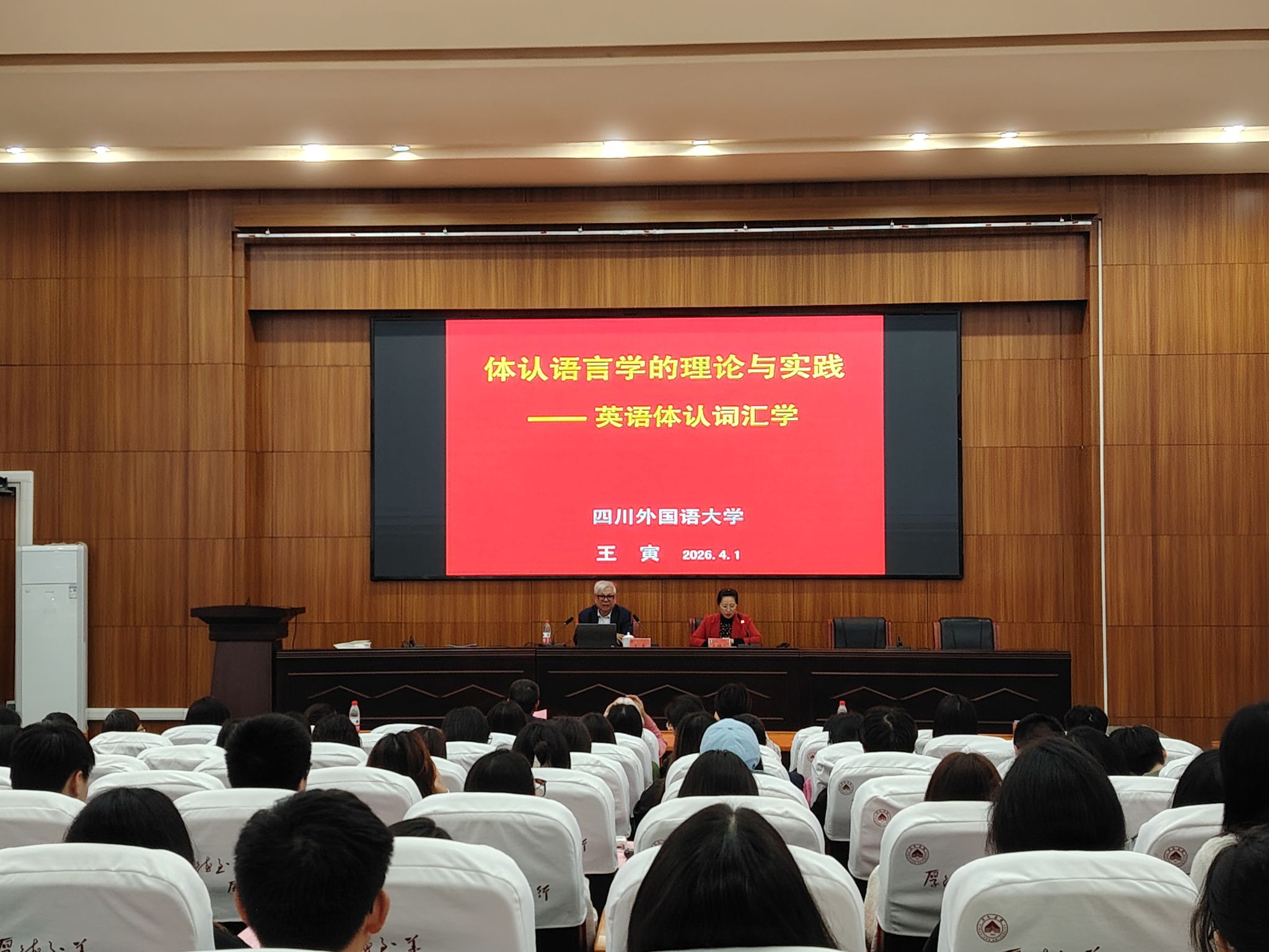 为帮助我院师生更好地理解语言学理论,提升专业认知与学术素养,2026年4月7日14:30,外国语学院于至善楼学术报告厅开展“体认语言学的理论与实践”专题讲座。本次讲座特邀四川外国语大学国家二级教授、博士生导师王寅教授担任主讲,外国语学院全体教师及商务英语专业全体同学参与活动。