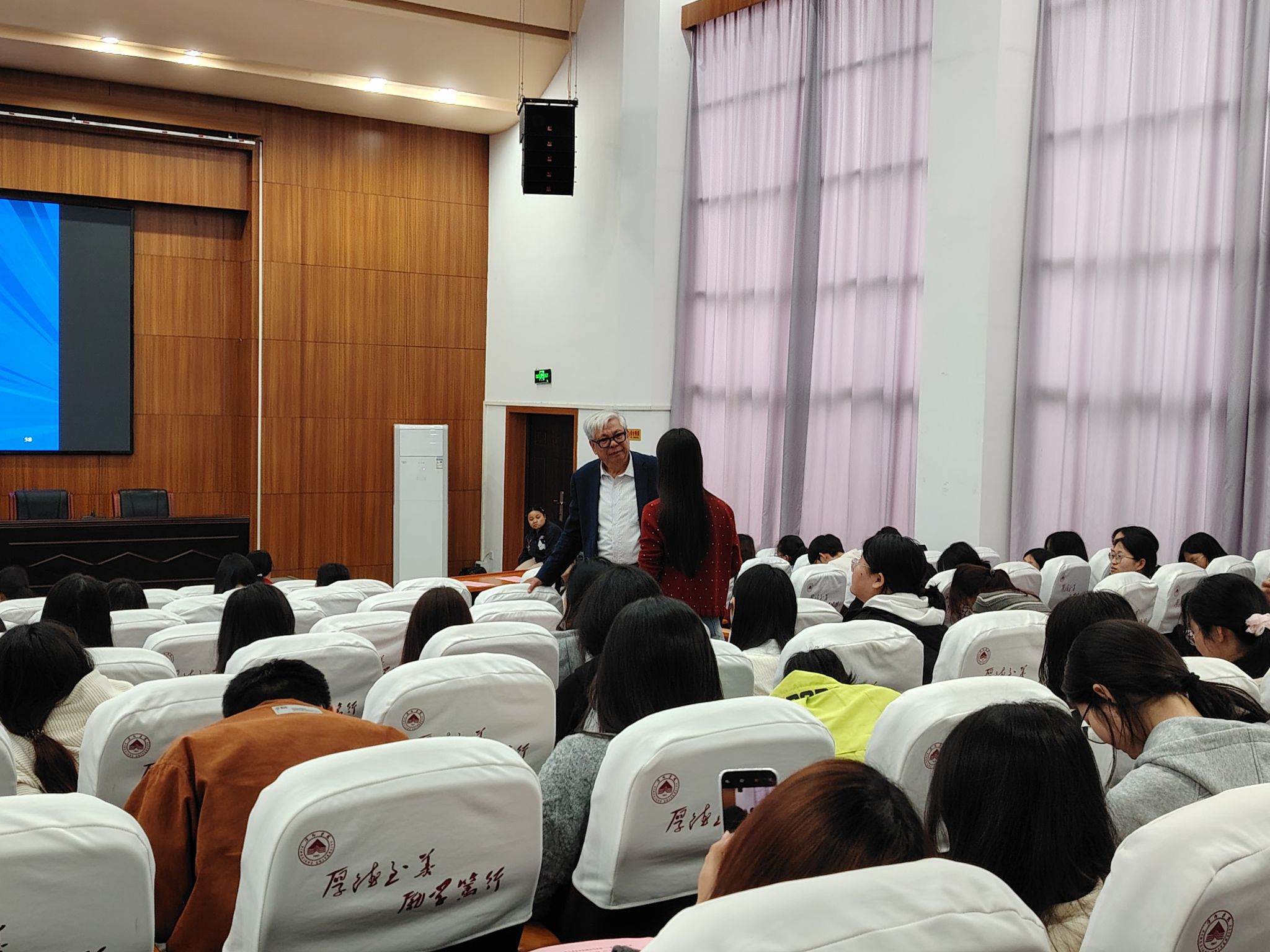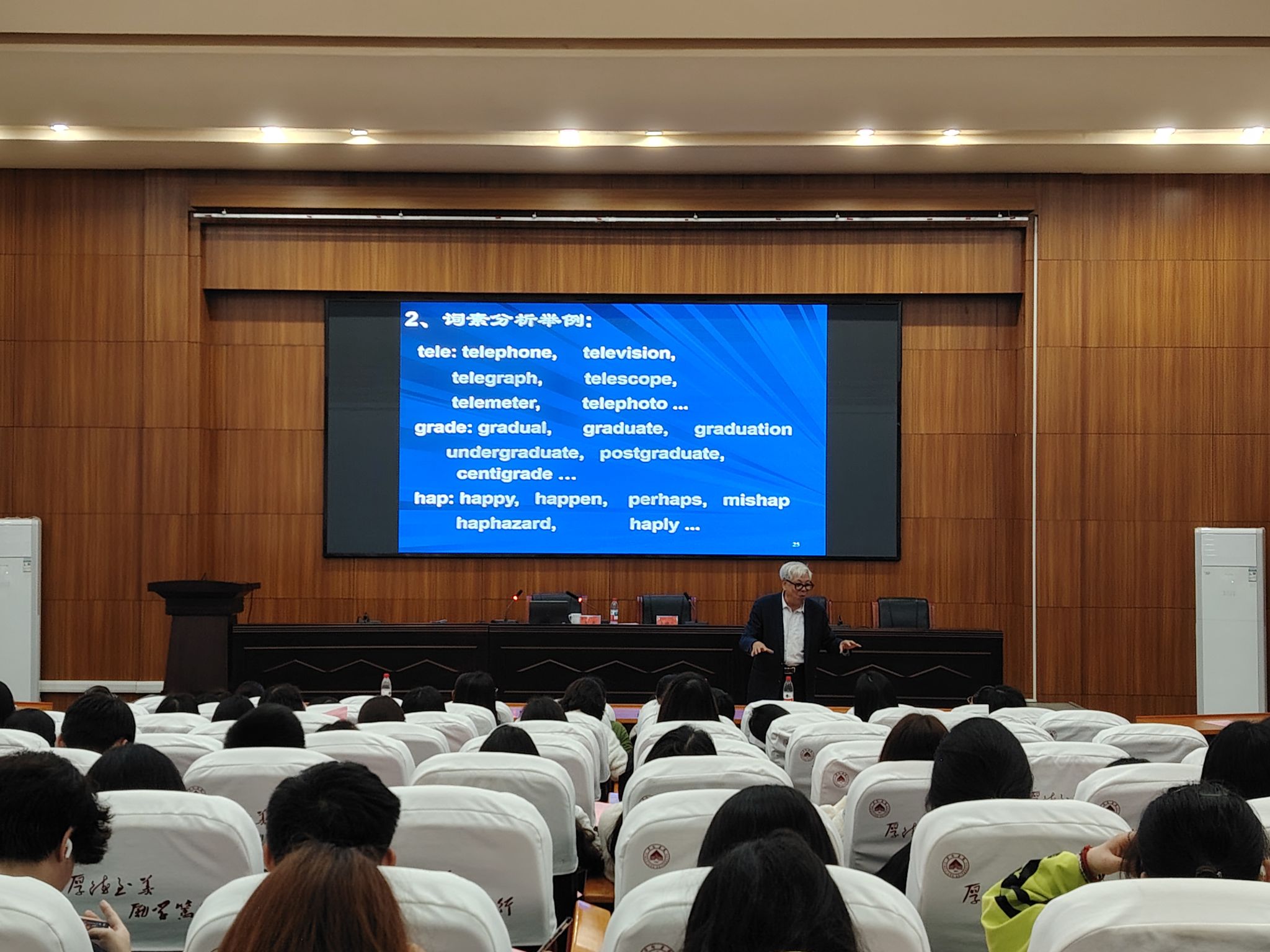 讲座伊始,外国语学院院长欧阳咏梅老师向全体师生隆重介绍王寅教授,对教授及其夫人的莅临表示热烈欢迎与诚挚感谢。介绍完毕后,欧阳院长宣布讲座正式开始。本次讲座中,王寅教授主要围绕两大核心内容展开深入分享。第一部分聚焦“为什么学习语言学”,王教授以《蒙娜丽莎的微笑》为例,从画作深意切入引出“人的价值”这一话题,再结合动物行为分析对比,点明人类与动物的本质区别在于独有的语言能力,从而凸显了语言学学习的独特意义;第二部分围绕“怎样学习语言学”展开,王教授深入讲解体认语言学的核心观点,通过汉字与英文构词的深度对比展开阐释——从汉语“单独使用的字、偏旁部首”,到英语“单词(根词)、粘着词素”的层级差异,以“人/man/anthrop-”“水/water/hydro-”等成对词汇为例,再结合“牛、猪、羊、鸡、马”等动植物相关词汇的汉英对应表达,以及“scr-、fl-、gl-”等英语词缀的语义逻辑,生动讲解体认语言学核心观点,结合英语词汇学习实例,将抽象理论与实际语言运用相结合,帮助师生直观理解理论落地方法。讲座过程中,教授还带领大家开展互动练习,让同学们现场体验理论分析的思路与技巧。讲座尾声,同学们踊跃提问,王寅教授逐一耐心解答,现场互动氛围热烈。欧阳院长在总结中表示,本次讲座既有哲学高度、理论深度,更有实践温度,充分展现了王寅教授数十年深耕语言学领域的深厚素养与学术担当,让在场师生收获满满、深受启发。