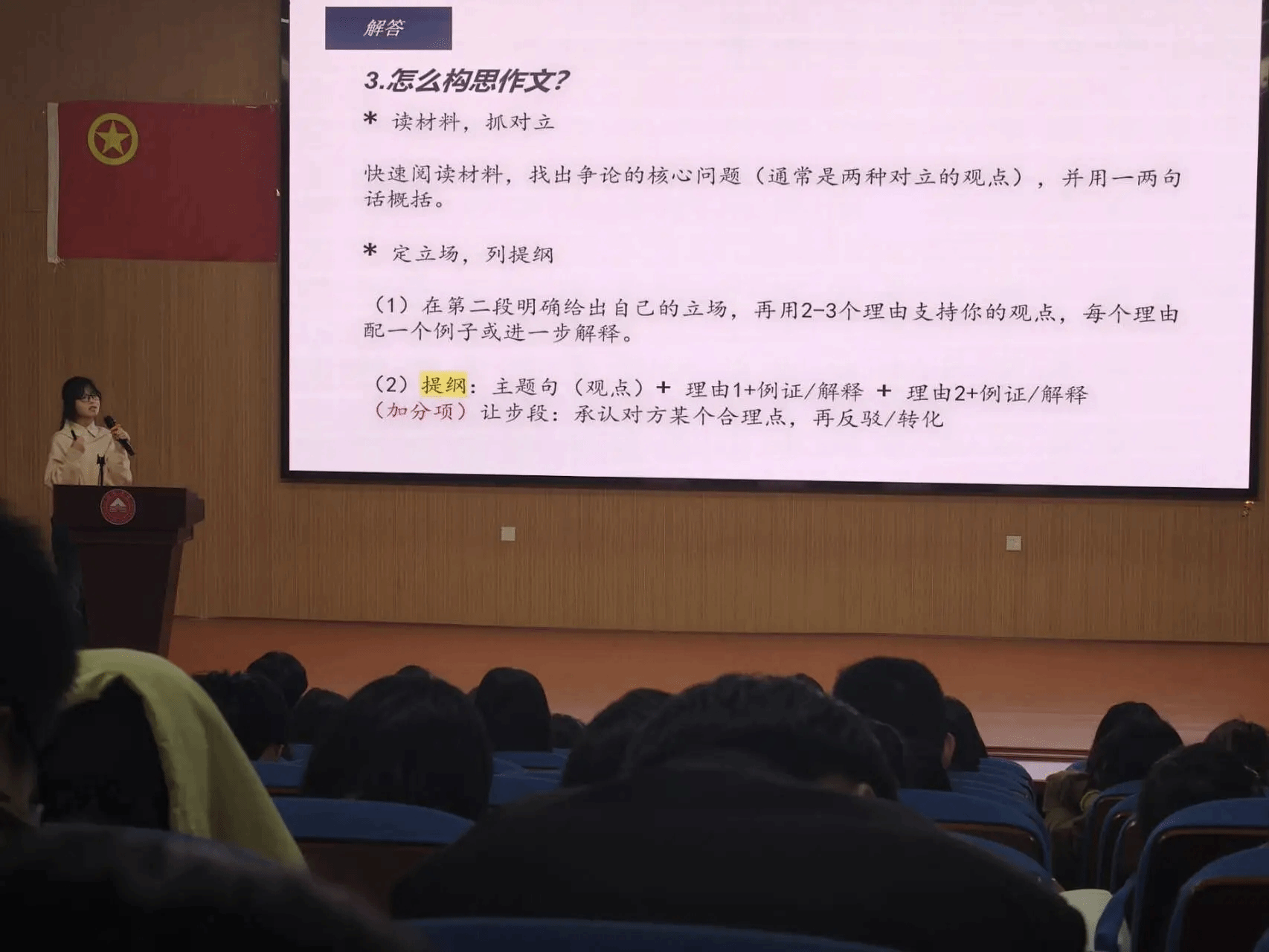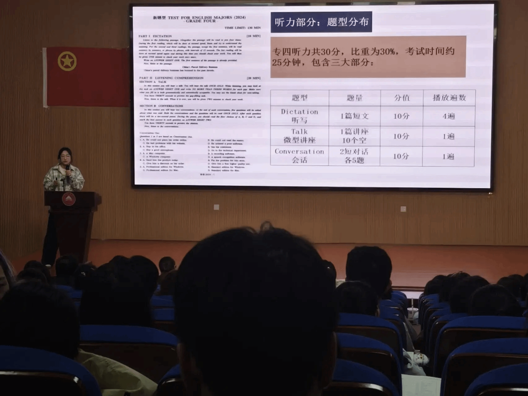 分享会伊始,首先由外国语学院副院长卓玲老师进行讲话,卓院长通过向同学们展示我院历年专业四级的通过率,肯定了老师们的责任感和同学们的踏实感,同时也讲到我们在备考期间要学会用压力去激发潜力,要科学备考,以及善于利用周围的资源,主动寻求帮助等方法。接下来由优秀学生代表上台进行专业四级经验分享。首先上台发言的是张庆玉学姐,张庆玉学姐围绕听力部分的题型、评分标准、做题步骤、听力时间规划、优质听力资源等方面进行讲解,有效加强了同学们听力的应试技巧;接下来上台分享的是陶志华学长,陶志华学长从近义词辨析题、动词词组辨析题、固定搭配题等多种题型讲解做题以及积累方法,此外学长还提到在语法练习方面要先抓大点再抓小点;然后就是由张知鱼学姐进行分享,张知鱼学姐围绕阅读理解往年考题话题分析、选择题正确选项特征等方面告诉同学们一些应试技巧;接着就是由邱晓丹学姐进行作文经验分享,邱晓丹学姐讲述了专四作文和四六级作文的区别,以及如何构思作文,作文观点如何确定,并向同学们推荐了一些相关的作文资料,帮助大家更好的备考。最后由外国语学院党委副书记曹金萍老师进行总结,曹书记叮嘱同学们,要主动养成阅读原著的习惯,坚持每日自省、及时反思,真正做到沉下心来沉浸式学习,同时也要善于借鉴学长学姐的宝贵经验,将其灵活运用到学习与备考中。最后,她向即将迎战专业四级考试的24级全体同学送上真挚祝福,祝愿大家从容应考、取得佳绩,本次活动也在温暖的期许中圆满落下帷幕。