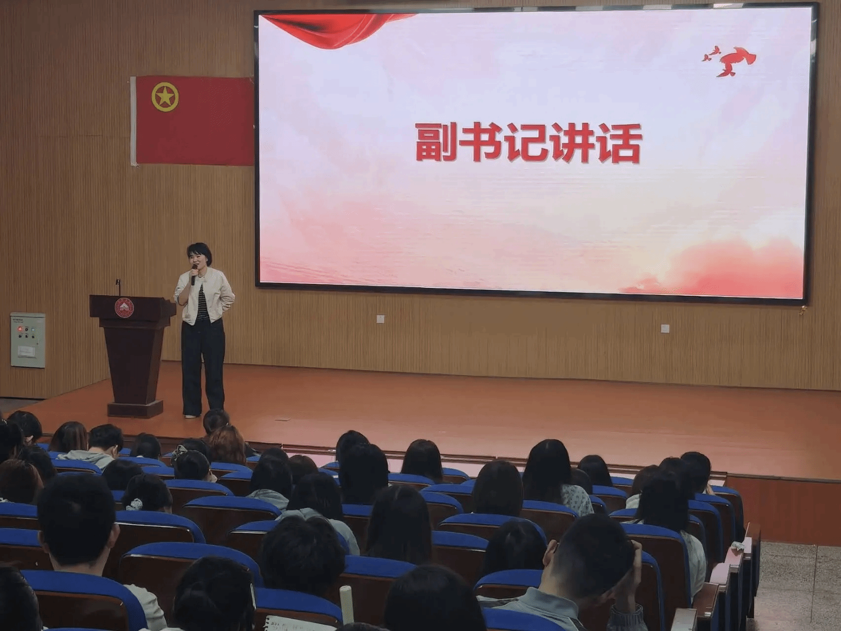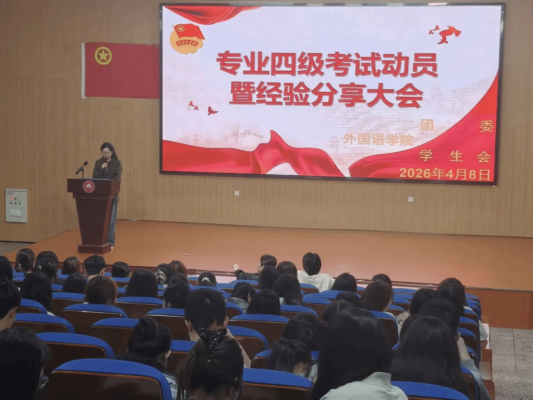 为帮助24级全体同学高效备考,培养其逻辑思维和语言表达能力,增强应试信心,外国语学院于2026年4月8日19:10在跬步楼1115教室举办“专业四级考试动员暨经验分享大会”。莅临本次活动的嘉宾有外国语学院副院长卓玲老师,外国语学院党委副书记曹金萍老师,以及为我们分享宝贵经验的英语2301班陶志华学长,英语2302班张庆玉学姐,商务英语2301班张知鱼学姐,商务英语2302班邱晓丹学姐。