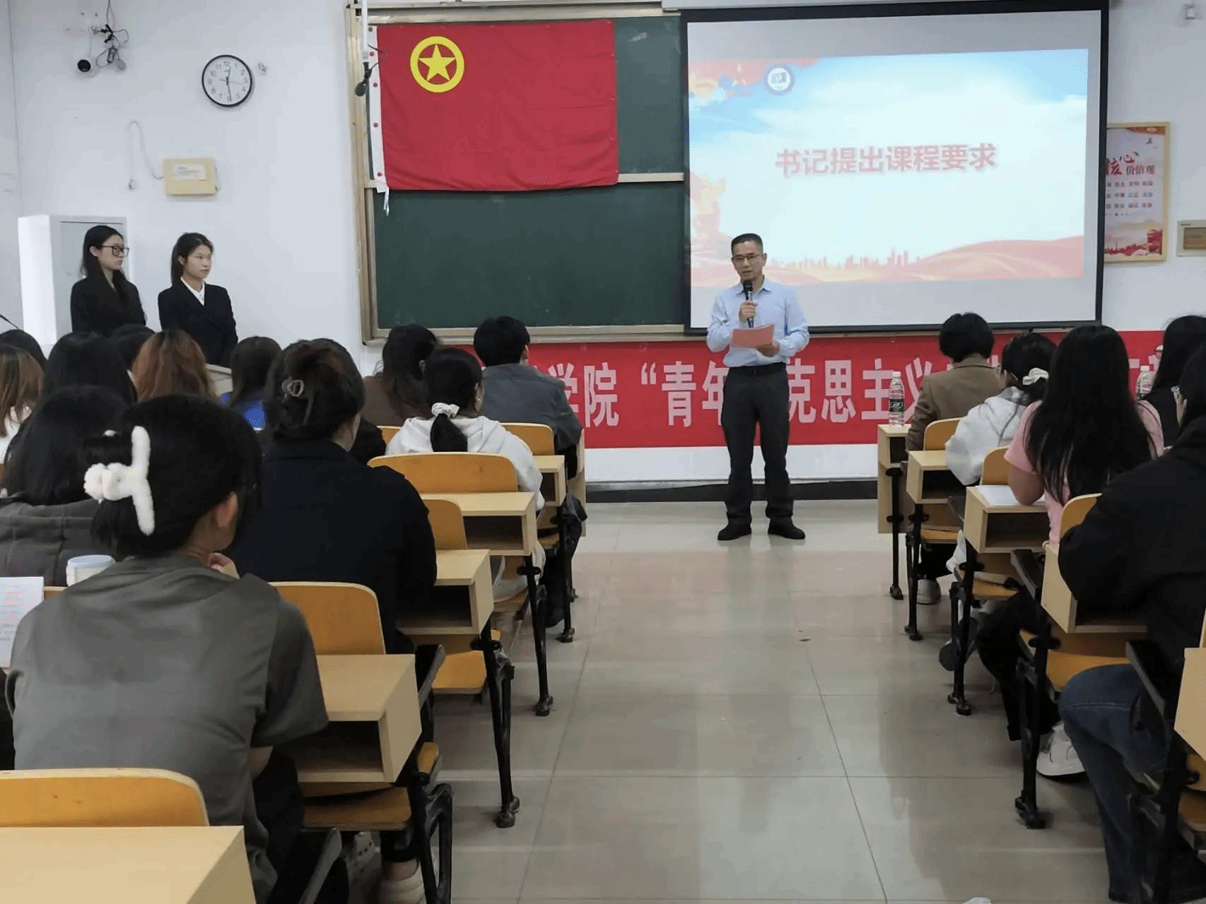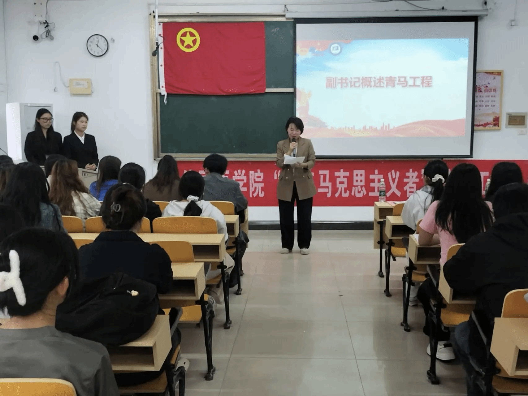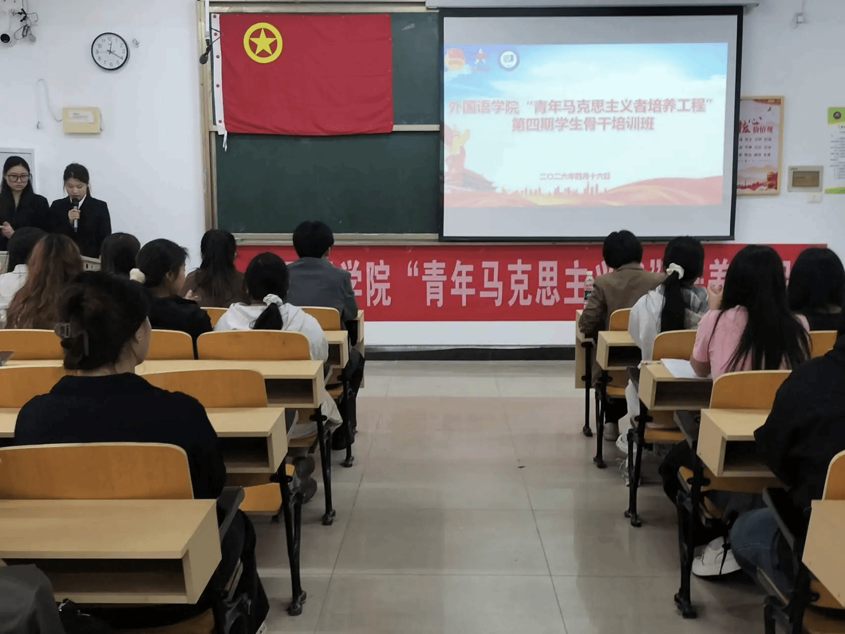 为进一步引导青年学生坚定理想信念,深学细悟理论知识,外国语学院于2026年4月16日中午12:20在英华楼3306教室隆重举行“青年马克思主义者培养工程”第四期学生骨干培训班开班仪式。莅临本次开班仪式的嘉宾有外国语学院党委书记刘佳萍老师,外国语学院党委副书记曹金萍老师,外国语学院团委书记冷全宝老师,外国语学院24级辅导员江双莲老师,外国语学院王卫民老师以及青马工程的全体学员。