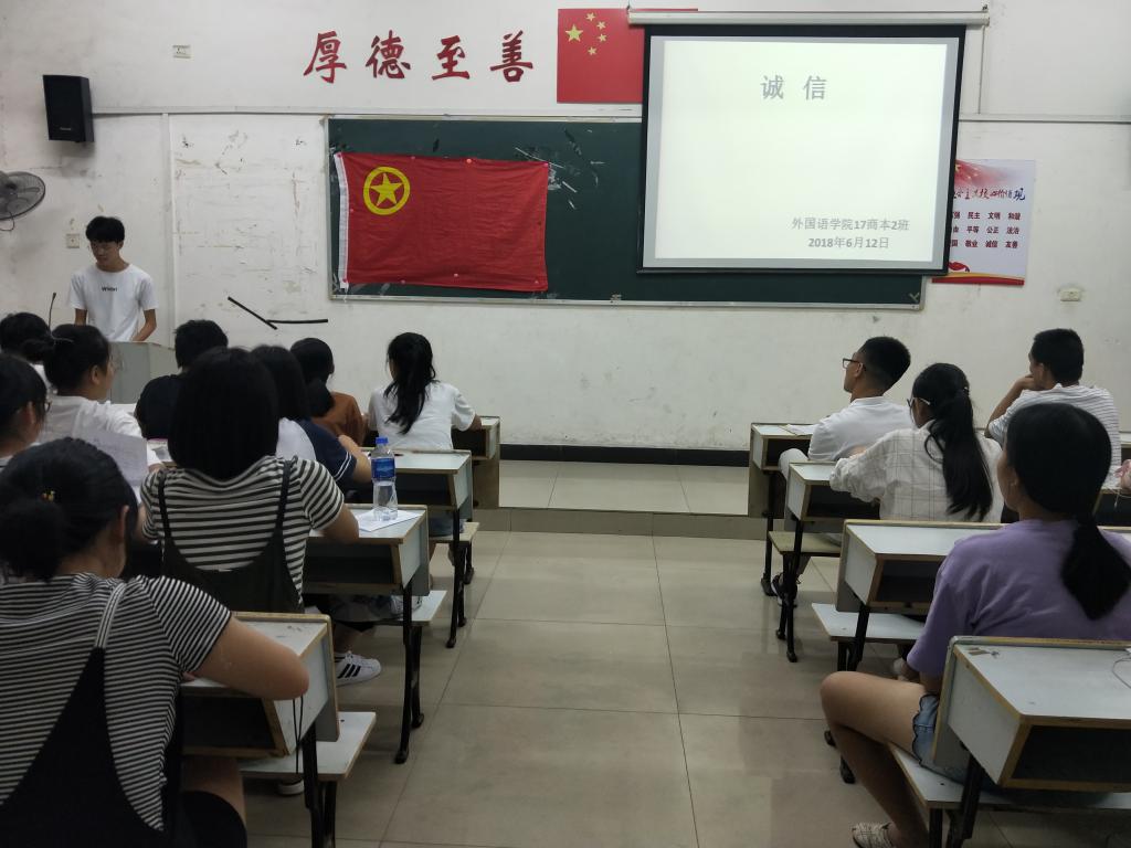 2018年6月15日早上7:40,外国语学院17英本2班在英华楼3337召开“诚信考试”主题班会,主持本次班会的是班长,参加此次班会的是17英本二班全体成员。